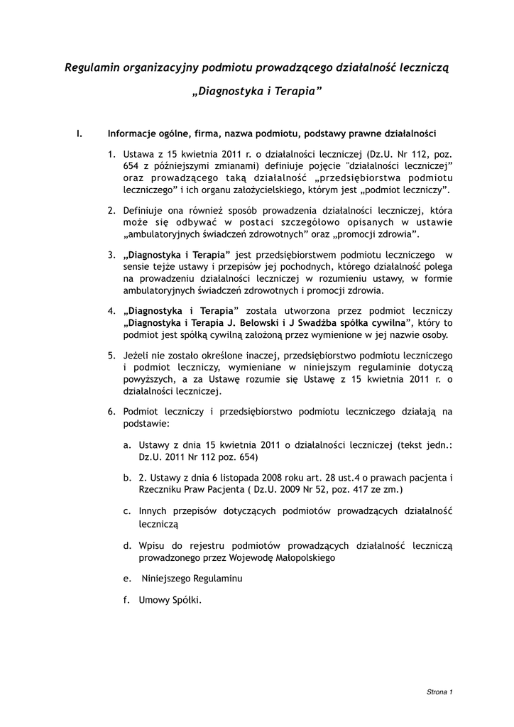 Regulamin organizacyjny podmiotu prowadzącego działalność leczniczą „Diagnostyka i Terapia” I. Informacje ogólne, firma, nazwa podmiotu, podstawy prawne działalności 1. Ustawa z 15 kwietnia 2011 r. o działalności leczniczej (Dz.U. Nr 112, poz. 654 z późniejszymi zmianami) definiuje pojęcie "działalności leczniczej” oraz prowadzącego taką działalność „przedsiębiorstwa podmiotu leczniczego” i ich organu założycielskiego, którym jest „podmiot leczniczy”. 2. Definiuje ona również sposób prowadzenia działalności leczniczej, która może się odbywać w postaci szczegółowo opisanych w ustawie „ambulatoryjnych świadczeń zdrowotnych” oraz „promocji zdrowia”. 3. „Diagnostyka i Terapia” jest przedsiębiorstwem podmiotu leczniczego w sensie tejże ustawy i przepisów jej pochodnych, którego działalność polega na prowadzeniu działalności leczniczej w rozumieniu ustawy, w formie ambulatoryjnych świadczeń zdrowotnych i promocji zdrowia. 4. „Diagnostyka i Terapia” została utworzona przez podmiot leczniczy „Diagnostyka i Terapia J. Belowski i J Swadźba spółka cywilna”, który to podmiot jest spółką cywilną założoną przez wymienione w jej nazwie osoby. 5. Jeżeli nie zostało określone inaczej, przedsiębiorstwo podmiotu leczniczego i podmiot leczniczy, wymieniane w niniejszym regulaminie dotyczą powyższych, a za Ustawę rozumie się Ustawę z 15 kwietnia 2011 r. o działalności leczniczej. 6. Podmiot leczniczy i przedsiębiorstwo podmiotu leczniczego działają na podstawie: a. Ustawy z dnia 15 kwietnia 2011 o działalności leczniczej (tekst jedn.: Dz.U. 2011 Nr 112 poz. 654) b. 2. Ustawy z dnia 6 listopada 2008 roku art. 28 ust.4 o prawach pacjenta i Rzeczniku Praw Pacjenta ( Dz.U. 2009 Nr 52, poz. 417 ze zm.) c. Innych przepisów dotyczących podmiotów prowadzących działalność leczniczą d. Wpisu do rejestru podmiotów prowadzących działalność leczniczą prowadzonego przez Wojewodę Małopolskiego e. Niniejszego Regulaminu f. Umowy Spółki. Strona 1 II. Cele i zadania podmiotu leczniczego 1. Celem podmiotu leczniczego, jak to zostało już powiedziane, jest prowadzenie działalności leczniczej zgodnej z zapisami ustawy, w formie ambulatoryjnych świadczeń zdrowotnych i promocji zdrowia, w szczególności: a. udzielanie świadczeń zdrowotnych zgodnie ze specjalizacją danej komórki organizacyjnej oraz potrzebami zdrowotnymi pacjentów b. zapewnienie fachowej opieki lekarskiej i pielęgniarskiej, zgodnej z przyjętymi standardami postępowania, sprzyjającej sprawnemu przebiegowi rozpoznawania oraz leczenia chorób u przyjmowanych pacjentów c. orzekanie o stanie zdrowia pacjentów na podstawie obowiązujących przepisów d. realizacja zadań z zakresu promocji zdrowia, prowadzenie szkoleń w jednostce III. Rodzaj działalności leczniczej oraz zakres udzielanych świadczeń zdrowotnych 1. przedsiębiorstwo podmiotu leczniczego prowadzi działalność w zakresie praktyki lekarskiej specjalistycznej (kod PKD 86.22.Z Praktyka lekarska specjalistyczna) w formie zdefiniowanych w ustawie ambulatoryjnych świadczeń zdrowotnych 2. Zakres udzielanych świadczeń zdrowotnych obejmuje: a. Świadczenia specjalistycznej opieki zdrowotnej zgodnej ze specjalnościami poszczególnych komórek organizacyjnych b. Badania diagnostyczne wykonywane w celu rozpoznania stanu zdrowia i ustalenia dalszego postępowania leczniczego, zgodne ze specjalnościami komórek organizacyjnych IV. Struktura organizacyjna przedsiębiorstwa podmiotu leczniczego 1. W skład przedsiębiorstwa podmiotu leczniczego wchodzi następująca jednostka organizacyjna: a) Przychodnia Specjalistyczna o kodzie resortowym 01 2. W skład jednostki organizacyjnej Przychodnia Specjalistyczna wchodzą następujące komórki organizacyjne: a) Poradnia Chorób Wewnętrznych, o kodzie resortowym 001 b) Poradnia Endokrynologiczna, o kodzie resortowym 002 Strona 2 c) Poradnia Chorób Tarczycy, o kodzie resortowym 003 d) Pracownia Ultrasonografii Diagnostycznej, Zabiegowej i Biopsji Tarczycy, kodzie resortowym 004 V. o Miejsce udzielania świadczeń zdrowotnych Siedzibą przedsiębiorstwa podmiotu leczniczego jest budynek „Nautilus” posiadający adres: 31-861 Kraków ul prof. Michała Życzkowskiego nr 16. VI. Przebieg procesu udzielania świadczeń zdrowotnych w jednostkach i komórkach organizacyjnych podmiotu leczniczego 1. Świadczenia zdrowotne udzielane są wyłącznie przez pracowników medycznych, który posiadają odpowiednie kwalifikacje do wykonywania świadczeń, potwierdzone dyplomami, certyfikatami i spełniających odpowiednie wymagania zdrowotne. 2. Udzielanie świadczeń jest poprzedzane rejestracją w formie telefonicznej, poprzez formularz internetowy, lub bezpośrednio w siedzibie przedsiębiorstwa podmiotu leczniczego. 3. W pierwszej kolejności i bez rejestracji przyjmowani są pacjenci zgłaszający się w stanie wymagającym natychmiastowego udzielenia świadczenia zdrowotnego, oraz pacjenci ustawowo uprawnieni do takiej formy udzielania świadczeń. 4. Po zarejestrowaniu się do lekarza pacjent w umówionym dniu i o określonej godzinie zgłasza się do przyjęcia we wskazanym gabinecie lekarskim. 8. Udzielanie świadczenia polega na badaniu podmiotowym, przedmiotowym, analizie badań dodatkowych, wykonywaniu zabiegów diagnostycznych i leczniczych, przepisywaniu leków, informowaniu o zalecanej diecie i innych zasadach zdrowego trybu życia, wydawaniu orzeczeń o stanie zdrowia, informowaniu o zasadach profilaktyki zdrowotnej, innych działaniach służących zachowaniu zdrowia. 9. W trakcie udzielania świadczenia zdrowotnego pacjent ma prawo do uzyskania niezbędnych wyjaśnień, dotyczących postawionej diagnozy, a także zaproponowanego leczenia. 9. Na każdym etapie udzielania świadczenia zdrowotnego pacjent ma prawo do złożenia skargi/zażalenia na zachowanie lub czynności personelu przedsiębiorstwa podmiotu leczniczego