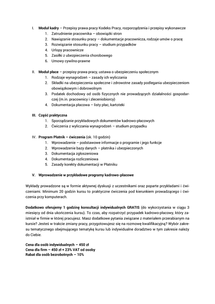 I. Moduł kadry – Przepisy prawa pracy Kodeks Pracy, rozporządzenia i przepisy wykonawcze 1. Zatrudnienie pracownika – obowiązki stron 2. Nawiązanie stosunku pracy – dokumentacje pracownicza, rodzaje umów o pracę 3. Rozwiązanie stosunku pracy – studium przypadków 4. Urlopy pracownicze 5. Zasiłki z ubezpieczenia chorobowego 6. Umowy cywilno-prawne II. Moduł płace – przepisy prawa pracy, ustawa o ubezpieczeniu społecznym 1. Rodzaje wynagrodzeń – zasady ich wyliczania 2. Składki na ubezpieczenia społeczne i zdrowotne zasady podlegania ubezpieczeniom obowiązkowym i dobrowolnym 3. Podatek dochodowy od osób fizycznych nie prowadzących działalności gospodarczej (m.in. pracownicy i zleceniobiorcy) 4. Dokumentacja płacowa – listy płac, kartoteki III. Część praktyczna 1. Sporządzanie przykładowych dokumentów kadrowo-płacowych 2. Ćwiczenia z wyliczania wynagrodzeń – studium przypadku IV. Program Płatnik – ćwiczenia (ok. 10 godzin) 1. Wprowadzenie – podstawowe informacje o programie i jego funkcje 2. Wprowadzenie bazy danych – płatnika i ubezpieczonych 3. Dokumentacja zgłoszeniowa 4. Dokumentacja rozliczeniowa 5. Zasady korekty dokumentacji w Płatniku V. Wprowadzenie w przykładowe programy kadrowo-płacowe Wykłady prowadzone są w formie aktywnej dyskusji z uczestnikami oraz poparte przykładami i ćwiczeniami. Minimum 20 godzin kursu to praktyczne ćwiczenia pod kierunkiem prowadzącego i ćwiczenia przy komputerach. Dodatkowo oferujemy 1 godzinę konsultacji indywidualnych GRATIS (do wykorzystania w ciągu 3 miesięcy od dnia ukończenia kursu). To czas, aby rozpatrzyć przypadek kadrowo-płacowy, który zaistniał w firmie w której pracujesz. Masz dodatkowe pytania związane z materiałem przerabianym na kursie? Jesteś w trakcie zmiany pracy, przygotowujesz się na rozmowę kwalifikacyjną? Wybór zakresu tematycznego obejmującego tematykę kursu lub indywidualne doradztwo w tym zakresie należy do Ciebie. Cena dla osób indywidualnych – 450 zł Cena dla firm – 450 zł + 23% VAT od osoby Rabat dla osób bezrobotnych – 10%