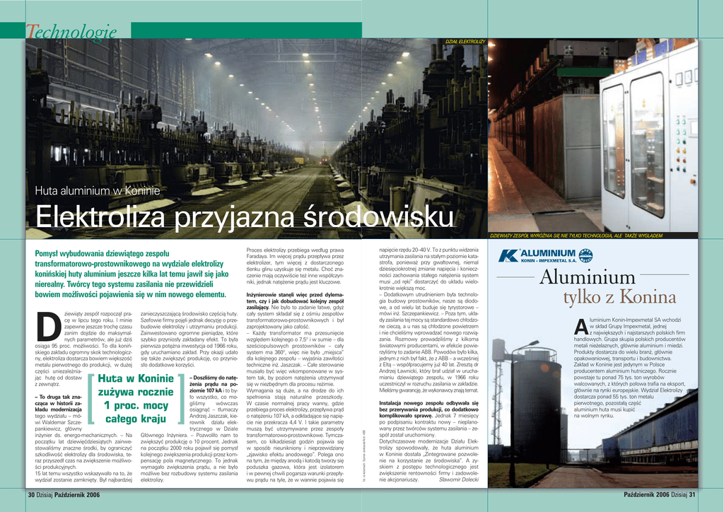 Technologie DZIAŁ ELEKTROLIZY Huta aluminium w Koninie Elektroliza przyjazna środowisku DZIEWIĄTY ZESPÓŁ WYRÓŻNIA SIĘ NIE TYLKO TECHNOLOGIĄ, ALE TAKŻE WYGLĄDEM ziewiàty zespó∏ rozpoczà∏ prac´ w lipcu tego roku. I minie zapewne jeszcze troch´ czasu zanim dojdzie do maksymalnych parametrów, ale ju˝ dziÊ osiàga 95 proc. mo˝liwoÊci. To dla koniƒskiego zak∏adu ogromny skok technologiczny, elektroliza dostarcza bowiem wi´kszoÊç metalu pierwotnego do produkcji, w du˝ej cz´Êci uniezale˝niajàc hut´ od dostaw z zewnàtrz. D zanieczyszczajàcà Êrodowisko cz´Êcià huty. Szefowie firmy poj´li jednak decyzj´ o przebudowie elektrolizy i utrzymaniu produkcji. Zainwestowano ogromne pieniàdze, które szybko przynios∏y zak∏adany efekt. To by∏a pierwsza pot´˝na inwestycja od 1966 roku, gdy uruchamiano zak∏ad. Przy okazji uda∏o si´ tak˝e zwi´kszyç produkcj´, co przynios∏o dodatkowe korzyÊci. Huta w Koninie zu˝ywa rocznie 1 proc. mocy ca∏ego kraju – To druga tak znacząca w historii zakładu modernizacja tego wydzia∏u – mówi Waldemar Szczepankiewicz, g∏ówny in˝ynier ds. energo-mechanicznych. – Na poczàtku lat dziewi´çdziesiàtych zainwestowaliÊmy znaczne Êrodki, by ograniczyç szkodliwoÊç elektrolizy dla Êrodowiska, teraz przyszed∏ czas na zwi´kszenie mo˝liwoÊci produkcyjnych. 15 lat temu wszystko wskazywa∏o na to, ˝e wydzia∏ zostanie zamkni´ty. By∏ najbardziej 30 Dzisiaj Paêdziernik 2006 – Doszliśmy do natężenia prądu na poziomie 107 kA i to by∏o wszystko, co mogliÊmy wówczas osiàgnàç – t∏umaczy Andrzej Jaszczak, kierownik dzia∏u elektrycznego w Dziale G∏ównego In˝yniera. – Pozwoli∏o nam to zwi´kszyç produkcj´ o 10 procent. Jednak na poczàtku 2000 roku pojawi∏ si´ pomys∏ kolejnego zwi´kszenia produkcji przez kompensacj´ pola magnetycznego. To jednak wymaga∏o zwi´kszenia pràdu, a nie by∏o mo˝liwe bez rozbudowy systemu zasilania elektrolizy. napi´cie rz´du 20–40 V. To z punktu widzenia utrzymania zasilania na sta∏ym poziomie katastrofa, poniewa˝ przy gwa∏townej, niemal dziesi´ciokrotnej zmianie napi´cia i koniecznoÊci zachowania sta∏ego nat´˝enia system musi „od r´ki” dostarczyç do uk∏adu wielokrotnie wi´kszà moc. – Dodatkowym utrudnieniem by∏a technologia budowy prostowników, nasze sà diodowe, a od wielu lat buduje si´ tyrystorowe – mówi in˝. Szczepankiewicz. – Poza tym, uk∏ady zasilania tej mocy sà standardowo ch∏odzone cieczà, a u nas sà ch∏odzone powietrzem i nie chcieliÊmy wprowadzaç nowego rozwiàzania. Rozmowy prowadziliÊmy z kilkoma Êwiatowymi producentami, w efekcie powierzyliÊmy to zadanie ABB. Powodów by∏o kilka, jednym z nich by∏ fakt, ˝e z ABB – a wczeÊniej z Eltà – wspó∏pracujemy ju˝ 40 lat. Zresztà dr Andrzej ¸awnicki, który bra∏ udzia∏ w uruchamianiu dziewiàtego zespo∏u, w 1966 roku uczestniczy∏ w rozruchu zasilania w zak∏adzie. MieliÊmy gwarancj´, ˝e wykonawcy znajà temat. Proces elektrolizy przebiega wed∏ug prawa Faradaya. Im wi´cej pràdu przep∏ywa przez elektrolizer, tym wi´cej z dostarczonego tlenku glinu uzyskuje si´ metalu. Choç znaczenie majà oczywiÊcie te˝ inne wspó∏czynniki, jednak nat´˝enie pràdu jest kluczowe. Inżynierowie stanęli więc przed dylematem, czy i jak dobudować kolejny zespół zasilający. Nie by∏o to zadanie ∏atwe, gdy˝ ca∏y system sk∏ada∏ si´ z oÊmiu zespo∏ów transformatorowo-prostownikowych i by∏ zaprojektowany jako ca∏oÊç. – Ka˝dy transformator ma przesuni´cie wzgl´dem kolejnego o 7,5O i w sumie – dla szeÊciopulsowych prostowników – ca∏y system ma 360O, wi´c nie by∏o „miejsca” dla kolejnego zespo∏u – wyjaÊnia zawi∏oÊci techniczne in˝. Jaszczak. – Ca∏e sterowanie musia∏o byç wi´c wkomponowane w system tak, by poziom nat´˝enia utrzymywa∏ si´ w niezb´dnym dla procesu re˝imie. Wymagania sà du˝e, a na drodze do ich spe∏nienia stajà naturalne przeszkody. W czasie normalnej pracy wanny, gdzie przebiega proces elektrolizy, przep∏ywa pràd o nat´˝eniu 107 kA, a odk∏adajàce si´ napi´cie nie przekracza 4,4 V. I takie parametry muszà byç utrzymywane przez zespo∏y transformatorowo-prostownikowe. Tymczasem, co kilkadziesiàt godzin pojawia si´ w sposób nieunikniony i nieprzewidziany „zjawisko efektu anodowego”. Polega ono na tym, ˝e mi´dzy anodà i katodà tworzy si´ poduszka gazowa, która jest izolatorem i w pewnej chwili pogarsza warunki przep∏ywu pràdu na tyle, ˝e w wannie pojawia si´ fot. na kolumnach: Szymon Jankowski/Arch. ABB Pomys∏ wybudowania dziewiàtego zespo∏u transformatorowo-prostownikowego na wydziale elektrolizy koniƒskiej huty aluminium jeszcze kilka lat temu jawi∏ si´ jako nierealny. Twórcy tego systemu zasilania nie przewidzieli bowiem mo˝liwoÊci pojawienia si´ w nim nowego elementu. Instalacja nowego zespołu odbywała się bez przerywania produkcji, co dodatkowo komplikowało sprawę. Jednak 7 miesi´cy po podpisaniu kontraktu nowy – nieplanowany przez twórców systemu zasilania – zespó∏ zosta∏ uruchomiony. Dotychczasowe modernizacje Dzia∏u Elektrolizy spowodowa∏y, ˝e huta aluminium w Koninie dosta∏a „Zintegrowane pozwolenie na korzystanie ze Êrodowiska”. A zyskiem z post´pu technologicznego jest zwi´kszenie rentownoÊci firmy i zadowoleS∏awomir Dolecki nie akcjonariuszy. Aluminium tylko z Konina A luminium Konin-Impexmetal SA wchodzi w sk∏ad Grupy Impexmetal, jednej z najwi´kszych i najstarszych polskich firm handlowych. Grupa skupia polskich producentów metali nie˝elaznych, g∏ównie aluminium i miedzi. Produkty dostarcza do wielu bran˝, g∏ównie opakowaniowej, transportu i budownictwa. Zak∏ad w Koninie jest jedynym w Polsce producentem aluminium hutniczego. Rocznie powstaje tu ponad 75 tys. ton wyrobów walcowanych, z których po∏owa trafia na eksport, g∏ó