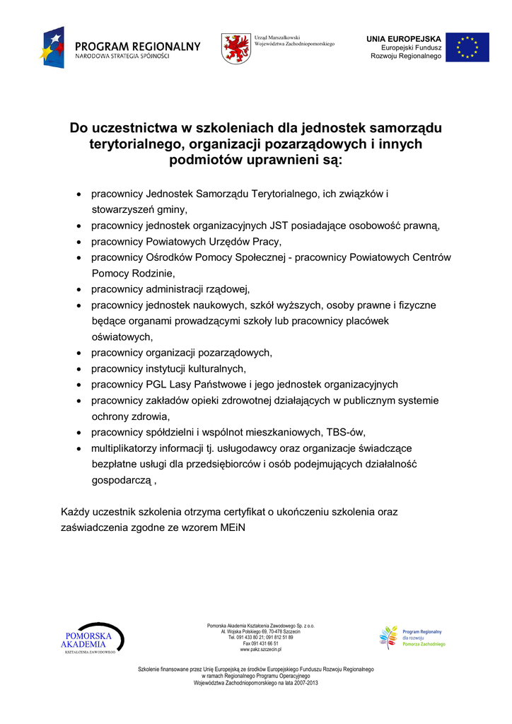 Urząd Marszałkowski Województwa Zachodniopomorskiego UNIA EUROPEJSKA Europejski Fundusz Rozwoju Regionalnego Do uczestnictwa w szkoleniach dla jednostek samorządu terytorialnego, organizacji pozarządowych i innych podmiotów uprawnieni są: pracownicy Jednostek Samorządu Terytorialnego, ich związków i stowarzyszeń gminy, pracownicy jednostek organizacyjnych JST posiadające osobowość prawną, pracownicy Powiatowych Urzędów Pracy, pracownicy Ośrodków Pomocy Społecznej - pracownicy Powiatowych Centrów Pomocy Rodzinie, pracownicy administracji rządowej, pracownicy jednostek naukowych, szkół wyższych, osoby prawne i fizyczne będące organami prowadzącymi szkoły lub pracownicy placówek oświatowych, pracownicy organizacji pozarządowych, pracownicy instytucji kulturalnych, pracownicy PGL Lasy Państwowe i jego jednostek organizacyjnych pracownicy zakładów opieki zdrowotnej działających w publicznym systemie ochrony zdrowia, pracownicy spółdzielni i wspólnot mieszkaniowych, TBS-ów, multiplikatorzy informacji tj. usługodawcy oraz organizacje świadczące bezpłatne usługi dla przedsiębiorców i osób podejmujących działalność gospodarczą , Każdy uczestnik szkolenia otrzyma certyfikat o ukończeniu szkolenia oraz zaświadczenia zgodne ze wzorem MEiN Pomorska Akademia Kształcenia Zawodowego Sp. z o.o. Al. Wojska Polskiego 69, 70-478 Szczecin Tel. 091 433 80 21; 091 812 51 89 Fax 091 431 66 51 www.pakz.szczecin.pl Szkolenie finansowane przez Unię Europejską ze środków Europejskiego Funduszu Rozwoju Regionalnego w ramach Regionalnego Programu Operacyjnego Województwa Zachodniopomorskiego na lata 2007-2013