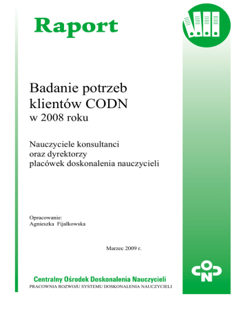 Badanie potrzeb klientów CODN w 2008 roku Nauczyciele konsultanci oraz dyrektorzy placówek doskonalenia nauczycieli Opracowanie: Agnieszka Fijałkowska Marzec 2009 r. PRACOWNIA ROZWOJU SYSTEMU DOSKONALENIA NAUCZYCIELI SPIS TREŚCI Wstęp…………………………………………………………………………………………………………………………………………….. 2 Projekt badania………………………………………………………………………………………………………………………… 2 Realizacja badania……………………………………………………………………………………………………………………. 3 Wyniki..................................................................................................................................... 3 Waga obszarów współpracy z CODN………………………………………………………………………………………. 3 Preferowane formy wsparcia w ramach obszarów współpracy z CODN………………………………. 10 Preferowane rodzaje szkoleń w ramach obszarów współpracy z CODN………………………………. 13 Najsłabsza obudowa teoretyczna obszarów współpracy z CODN………………………………………….. 15 Propozycje dodatkowych obszarów współpracy z CODN………………………………………………………. 16 Podsumowanie………………………………………………………………………………………………………………................ 19 Załączniki............................................................................................................................... ........... 22 Kwestionariusz dla dyrektorów placówek doskonalenia nauczycieli…………………………………….. 22 Kwestionariusz dla nauczycieli konsultantów placówek doskonalenia nauczycieli………………. 27 1 Wstęp Centralny Ośrodek Doskonalenia Nauczycieli od 2003 roku prowadzi badania potrzeb klientów zewnętrznych w oparciu o przyjętą procedurę. Celem badania jest zebranie danych, dotyczących potrzeb wybranych klientów zewnętrznych CODN i służących planowaniu pracy. W każdym badaniu diagnozie zostają poddane inne grupy klientów. Projekt badania W roku 2008 badaniem objęto pracowników wojewódzkich i powiatowych placówek doskonalenia nauczycieli, zarówno nauczycieli konsultantów, jak i dyrektorów. Celem badania jest poznanie potrzeb edukacyjnych pracowników placówek doskonalenia nauczycieli. Jego wyniki są jednym z istotnych elementów uwzględnianych przy planowaniu pracy CODN. Badanie prowadzone było metodą ankietową. Respondentów poproszono o wskazanie obszarów pracy placówki: y wymagających zewnętrznego wsparcia szkoleniowego lub informacyjnego, y w których najtrudniej uzyskać wsparcie, y dla których uzyskanie zewnętrznego wsparcia jest najpilniejsze. Obszary tematyczne, które wskazano w ankiecie to: y zarządzanie w oświacie, y nadzór pedagogiczny, y rozwój szkoły, y jakość w edukacji, y wspieranie nauczyciela w rozwoju, y edukacja elementarna, y edukacja językowa, y edukacja obywatelska, y edukacja przyrodnicza, y ocenianie i egzaminowanie, y informacja pedagogiczna, 2 y analizy, prognozy, badania edukacyjne. W ramach każdego obszaru tematycznego należało wskazać najodpowiedniejszą dla niego formę wsparcia, wybraną spośród następujących: y szkolenie, y informacje, y publikacje. Realizacja badania Ankiety zostały rozesłane pocztą elektroniczną w dniu 18 grudnia 2008 r. Skierowano je do wszystkich istniejących w bazie placówek doskonalenia nauczycieli. Oszacowano zwrot ankiet w liczbie 500. Wypełnione ankiety zwrócono do 15 stycznia 2009 r. Materiał badawczy to 55 ankiet wypełnionych przez dyrektorów placówek doskonalenia nauczycieli oraz 411 ankiet wypełnionych przez nauczycieli konsultantów. Wyniki W tym rozdziale zostaną przedstawione wyniki badania dotyczące wagi poszczególnych obszarów współpracy placówek doskonalenia nauczycieli z CODN, preferowanych form wsparcia w ramach poszczególnych obszarów oraz rodzajów szkoleń. Zostaną również przedstawione propozycje tematów, sformułowane przez respondentów, do ewentualnego uwzględnienia w planie pracy CODN. Waga obszarów współpracy z CODN W ankiecie wymieniono wszystkie obszary, w ramach których CODN współpracuje z placówkami doskonalenia nauczycieli i poproszono respondentów o nadanie wagi poszczególnym obszarom. Uczestnicy badania mogli uznać dany obszar za bardzo ważny (ranga 5), nieco mniej ważny (ranga 4), średnio ważny (ranga 3), mało ważny (ranga 2) oraz nieważny (ranga 1). Ponieważ odpowiedzi nauczycieli konsultantów stanowią zdecydowaną 3 większość wśród nadesłanych ankiet (411 ankiet w stosunku do 55 ankiet nadesłanych przez dyrektorów), to wypowiedzi tych respondentów wpływają na widoczne na wykresie tendencje. Na wykresie nr 1 przedstawiono obszary tematyczne uporządkowane według wskazania najwyższej rangi, odpowiedzi udzielonych zarówno przez dyrektorów placówek, jak i nauczycieli konsultantów. Dwa obszary tematyczne wskazywane są przez ponad połowę respondentów jako , ich zdaniem, najważniejsze wśród tych, którymi zajmuje się CODN. Są to: • wspieranie nauczyciela w rozwoju oraz • jakość w edukacji. W drugiej kolejności - jako ważne - wymieniano następujące obszary tematyczne: • ocenianie i egzaminowanie, • analizy, prognozy, badania edukacyjne, • rozwój szkoły. Obszary tematyczne, które ok. ¼ respondentów uznało za najmniej istotne we współpracy z CODN to: • edukacja przyrodnicza, • edukacja elementarna, • edukacja językowa. 4 Wykres nr 1 - Ranga obszarów współpracy z CODN (dyrektorzy oraz nauczyciele konsultanci) Ponieważ nauczyciele konsultanci stanowią zdecydowaną większość wśród respondentów układ odpowiedzi dl