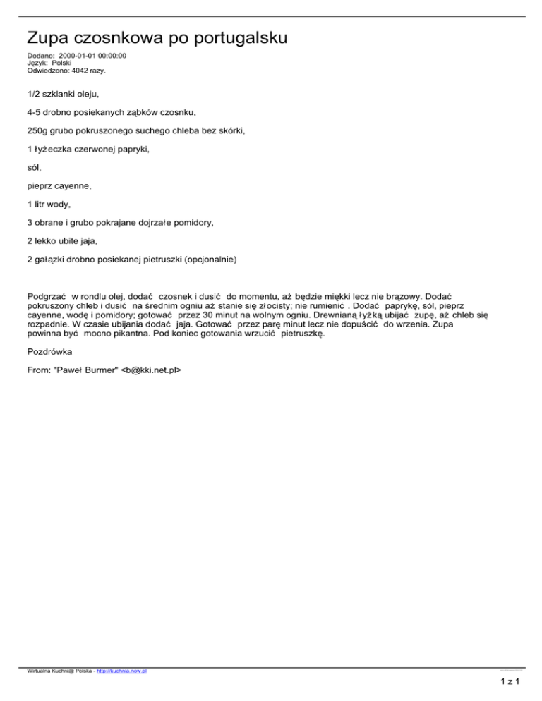 Zupa czosnkowa po portugalsku Dodano: 2000-01-01 00:00:00 Język: Polski Odwiedzono: 4042 razy. 1/2 szklanki oleju, 4-5 drobno posiekanych ząbków czosnku, 250g grubo pokruszonego suchego chleba bez skórki, 1 łyżeczka czerwonej papryki, sól, pieprz cayenne, 1 litr wody, 3 obrane i grubo pokrajane dojrzałe pomidory, 2 lekko ubite jaja, 2 gałązki drobno posiekanej pietruszki (opcjonalnie) Podgrzać w rondlu olej, dodać czosnek i dusić do momentu, aż będzie miękki lecz nie brązowy. Dodać pokruszony chleb i dusić na średnim ogniu aż stanie się złocisty; nie rumienić. Dodać paprykę, sól, pieprz cayenne, wodę i pomidory; gotować przez 30 minut na wolnym ogniu. Drewnianą łyżką ubijać zupę, aż chleb się rozpadnie. W czasie ubijania dodać jaja. Gotować przez parę minut lecz nie dopuścić do wrzenia. Zupa powinna być mocno pikantna. Pod koniec gotowania wrzucić pietruszkę. Pozdrówka From: "Paweł Burmer" <[email protected]> Wirtualna Kuchni@ Polska - http://kuchnia.now.pl przepis nr 3232, plik wygenerowano 2017.03.08 13:25 1z1