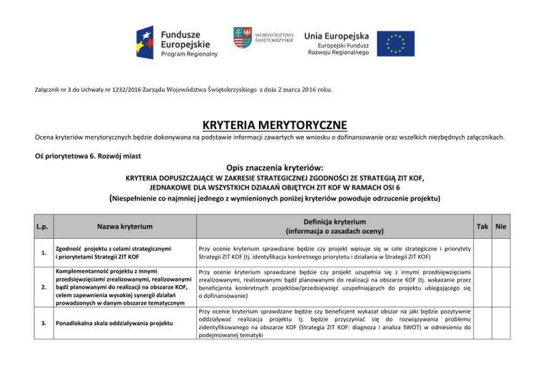 Załącznik nr 3 do Uchwały nr 1232/2016 Zarządu Województwa Świętokrzyskiego z dnia 2 marca 2016 roku. KRYTERIA MERYTORYCZNE Ocena kryteriów merytorycznych będzie dokonywana na podstawie informacji zawartych we wniosku o dofinansowanie oraz wszelkich niezbędnych załącznikach. Oś priorytetowa 6. Rozwój miast Opis znaczenia kryteriów: KRYTERIA DOPUSZCZAJĄCE W ZAKRESIE STRATEGICZNEJ ZGODNOŚCI ZE STRATEGIĄ ZIT KOF, JEDNAKOWE DLA WSZYSTKICH DZIAŁAŃ OBJĘTYCH ZIT KOF W RAMACH OSI 6 (Niespełnienie co najmniej jednego z wymienionych poniżej kryteriów powoduje odrzucenie projektu) L.p. Nazwa kryterium Definicja kryterium (informacja o zasadach oceny) 1. Zgodność projektu z celami strategicznymi i priorytetami Strategii ZIT KOF Przy ocenie kryterium sprawdzane będzie czy projekt wpisuje się w cele strategiczne i priorytety Strategii ZIT KOF (tj. identyfikacja konkretnego priorytetu i działania w Strategii ZIT KOF) 2. Komplementarność projektu z innymi przedsięwzięciami zrealizowanymi, realizowanymi bądź planowanymi do realizacji na obszarze KOF, celem zapewnienia wysokiej synergii działań prowadzonych w danym obszarze tematycznym Przy ocenie kryterium sprawdzane będzie czy projekt uzupełnia się z innymi przedsięwzięciami zrealizowanymi, realizowanymi bądź planowanymi do realizacji na obszarze KOF (tj. wskazanie przez beneficjenta konkretnych projektów/przedsięwzięć uzupełniających do projektu ubiegającego się o dofinansowanie) Ponadlokalna skala oddziaływania projektu Przy ocenie kryterium sprawdzane będzie czy beneficjent wykazał obszar na jaki będzie pozytywnie oddziaływać realizacja projektu tj. będzie przyczyniać się do rozwiązywania problemu zidentyfikowanego na obszarze KOF (Strategia ZIT KOF: diagnoza i analiza SWOT) w odniesieniu do podejmowanej tematyki 3. Tak Nie 4. Czy projekt przyczynia się do osiągnięcia wskaźników określonych w Strategii ZIT KOF? Przy ocenie kryterium sprawdzane będzie czy projekt przyczynia się do osiągnięcia wskaźników określonych w Strategii ZIT KOF 5. Czy projekt przyczynia się do realizacji wskaźników Przy ocenie kryterium sprawdzane będzie czy projekt przyczynia się do realizacji wskaźników określonych w RPO WŚ 2014-2020? określonych w RPOWŚ 2014-2020 Działanie 6.3 Ochrona i wykorzystanie obszarów cennych przyrodniczo - ZIT KOF (PI 6d) (Tryb pozakonkursowy) Opis znaczenia kryteriów: KRYTERIA DOPUSZCZAJĄCE OGÓLNE (Niespełnienie co najmniej jednego z wymienionych poniżej kryteriów powoduje odrzucenie projektu) Lp. Nazwa kryterium Definicja kryterium (informacja o zasadach oceny) 1. Zgodność projektu z dokumentami programowymi na lata 2014-2020 Przy ocenie kryterium pod uwagę brana będzie w szczególności zgodność projektu z zapisami Umowy Partnerstwa, z zapisami RPOWŚ 2014-2020, z zapisami SZOOP 2014-2020 oraz z wymogami Regulaminu konkursu. Tak Nie Nie dotyczy 2. 3. 4. 5. Przy ocenie kryterium sprawdzane będzie w szczególności, czy projekt jest zgodny z obowiązującymi przepisami prawa odnoszącymi się do jego stosowania oraz wytycznymi MIiR i wytycznymi IZ RPOWŚ na lata 2014-2020. Przedmiotem analizy będzie zgodność podstawowych parametrów technicznych z obowiązującymi aktami prawnymi dotyczącymi realizowanej inwestycji oraz kwestie prawne związane z realizacją projektu np. własność gruntów/obiektów, posiadanie niezbędnych dokumentów/decyzji Zgodność projektu z umożliwiających jego realizację (m.in. decyzje pozwolenia na budowę lub zgłoszenia robót budowlanych nie obowiązującymi przepisami prawa wymagających pozwolenia na budowę do których organ nie wniósł sprzeciwu), zgodność z branżowymi oraz obowiązującymi wytycznymi aktami prawnymi (w zależności od zakresu rzeczowego projektu) takimi jak np. Ustawa z 7 lipca 1994 r. Prawo budowlane, Rozporządzenie Ministra Infrastruktury z 12 kwietnia 2002 r. w sprawie warunków technicznych, jakim powinny odpowiadać budynki i ich usytuowanie, Rozporządzenie Ministra Transportu i Gospodarki Morskiej z 2 marca 1999 r. w sprawie warunków technicznych, jakim powinny odpowiadać drogi publiczne i ich usytuowanie, itp. Przy ocenie kryterium badana będzie w szczególności spójność pomiędzy Wnioskiem o dofinansowanie, Spójność dokumentacji a pozostałą dokumentacją aplikacyjną (tj. Studium wykonalności/Biznes plan, załączniki do Wniosku projektowej o dofinansowanie). Przy ocenie projektu weryfikacji podlegać będzie w szczególności metodologia i poprawność sporządzenia analiz w oparciu o obowiązujące przepisy prawa w tym zakresie (np. m.in. Ustawa o rachunkowości) i wytyczne (m.in. wytyczne MIiR w zakresie zagadnień związanych z przygotowaniem projektów inwestycyjnych, w tym projektów generujących dochód i projektów hybrydowych na lata 2014-2020, wytyczne Właściwie przygotowana analiza IZ RPOWŚ na lata 2014-2020 w zakresie sporządzania studium wykonalności/biznes planu). finansowa i/lub ekonomiczna W przypadku gdy wymagane będzie obliczenie wskaźników finansowych/ ekonomicznych sprawdzane będą projektu m.in. realność i rzetelność przyjętych założeń oraz poprawność obliczeń. Ponadto, badana będzie również trwałość finansowa Wnioskodawcy (również ewentualnych partnerów projektu) tj. m.in. czy Wnioskodawca/partnerzy posiadają środki finansowe na zrealizowanie i utrzymanie inwestycji w wymaganym okresie trwałości. W kryterium sprawdzane będzie w szczególności, czy przedsięwzięcie jest uzasadnione z ekonomicznego punktu widzenia. W przypadku projektów, dla których wymagane będzie obliczenie wskaźników ekonomicznych (ENPV, ERR, B/C) weryfikacja efektywności ekonomicznej projektu odbywać się będzie na Efektywność ekonomiczna projektu podstawie wartości wymienionych powyżej wskaźników przy założeniu, że dla projektu efektywnego ekonomicznie: - wartość wskaźnika ENPV powinna być > 0; - wartość wskaźni