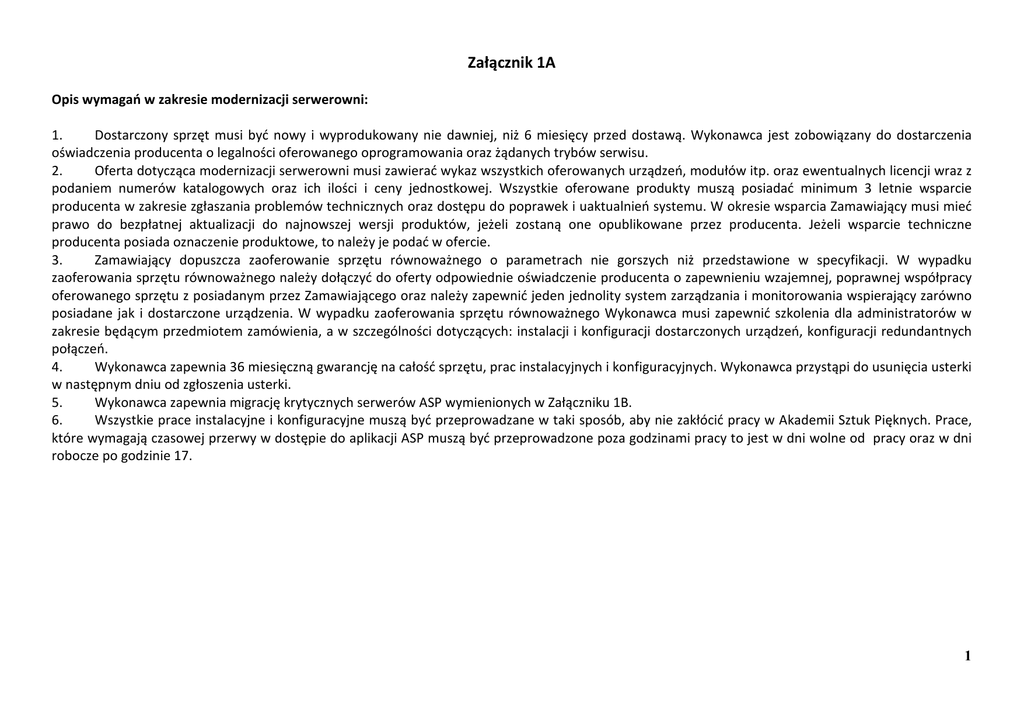 Załącznik 1A Opis wymagań w zakresie modernizacji serwerowni: 1. Dostarczony sprzęt musi być nowy i wyprodukowany nie dawniej, niż 6 miesięcy przed dostawą. Wykonawca jest zobowiązany do dostarczenia oświadczenia producenta o legalności oferowanego oprogramowania oraz żądanych trybów serwisu. 2. Oferta dotycząca modernizacji serwerowni musi zawierać wykaz wszystkich oferowanych urządzeń, modułów itp. oraz ewentualnych licencji wraz z podaniem numerów katalogowych oraz ich ilości i ceny jednostkowej. Wszystkie oferowane produkty muszą posiadać minimum 3 letnie wsparcie producenta w zakresie zgłaszania problemów technicznych oraz dostępu do poprawek i uaktualnień systemu. W okresie wsparcia Zamawiający musi mieć prawo do bezpłatnej aktualizacji do najnowszej wersji produktów, jeżeli zostaną one opublikowane przez producenta. Jeżeli wsparcie techniczne producenta posiada oznaczenie produktowe, to należy je podać w ofercie. 3. Zamawiający dopuszcza zaoferowanie sprzętu równoważnego o parametrach nie gorszych niż przedstawione w specyfikacji. W wypadku zaoferowania sprzętu równoważnego należy dołączyć do oferty odpowiednie oświadczenie producenta o zapewnieniu wzajemnej, poprawnej współpracy oferowanego sprzętu z posiadanym przez Zamawiającego oraz należy zapewnić jeden jednolity system zarządzania i monitorowania wspierający zarówno posiadane jak i dostarczone urządzenia. W wypadku zaoferowania sprzętu równoważnego Wykonawca musi zapewnić szkolenia dla administratorów w zakresie będącym przedmiotem zamówienia, a w szczególności dotyczących: instalacji i konfiguracji dostarczonych urządzeń, konfiguracji redundantnych połączeń. 4. Wykonawca zapewnia 36 miesięczną gwarancję na całość sprzętu, prac instalacyjnych i konfiguracyjnych. Wykonawca przystąpi do usunięcia usterki w następnym dniu od zgłoszenia usterki. 5. Wykonawca zapewnia migrację krytycznych serwerów ASP wymienionych w Załączniku 1B. 6. Wszystkie prace instalacyjne i konfiguracyjne muszą być przeprowadzane w taki sposób, aby nie zakłócić pracy w Akademii Sztuk Pięknych. Prace, które wymagają czasowej przerwy w dostępie do aplikacji ASP muszą być przeprowadzone poza godzinami pracy to jest w dni wolne od pracy oraz w dni robocze po godzinie 17. 1 Przedmiot Serwer maszyn wirtualnych z systemem operacyjnym Przykładowy model: HP DL380 G7 z systemem vmware Essentials Plus Kit lub równoważny pod względem parametrów technicznych Wymagania Opis oferowanego przedmiotu zamówienia • Obudowa o wysokości maksymalnie 2U, dedykowana do zamontowania w szafie typu rack 19" z zestawem szyn do mocowania w szafie i wysuwania do celów serwisowych. • Procesor minimum 6-rdzeniowy, 12 MB L3 cache, Intel® Xeon® Processor X56xx lub równoważny, procesor w architekturze zgodnej z 64-bitową architekturą x86 (x86-64). W przypadku procesora równoważnego, oferowany model serwera z procesorem równoważnym musi osiągać w teście SPECvirt_sc2010 wynik minimum 1220@78 pkt. w konfiguracji dwuprocesorowej. Wyniki testu muszą być opublikowane i powszechnie dostępne na stronie www.spec.org. W każdym serwerze powinny być zainstalowane dwa takie same procesory. • Płyta główna dwuprocesorowa, dedykowana do pracy w serwerach. Płyta musi posiadać przynajmniej 18 banków pamięci DDR3 (9 banków pamięci na procesor). • Sloty PCI - minimum 6 slotów PCI-E do zainstalowania niezbędnych kart rozszerzeń. Serwer musi mieć możliwość adaptacji do uzyskania minimum 1 slotu PCI-X lub posiadać taki slot w standardzie. • Pamięć minimum 36GB DDR3 (18 GB dla każdego z procesorów), z technologią RIMM ECC. W przypadku stosowania procesorów Intel: zainstalowane 12 modułów o częstotliwości taktowania 1333MHz (6 modułów dla każdego z procesorów – pamięć w trybie trzykanałowym). • Możliwość rozszerzenia pamięci do minimum 192 GB dla każdego zainstalowanego procesora po wymianie zainstalowanych modułów. • Interfejsy sieciowe: 4x GigabitEthernet 10/100/1000 łącznie, nie zajmujących slotu PCI-E. Interfejsy sieciowe muszą wspierać technologię load balancing, failover i TCP/IP Offload Engine. • Interfejsy zewnętrzne – 1 port RJ-45 dedykowany dla interfejsu zdalnego zarządzania iLO3, 5 portów USB (2 z przodu i 2 z tyłu obudowy, 1 wewnętrzny), 1 port VGA, 1 slot SD, 1 port szeregowy, 1 port klawiatury PS/2, 1 port myszy PS/2. • Kontroler macierzowy SAS, umożliwiający konfigurację dysków w macierzach RAID 0, 1, 1+0, 5, 5 + 0 zintegrowany lub w zainstalowany w slocie PCI 1 GB flash RAM. • Napęd optyczny DVD-ROM/CDRW. • 2 dyski twarde 146 GB SAS 6Gbps pracujące w trybie RAID 1 z prędkością 2 10 tyś. obrotów na minutę. Możliwość wymiany dysku przy włączonym zasilaniu, możliwość rozbudowy do minimum 8 dysków, możliwość instalacji dysków w technologii SSD. • 5 dysków twardych o pojemności minimum 300GB, typu SAS 6Gbps, pracujących w trybie RAID 5 z prędkością 10 tyś. obrotów na minutę. Minimalna pojemność utworzonego wolumenu powinna wynosić 1,2TB. • 2 zasilacze typu Hot-Plug (wymiana bez przerywania pracy serwera) co najmniej 750 W na każdy, redundancja N+1. • Redundantne wiatraki typu Hot-Plug N+1. • Serwer musi być wyposażony w kartę zdalnego zarządzania (konsoli) pozwalającej na: włączenie, wyłączenie i restart serwera, podgląd logów sprzętowych serwera i karty, przejęcie pełnej konsoli tekstowej serwera niezależnie od jego stanu (także podczas startu i restartu OS). Serwer musi posiadać możliwość przejęcia zdalnej konsoli graficznej i podłączania wirtualnych napędów CD i FDD. Rozwiązanie sprzętowe, niezależne od systemów operacyjnych, zintegrowane z płytą główną lub jako karta zainstalowana w gnieździe PCI. • Wbudowany panel diagnostyczny umożliwiający szybką identyfikację uszkodzonego elementu serwera. • Serwer wyposa