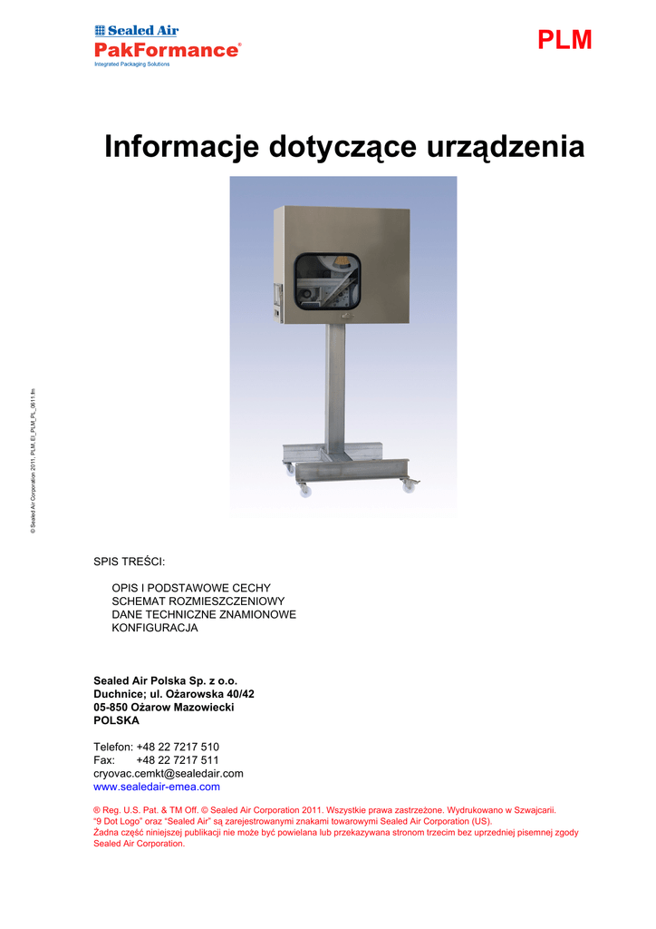 PLM © Sealed Air Corporation 2011, PLM, EI_PLM_PL_0611.fm Informacje dotyczące urządzenia SPIS TREŚCI: OPIS I PODSTAWOWE CECHY SCHEMAT ROZMIESZCZENIOWY DANE TECHNICZNE ZNAMIONOWE KONFIGURACJA Sealed Air Polska Sp. z o.o. Duchnice; ul. Ożarowska 40/42 05-850 Ożarow Mazowiecki POLSKA Telefon: +48 22 7217 510 Fax: +48 22 7217 511 [email protected] www.sealedair-emea.com ® Reg. U.S. Pat. & TM Off. © Sealed Air Corporation 2011. Wszystkie prawa zastrzeżone. Wydrukowano w Szwajcarii. “9 Dot Logo” oraz “Sealed Air” są zarejestrowanymi znakami towarowymi Sealed Air Corporation (US). Żadna część niniejszej publikacji nie może być powielana lub przekazywana stronom trzecim bez uprzedniej pisemnej zgody Sealed Air Corporation. 1 Opis i podstawowe cechy 1.1 Opis Poprzez to nowe rozwiązanie systemowe firma Sealed Air wprowadza na rynek nowe funkcje użytkowe, umożliwiające wizualizację procesu pakowania, automatyczne ważenie na linii produkcyjnej, automatyczny wydruk etykiet, zarządzanie partiami produkcyjnymi, śledzenie procesów na linii pakowania, stały monitoring umożliwiający optymalizację procesów itp. Ze względu na modularność, poziom parametrów użytkowych i funkcji jest zdeterminowany przez konfigurację linii i zaimplementowane oprogramowanie IS. System PakFormance® firmy Sealed Air umożliwia stałą obserwację pomieszczeń, w których pracują urządzenia do pakowania, zapewnia automatyzację procesów, tworzy warunki do śledzenia przebiegu procesów, zwiększa efektywność pracy i znacznie obniża koszty eksploatacji. PakFormance® zapewnia warunki dla prowadzenia pomiarów, sterowania procesami, umożliwiając optymalizację procesów i kosztów produkcji. Moduł etykietowania produktów Sealed Air PakFormance® (Product Labeling Module, PLM) jest utworzony przez drukarkę etykiet Markem-Imaje i podajnik – jednostki te są zamknięte w obudowie ze stali nierdzewnej wyposażonej w kółka jezdne. Drukarka Markem-Imaje jest kompatybilna z systemem PakFormance® i jest preferowanym przez nas rozwiązaniem na potrzeby etykietowania. Na specjalne życzenie klienta możliwe jest wykonanie oceny przydatności innych systemów etykietowania. Moduł etykietowania produktów można zainstalować w dowolnym miejscu linii produkcyjnej. Moduł ten podlega kontroli przez osobę nadzorującą pracę linii pakowania. Moduł wydaje etykiety w sposób automatyczny operatorowi, który nakłada je na produkty nieopakowane lub opakowane. Drukarka może drukować w sposób dynamiczny dowolny rodzaj informacji, dane stałe, zmienne, logo lub kod kreskowy. Wzór wydruku można w pełni dostosować do rodzaju produktu, jeśli zapewniona jest możliwość śledzenia produktu. Konstrukcja urządzenia jest prosta i solidna. Wszystkie krytyczne części urządzenia zostały zabezpieczone przed środowiskiem o działaniu korozyjnym, często występującym w pomieszczeniach mieszczących instalacje przetwórcze i linie pakowania produktów spożywczych. Urządzenie zostało skonstruowane w sposób ergonomiczny, z myślą o bezpieczeństwie i higienie, jest proste w obsłudze, łatwe do utrzymania w czystości i niekłopotliwe w konserwacji. Spełnia ono także wszystkie istotne wymagania zawarte w przepisach Unii Europejskiej dotyczących bezpieczeństwa i higieny. 2 © Sealed Air Corporation 2011, PLM, EI_PLM_PL_0611.fm PakFormance® stanowi zintegrowaną platformę rozszerzającą nasze kompleksowe podejście do systemu maszyn produkcyjnych, która zapewnia wykorzystanie informacji użytkowych, zwiększając korzyści osiągane przez klientów. PakFormance® oferuje jedyne w swoim rodzaju powiązanie sprzętu IS, oprogramowania IS oraz wyposażenia tworzącego sieć służącą wymianie danych. Oferta PakFormance® zapewnia możliwość wzajemnego łączenia systemów Sealed Air, a także integracji systemów Sealed Air z wyposażeniem innych producentów (wagi, drukarki, etykieciarki itp.). System PakFormance® odznacza się modularnością, jest skalowalny, zapewnia liczne możliwości konfiguracji i rozszerzeń w odniesieniu do procesów pakowania. 1.2 Główne cechy • • • • • • • • © Sealed Air Corporation 2011, PLM, EI_PLM_PL_0611.fm • Automatyczne drukowanie i wydawanie etykiet Wymagana obecność 1 operatora celem nakładania etykiet na produkty nieopakowane lub opakowane Dla kierunku ruchu produktów z prawej strony na lewą i z lewej na prawą Technologia druku termotransferowego lub termicznego Standardowe oprogramowanie projektowania etykiet Markem-Imaje Prędkość uzależniona od operatora (możliwość osiągnięcia poziomu 35 etykiet na minutę) Wydruk dynamiczny, dostosowany do produktu w przypadku wykorzystania opcji śledzenia produktu Moduł zamknięty w obudowie ze stali nierdzewnej wyposażonej w kółka jezdne Konstrukcja uwzględniająca wymogi higieniczne zapewnia łatwość i skuteczność czyszczenia 3 Schemat rozmieszczeniowy © Sealed Air Corporation 2011, PLM, EI_PLM_PL_0611.fm 2 Rys. 2-1, Schemat rozmieszczeniowy 4 3 Dane techniczne znamionowe 3.1 Wymiary urządzenia Długość, szerokość i wysokość 3.2 patrz schemat rozmieszczeniowy maszyny Masa © Sealed Air Corporation 2011, PLM, EI_PLM_PL_0611.fm ok. 180 kg (bez etykiet) 3.3 Media robocze 3.3.1 Zasilanie elektryczne Napięcie Liczba faz Częstotliwość Godzinowe zużycie energii elektrycznej (średnie) Moc zainstalowana Zabezpieczenie prądowe 3.3.2 100 - 240 V AC 1 + N + PE 50 Hz / 60 Hz 0,1 kWh 0,2 kW min. 6 A do maks. 16 A Sprężone powietrze Rodzaj powietrza Ciśnienie Średnica przewodu rurowego doprowadzającego Zużycie 5 czyste i suche 6 bar 6/4 mm ok. 0,3 Nm3/h 3.4 Charakterystyki robocze 3.4.1 Wymiary produktu Długość, szerokość i wysokość 3.4.2 Dla modułu PLM brak jest ograniczeń dotyczących wymiarów produktu Etykiety Wskazówka: Etykiety muszą być dopuszczone do wykorzystania na artykułach spożywczych, preferencyjnie samoprzylepne. Prz