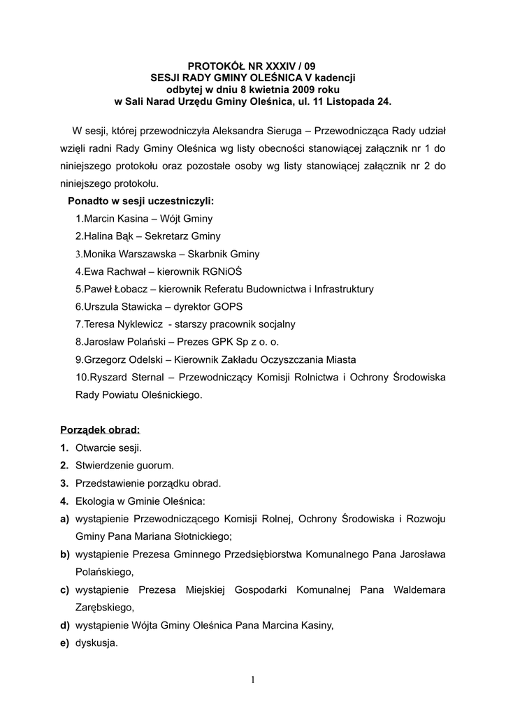 PROTOKÓŁ NR XXXIV / 09 SESJI RADY GMINY OLEŚNICA V kadencji odbytej w dniu 8 kwietnia 2009 roku w Sali Narad Urzędu Gminy Oleśnica, ul. 11 Listopada 24. W sesji, której przewodniczyła Aleksandra Sieruga – Przewodnicząca Rady udział wzięli radni Rady Gminy Oleśnica wg listy obecności stanowiącej załącznik nr 1 do niniejszego protokołu oraz pozostałe osoby wg listy stanowiącej załącznik nr 2 do niniejszego protokołu. Ponadto w sesji uczestniczyli: 1.Marcin Kasina – Wójt Gminy 2.Halina Bąk – Sekretarz Gminy 3.Monika Warszawska – Skarbnik Gminy 4.Ewa Rachwał – kierownik RGNiOŚ 5.Paweł Łobacz – kierownik Referatu Budownictwa i Infrastruktury 6.Urszula Stawicka – dyrektor GOPS 7.Teresa Nyklewicz - starszy pracownik socjalny 8.Jarosław Polański – Prezes GPK Sp z o. o. 9.Grzegorz Odelski – Kierownik Zakładu Oczyszczania Miasta 10.Ryszard Sternal – Przewodniczący Komisji Rolnictwa i Ochrony Środowiska Rady Powiatu Oleśnickiego. Porządek obrad: 1. Otwarcie sesji. 2. Stwierdzenie guorum. 3. Przedstawienie porządku obrad. 4. Ekologia w Gminie Oleśnica: a) wystąpienie Przewodniczącego Komisji Rolnej, Ochrony Środowiska i Rozwoju Gminy Pana Mariana Słotnickiego; b) wystąpienie Prezesa Gminnego Przedsiębiorstwa Komunalnego Pana Jarosława Polańskiego, c) wystąpienie Prezesa Miejskiej Gospodarki Komunalnej Pana Waldemara Zarębskiego, d) wystąpienie Wójta Gminy Oleśnica Pana Marcina Kasiny, e) dyskusja. 1 Przerwa (15 minut) 5. Podjecie uchwał: a) w sprawie utworzenia odrębnego obwodu głosowania na obszarze gminy Oleśnica w wyborach do Parlamentu Europejskiego, zarządzonych na dzień 7 czerwca 2009r.; b) w sprawie zasad wypłacania diet oraz zwrotów kosztów podróży służbowej przysługujących przewodniczącemu organu wykonawczego jednostki pomocniczej; c) w sprawie wyrażenia zgody na zamianę nieruchomości stanowiących własność Gminy Oleśnica na nieruchomości stanowiące własność osoby fizycznej; d) w sprawie uchwalenia Statutu Gminnego Ośrodka Pomocy Społecznej w Oleśnicy; e) w sprawie zmian budżetu gminy na 2009 rok; f) w sprawie zaciągnięcia pożyczki z Wojewódzkiego Funduszu Ochrony Środowiska i Gospodarki Wodnej we Wrocławiu na sfinansowanie wydatku inwestycyjnego. 6. Przedstawienie sprawozdania z realizacji Gminnego Programu Profilaktyki i Rozwiązywania Problemów Alkoholowych w 2008 roku przez Panią Teresę Nyklewicz. 7. Sprawozdanie z pracy Wójta między sesjami. 8. Zapytania, sprawy różne, wolne wnioski. 9. Przyjęcie protokołu z XXXIII sesji Rady Gminy Oleśnica. 10. Zamknięcie obrad XXXIV sesji Rady Gminy Oleśnica. Ad. 1 Otwarcie sesji. Przewodnicząca Rady Gminy Oleśnica Aleksandra Sieruga otworzyła obrady XXXIV sesji Rady Gminy Oleśnica V kadencji o godz. 12.00. Powitała radnych Rady Gminy Oleśnica, Wójta Marcina Kasinę, Prezesa Gminnego Przedsiębiorstwa Komunalnego Jarosława Polańskiego, Kierownika Zakładu Oczyszczania Miasta Grzegorza Odelskiego, zaproszonych gości, dyrektorów jednostek organizacyjnych, sołtysów, mieszkańców gminy, media oraz pracowników urzędu. 2 Ad. 2 Stwierdzenie quorum. Przewodnicząca oświadczyła, iż zgodnie z listą obecności aktualnie w sesji uczestniczy 13 radnych (nieobecny usprawiedliwiony radny Tadeusz Cieślak, radny Jacenty Kawecki spóźni się) co wobec ustawowego składu radnych stanowi quorum pozwalające na podejmowanie prawomocnych decyzji. Ad. 3 Przedstawienie porządku obrad. Przewodnicząca przedstawiła porządek obrad, który radni otrzymali wraz z zaproszeniem. Radni nie wnieśli uwag do porządku obrad. Ad. 4 Ekologia w Gminie Oleśnica: a) wystąpienie Przewodniczącego Komisji Rolnej, Ochrony Środowiska i Rozwoju Gminy Pana Mariana Słotnickiego stanowi załącznik nr 12 do niniejszego protokołu; Na sesję doszedł radny Jacenty Kawecki – 14 radnych obecnych na sesji. b) wystąpienie Prezesa Gminnego Przedsiębiorstwa Komunalnego Pana Jarosława Polańskiego stanowi załącznik nr 13 do niniejszego protokołu; c) w zastępstwie Prezesa Miejskiej Gospodarki Komunalnej Waldemara Zarębskiego wystąpił kierownik Zakładu Oczyszczania Miasta Grzegorz Odelski /załącznik nr 14/; d) wystąpienie Wójta Gminy Oleśnica Marcina Kasiny stanowi załącznik nr 15 do niniejszego protokołu; e) Przewodnicząca otworzyła dyskusję. Radny Tadeusz Kunaj zasugerował, aby Wójt rozpatrzył możliwość dotacji do kolektorów próżniowych. Zdaniem radnego powinno się odstąpić od dotowania pomp cieplnych na rzecz omawianych kolektorów. Wójt wyjaśnił, że w zeszłym roku 2008 gmina dotowała 2 pompy na kwotę 12.000zł. Jest to, być może, małe zainteresowanie, ale są osoby, które chcą w to inwestować. Pompa cieplna, mimo tego że wykorzystuje energię elektryczną jest wpisana jako odnawialne źródło energii wykorzystujące naturaląa temperaturę ziemi. Jeżeli chodzi o kolektory słoneczne to wymagana będzie zmiana uchwały Rady Gminy, ponieważ przy powołaniu Gminnego Funduszu Ochrony Środowiska w uchwale nie jest uwzględnione dofinansowywanie kolektorów próżniowych. Wójt 3 dodał, że należy zastanowić się w jakim procencie będzie to dofinansowywane. Marcin Kasina przedstawił zebranym następujące kwoty: w 2008 roku na oczyszczalnie było przeznaczone 211.920zł, dofinansowano 49 przydomowych oczyszczalni. Rozbudowano 3.833m wodociągów i dofinansowano na kwotę 199.080zł. Na termomodernizację przeznaczono 59.400zł, dofinansowano 2 projekty. Kotły na odnawialne źródła energii 17.740zł, dofinansowano 3 projekty. Utylizacja azbestu – 1 projekt na kwotę 12.010zł. Dofinansowanie w 2009 roku do 31 marca kształtuje się następująco: oczyszczalnie 153.170zł (tendencja jest rosnąca), wodociągi na kwotę 77.670zł, 1406m, termomodernizacja 1 projekt na kwotę 30.000zł, kotły ze względu na zmiany w zarządzeniu nie zostały jeszcze dofinansowane, jest jednak ok. 10 wniosków, które cz