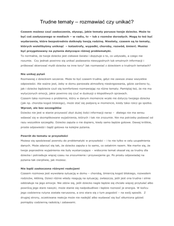 Trudne tematy – rozmawiać czy unikać? Czasem możesz czuć zaskoczenie, słysząc, jakie tematy porusza twoje dziecko. Może to być coś zasłyszanego w mediach – w radiu, tv – lub z rozmów dorosłych. Mogą to też być wydarzenia, które bezpośrednio dotknęły twoją rodzinę. Niestety, czasem są to tematy, których wolelibyśmy uniknąć – katastrofy, wypadki, choroby, rozwód, śmierć. Musisz być przygotowany na pytania dotyczące różnej problematyki. To normalne, że twoje dziecko jest ciekawe świata i dopytuje o to, co usłyszało, a czego nie rozumie. Czy jednak powinno się unikać podawania niewygodnych lub smutnych informacji i próbować skierować myśli dziecka na inne tory? Jak rozmawiać z dzieckiem o trudnych tematach? Nie unikaj pytań Rozmawiaj z dzieckiem szczerze. Może to być czasem trudne, gdyż nie zawsze znasz wszystkie odpowiedzi. Ale ważne jest, żeby w domu panowała atmosferę nieskrępowania, gdzie zarówno ty, jak i dziecko będziecie czuli się komfortowo rozmawiając na różne tematy. Pamiętaj też, że nie ma wytyczonych emocji, jakie powinno się czuć w dyskusji o kłopotliwych sprawach. Czasem taka rozmowa o problemie, który w danym momencie wcale nie dotyczy twojego dziecka (jak np. choroba kogoś bliskiego), może stać się podporą w momencie, kiedy taka rzecz go spotka. Wprost, ale bez szczegółów Dziecko nie jest w stanie przyswoić zbyt dużej ilości informacji naraz – dlatego nie ma sensu wdawać się w skomplikowane wyjaśnienia, których i tak nie zrozumie. Nie ma potrzeby podawać od razu wszystkie szczegóły. Dziecko zapyta o nie dopiero, kiedy samo będzie gotowe. Dawaj krótkie, proste odpowiedzi i bądź gotowa na kolejne pytania. Powrót do tematu w przyszłości Możesz się spodziewać powrotu do problematyki w przyszłości – i to nie tylko w celu uzupełnienia danych. Może zdarzyć się tak, że dziecko zapyta o to samo, co ostatnim razem. Nie martw się, że twoje poprzednie wyjaśnienia nie były wystarczające – widocznie temat okazał się za trudny dla dziecka i potrzebuje więcej czasu na zrozumienie i przyswojenie go. Po prostu odpowiadaj na pytania tak cierpliwie, jak możesz. Nie bądź zaskoczona różnymi reakcjami Czasem rozmowa jest wywołana sytuacją w domu – chorobą, śmiercią kogoś bliskiego, rozwodem rodziców, kłótnią. Dzieci różnie wtedy reagują na sytuację; zwłaszcza, jeśli jest ona trudna i silnie oddziałuje na jego emocje. Nie zdziw się, jeśli dziecko nagle będzie się chciało więcej przytulać albo powrócą jego stare nawyki; może stanie się nadpobudliwe i będzie roznosić je energia. W końcu jego codzienna rutyna została naruszona, a ono stara się z tym pogodzić – na swój sposób. Z drugiej strony, oczekiwana reakcja może nie nadejść albo wydawać się być stłumiona gdzieś pomiędzy codzienną radością i zabawami. Pozwól dziecku na wyrażanie emocji w różny sposób, o ile nie są one destrukcyjne dla niego samego lub otoczenia. Możesz podsunąć mu kredki i kartki – ekspresja plastyczna jest znakomitym sposobem na wyrażanie uczuć, zwłaszcza tych, których nie umiemy zwerbalizować. Może mieć też charakter kompensacyjny, redukować emocje. Możesz też zainwestować w materace i piłki, na których dziecko będzie mogło wyładować swoją energię. Zapewnij dziecko, że różne towarzyszące emocje są w porządku (nawet jeśli nie wszystkie zachowania nimi wywołane są społecznie akceptowane) i nie trzeba się ich wstydzić. Pomóż też znaleźć zdrowy sposób na radzenie sobie z nimi. Wyrażaj własne emocje Jeśli jakaś nieprzyjemna sytuacja zdarzyła się w waszym domu i wszyscy zostaliście nią mocno poruszeni – nie ukrywaj przed dzieckiem emocji. Nie przestrasz go gwałtowną reakcja, ale też nie udawaj, że wszystko jest w porządku. Wyjaśnij, że dorośli też są czasem smutni i mogą z tego powodu płakać albo mieć ponury nastrój. Twoje dziecko jest świadome zmian w twoich uczuciach i będzie tym bardziej zaniepokojone, jeśli wyczuje, że coś jest nie tak, a ty to ukrywasz. Codzienność dziecka Nie powiększaj jego niepokoju przez zakłócenie codziennych obowiązków i zajęć. Utrzymanie rutyny daje mu poczucie bezpieczeństwa i stabilności. Im szybciej wasze życie wróci do normalności, tym łatwiej będzie mu sobie poradzić w nowej sytuacji. Tak więc niech o odpowiedniej porze kładzie się spać, wstaje, je posiłki, chodzi do przedszkola albo szkoły, spotyka z przyjaciółmi. Jeśli twoje dziecko wydaje się mieć trudności w radzeniu sobie z nową sytuacją albo jakiś temat wywołuje u niego szczególnie silne emocje – boi się spać, wydaje się przygaszone lub przejawia zachowania agresywne – poszukaj pomocy u różnych źródeł: w książkach, u specjalistów, psychologów, w odpowiednich organizacjach. Twoje wysiłki muszą skupić się na pomocy dziecku w radzeniu sobie w trudnych sytuacjach, by w przyszłości było w stanie samemu mierzyć się z problemami w życiu.