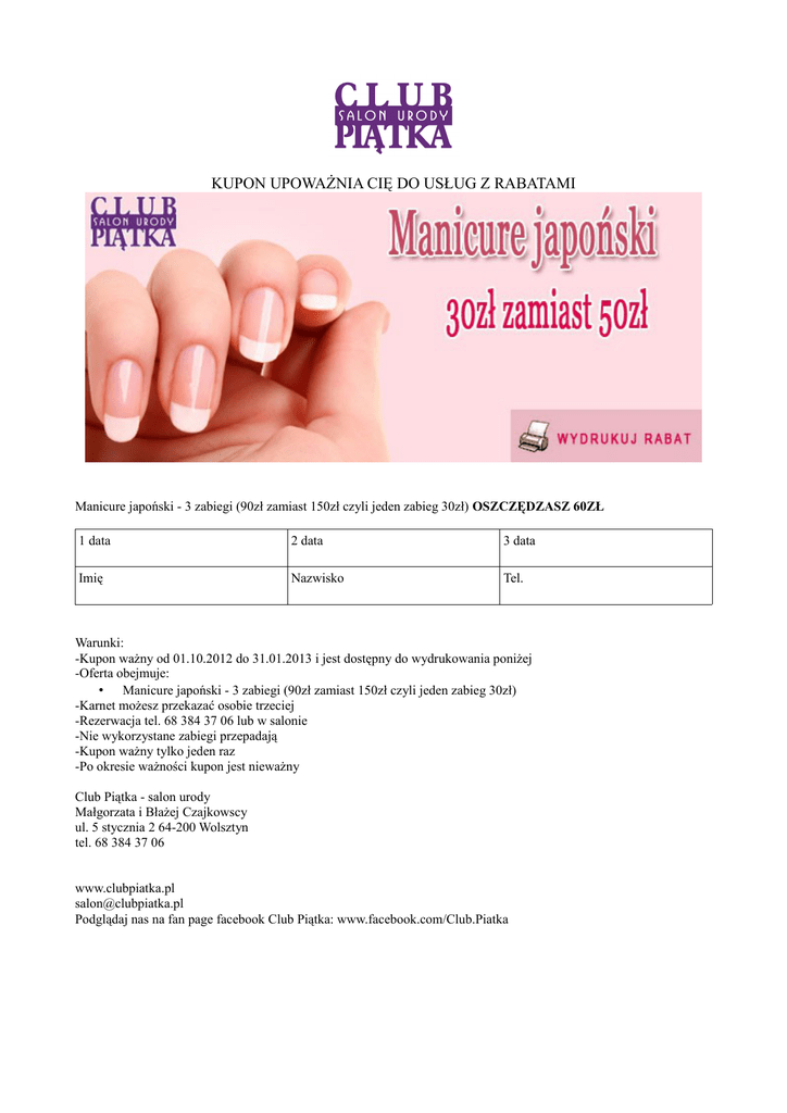 KUPON UPOWAŻNIA CIĘ DO USŁUG Z RABATAMI Manicure japoński - 3 zabiegi (90zł zamiast 150zł czyli jeden zabieg 30zł) OSZCZĘDZASZ 60ZŁ 1 data 2 data 3 data Imię Nazwisko Tel. Warunki: -Kupon ważny od 01.10.2012 do 31.01.2013 i jest dostępny do wydrukowania poniżej -Oferta obejmuje: • Manicure japoński - 3 zabiegi (90zł zamiast 150zł czyli jeden zabieg 30zł) -Karnet możesz przekazać osobie trzeciej -Rezerwacja tel. 68 384 37 06 lub w salonie -Nie wykorzystane zabiegi przepadają -Kupon ważny tylko jeden raz -Po okresie ważności kupon jest nieważny Club Piątka - salon urody Małgorzata i Błażej Czajkowscy ul. 5 stycznia 2 64-200 Wolsztyn tel. 68 384 37 06 www.clubpiatka.pl [email protected] Podglądaj nas na fan page facebook Club Piątka: www.facebook.com/Club.Piatka