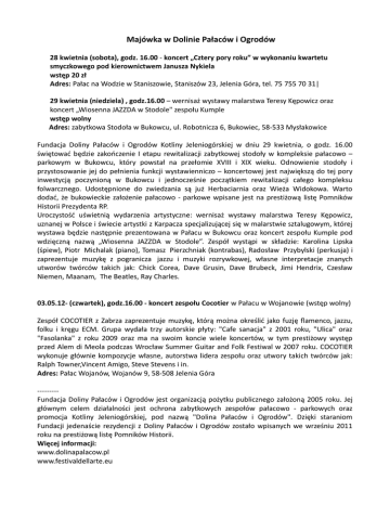 Majówka w Dolinie Pałaców i Ogrodów 28 kwietnia (sobota), godz. 16.00 - koncert „Cztery pory roku” w wykonaniu kwartetu smyczkowego pod kierownictwem Janusza Nykiela wstęp 20 zł Adres: Pałac na Wodzie w Staniszowie, Staniszów 23, Jelenia Góra, tel. 75 755 70 31| 29 kwietnia (niedziela) , godz.16.00 – wernisaż wystawy malarstwa Teresy Kępowicz oraz koncert „Wiosenna JAZZDA w Stodole" zespołu Kumple wstęp wolny Adres: zabytkowa Stodoła w Bukowcu, ul. Robotnicza 6, Bukowiec, 58-533 Mysłakowice Fundacja Doliny Pałaców i Ogrodów Kotliny Jeleniogórskiej w dniu 29 kwietnia, o godz. 16.00 świętować będzie zakończenie I etapu rewitalizacji zabytkowej stodoły w kompleksie pałacowo – parkowym w Bukowcu, który powstał na przełomie XVIII i XIX wieku. Odnowienie stodoły i przystosowanie jej do pełnienia funkcji wystawienniczo – koncertowej jest największą do tej pory inwestycją poczynioną w Bukowcu i jednocześnie początkiem rewitalizacji całego kompleksu folwarcznego. Udostępnione do zwiedzania są już Herbaciarnia oraz Wieża Widokowa. Warto dodać, że bukowieckie założenie pałacowo - parkowe wpisane jest na prestiżową listę Pomników Historii Prezydenta RP. Uroczystość uświetnią wydarzenia artystyczne: wernisaż wystawy malarstwa Teresy Kępowicz, uznanej w Polsce i świecie artystki z Karpacza specjalizującej się w malarstwie sztalugowym, której wystawa będzie następnie prezentowana w Pałacu w Bukowcu oraz koncert zespołu Kumple pod wdzięczną nazwą „Wiosenna JAZZDA w Stodole”. Zespół wystąpi w składzie: Karolina Lipska (śpiew), Piotr Michalak (piano), Tomasz Pierzchniak (kontrabas), Radosław Przybylski (perkusja) i zaprezentuje muzykę z pogranicza jazzu i muzyki rozrywkowej, własne interpretacje znanych utworów twórców takich jak: Chick Corea, Dave Grusin, Dave Brubeck, Jimi Hendrix, Czesław Niemen, Maanam, The Beatles, Ray Charles. 03.05.12- (czwartek), godz.16.00 - koncert zespołu Cocotier w Pałacu w Wojanowie (wstęp wolny) Zespół COCOTIER z Zabrza zaprezentuje muzykę, którą można określić jako fuzję flamenco, jazzu, folku i kręgu ECM. Grupa wydała trzy autorskie płyty: "Cafe sanacja" z 2001 roku, "Ulica" oraz "Fasolanka" z roku 2009 oraz ma na swoim koncie wiele koncertów, w tym prestiżowy występ przed Alem di Meola podczas Wrocław Summer Guitar and Folk Festiwal w 2007 roku. COCOTIER wykonuje głównie kompozycje własne, autorstwa lidera zespołu oraz utwory takich twórców jak: Ralph Towner,Vincent Amigo, Steve Stevens i in. Adres: Pałac Wojanów, Wojanów 9, 58-508 Jelenia Góra --------Fundacja Doliny Pałaców i Ogrodów jest organizacją pożytku publicznego założoną 2005 roku. Jej głównym celem działalności jest ochrona zabytkowych zespołów pałacowo - parkowych oraz promocja Kotliny Jeleniogórskiej, pod nazwą "Dolina Pałaców i Ogrodów". Dzięki staraniom Fundacji jedenaście rezydencji z Doliny Pałaców i Ogrodów zostało wpisanych we wrześniu 2011 roku na prestiżową listę Pomników Historii. Więcej informacji: www.dolinapalacow.pl www.festivaldellarte.eu