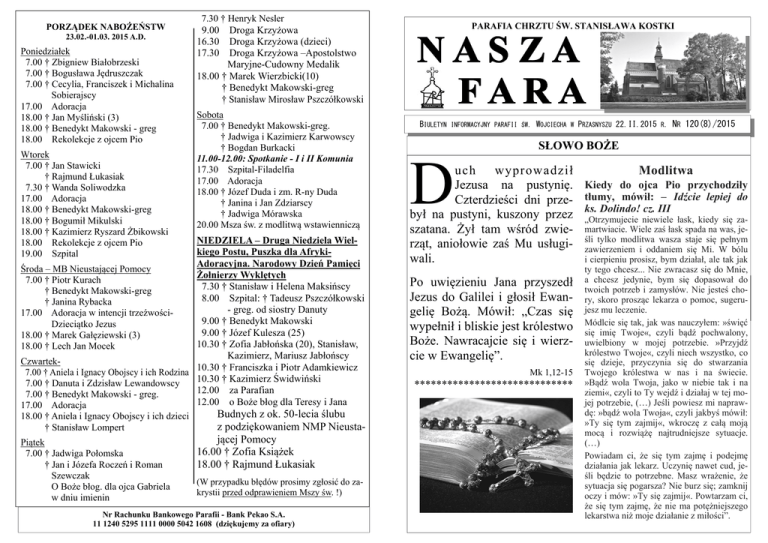 PORZĄDEK NABOŻEŃSTW 23.02.-01.03. 2015 A.D. Poniedziałek 7.00 † Zbigniew Białobrzeski 7.00 † Bogusława Jędruszczak 7.00 † Cecylia, Franciszek i Michalina Sobierajscy 17.00 Adoracja 18.00 † Jan Myśliński (3) 18.00 † Benedykt Makowski - greg 18.00 Rekolekcje z ojcem Pio Wtorek 7.00 † Jan Stawicki † Rajmund Łukasiak 7.30 † Wanda Soliwodzka 17.00 Adoracja 18.00 † Benedykt Makowski-greg 18.00 † Bogumił Mikulski 18.00 † Kazimierz Ryszard Żbikowski 18.00 Rekolekcje z ojcem Pio 19.00 Szpital 7.30 † Henryk Nesler 9.00 Droga Krzyżowa 16.30 Droga Krzyżowa (dzieci) 17.30 Droga Krzyżowa –Apostolstwo Maryjne-Cudowny Medalik 18.00 † Marek Wierzbicki(10) † Benedykt Makowski-greg † Stanisław Mirosław Pszczółkowski Sobota 7.00 † Benedykt Makowski-greg. † Jadwiga i Kazimierz Karwowscy † Bogdan Burkacki 11.00-12.00: Spotkanie - I i II Komunia 17.30 Szpital-Filadelfia 17.00 Adoracja 18.00 † Józef Duda i zm. R-ny Duda † Janina i Jan Zdziarscy † Jadwiga Mórawska 20.00 Msza św. z modlitwą wstawienniczą NIEDZIELA – Druga Niedziela Wielkiego Postu, Puszka dla AfrykiAdoracyjna. Narodowy Dzień Pamięci Środa – MB Nieustającej Pomocy Żołnierzy Wyklętych 7.00 † Piotr Kurach 7.30 † Stanisław i Helena Maksińscy † Benedykt Makowski-greg 8.00 Szpital: † Tadeusz Pszczółkowski † Janina Rybacka - greg. od siostry Danuty 17.00 Adoracja w intencji trzeźwości9.00 † Benedykt Makowski Dzieciątko Jezus 9.00 † Józef Kulesza (25) 18.00 † Marek Gałęziewski (3) 10.30 † Zofia Jabłońska (20), Stanisław, 18.00 † Lech Jan Mocek Kazimierz, Mariusz Jabłońscy Czwartek10.30 † Franciszka i Piotr Adamkiewicz 7.00 † Aniela i Ignacy Obojscy i ich Rodzina 10.30 † Kazimierz Świdwiński 7.00 † Danuta i Zdzisław Lewandowscy 12.00 za Parafian 7.00 † Benedykt Makowski - greg. 12.00 o Boże błog dla Teresy i Jana 17.00 Adoracja Budnych z ok. 50-lecia ślubu 18.00 † Aniela i Ignacy Obojscy i ich dzieci z podziękowaniem NMP Nieusta† Stanisław Lompert Piątek 7.00 † Jadwiga Połomska † Jan i Józefa Roczeń i Roman Szewczak O Boże błog. dla ojca Gabriela w dniu imienin jącej Pomocy 16.00 † Zofia Książek 18.00 † Rajmund Łukasiak (W przypadku błędów prosimy zgłosić do zakrystii przed odprawieniem Mszy św. !) Nr Rachunku Bankowego Parafii - Bank Pekao S.A. 11 1240 5295 1111 0000 5042 1608 (dziękujemy za ofiary) PARAFIA CHRZTU ŚW. STANISŁAWA KOSTKI BIULETYN INFORMACYJNY PARAFII ŚW. WOJCIECHA W PRZASNYSZU 22.II.2015 R. NR 120(8)/2015 D SŁOWO BOŻE Modlitwa uch wyprowadził Jezusa na pustynię. Kiedy do ojca Pio przychodziły Czterdzieści dni prze- tłumy, mówił: – Idźcie lepiej do ks. Dolindo! cz. III był na pustyni, kuszony przez „Otrzymujecie niewiele łask, kiedy się zaszatana. Żył tam wśród zwie- martwiacie. Wiele zaś łask spada na was, jeśli tylko modlitwa wasza staje się pełnym rząt, aniołowie zaś Mu usługi- zawierzeniem i oddaniem się Mi. W bólu i cierpieniu prosisz, bym działał, ale tak jak wali. Po uwięzieniu Jana przyszedł Jezus do Galilei i głosił Ewangelię Bożą. Mówił: „Czas się wypełnił i bliskie jest królestwo Boże. Nawracajcie się i wierzcie w Ewangelię”. Mk 1,12-15 ***************************** ty tego chcesz... Nie zwracasz się do Mnie, a chcesz jedynie, bym się dopasował do twoich potrzeb i zamysłów. Nie jesteś chory, skoro prosząc lekarza o pomoc, sugerujesz mu leczenie. Módlcie się tak, jak was nauczyłem: »święć się imię Twoje«, czyli bądź pochwalony, uwielbiony w mojej potrzebie. »Przyjdź królestwo Twoje«, czyli niech wszystko, co się dzieje, przyczynia się do stwarzania Twojego królestwa w nas i na świecie. »Bądź wola Twoja, jako w niebie tak i na ziemi«, czyli to Ty wejdź i działaj w tej mojej potrzebie, (…) Jeśli powiesz mi naprawdę: »bądź wola Twoja«, czyli jakbyś mówił: »Ty się tym zajmij«, wkroczę z całą moją mocą i rozwiążę najtrudniejsze sytuacje. (…) Powiadam ci, że się tym zajmę i podejmę działania jak lekarz. Uczynię nawet cud, jeśli będzie to potrzebne. Masz wrażenie, że sytuacja się pogarsza? Nie burz się; zamknij oczy i mów: »Ty się zajmij«. Powtarzam ci, że się tym zajmę, że nie ma potężniejszego lekarstwa niż moje działanie z miłości”. Katecheza o braterstwie Audiencja ogólna Źródło: dg/rv | Data publikacji: 2015 Nic nie zdoła nam zastąpić doświadczenia, jakie zdobywamy dzięki temu, że w rodzinie mamy brata czy siostrę. To właśnie rodzina wnosi do świata braterstwo – mówił Papież na audiencji ogólnej. W kolejnej katechezie o rodzinie zatrzymał się tym razem nad rodzeństwem i doświadczeniem braterstwa. Przypomniał, że dla chrześcijaństwa słowa brat i siostra są szczególnie ważne. Piękno braterstwa opiewa Słowo Boże, a Chrystus rozciąga je poza granice pokrewieństwa na wszystkich ludzi. Natomiast naruszenie braterstwa – mówił Franciszek – prowadzi do konfliktów, zdrady, nienawiści. „Zerwanie relacji między braćmi jest czymś złym i szkodliwym dla ludzkości – stwierdził Ojciec Święty. – To przykry widok, kiedy w rodzinie rodzeństwo kłóci się o małe rzeczy czy o spadek, a potem ze sobą nie rozmawiają, nie pozdrawiają się... Braterstwo to wielka rzecz. Pomyślmy, że każdy z rodzeństwa był przez dziewięć miesięcy w tym samym łonie matki, że wszyscy pochodzą z tego samego ciała matki. Nie wolno zrywać więzów braterstwa. Wszyscy jednak znamy rodziny, w których rodzeństwo jest podzielone, skłócone. Pomyślmy o nich i prośmy Pana Boga w intencji tych rodzin. Być może i w naszej rodzinie są takie przypadki. Prośmy Pana, aby pomógł nam zjednoczyć rodzeństwo, odbudować rodzinę. Więzów braterstwa nie wolno zrywać. A kiedy się to stanie, dochodzi to tego, co wydarzyło się między Kainem i Ablem”. Ojciec Święty przypomniał, że to właśnie w rodzinie