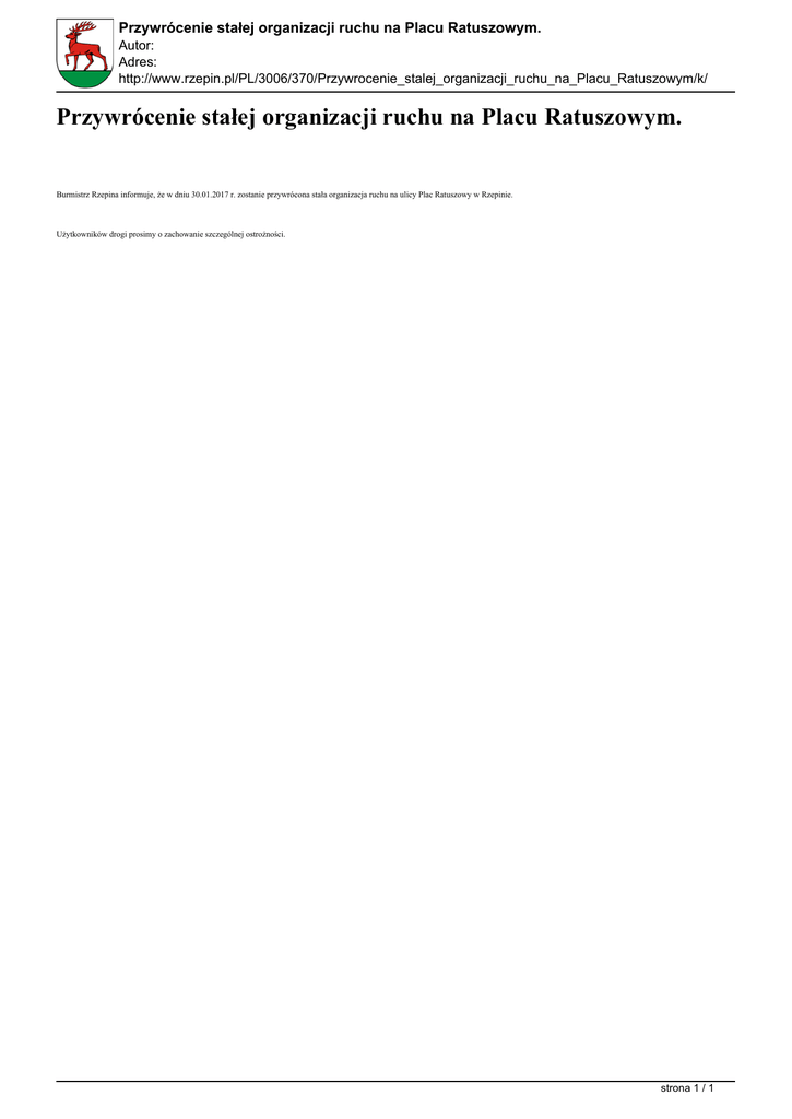 Przywrócenie stałej organizacji ruchu na Placu Ratuszowym. Autor: Adres: http://www.rzepin.pl/PL/3006/370/Przywrocenie_stalej_organizacji_ruchu_na_Placu_Ratuszowym/k/ Przywrócenie stałej organizacji ruchu na Placu Ratuszowym. Burmistrz Rzepina informuje, że w dniu 30.01.2017 r. zostanie przywrócona stała organizacja ruchu na ulicy Plac Ratuszowy w Rzepinie. Użytkowników drogi prosimy o zachowanie szczególnej ostrożności. strona 1 / 1 Powered by TCPDF (www.tcpdf.org)
