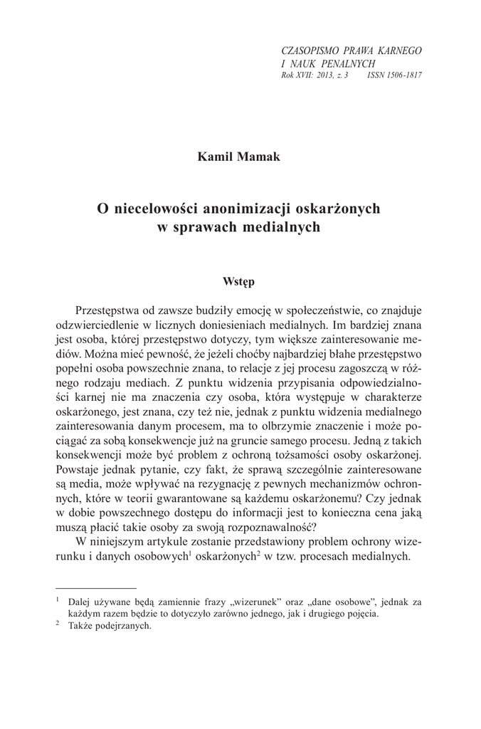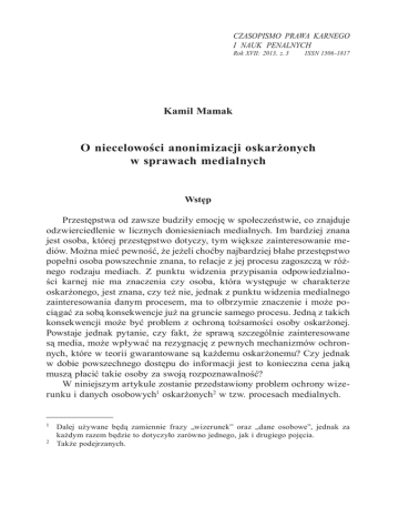 czasopismo Prawa karnego i nauk penalnych Rok XVII: 2013, z. 3 ISSN 1506-1817 Kamil Mamak O niecelowości anonimizacji oskarżonych w sprawach medialnych Wstęp Przestępstwa od zawsze budziły emocję w społeczeństwie, co znajduje odzwierciedlenie w licznych doniesieniach medialnych. Im bardziej znana jest osoba, której przestępstwo dotyczy, tym większe zainteresowanie mediów. Można mieć pewność, że jeżeli choćby najbardziej błahe przestępstwo popełni osoba powszechnie znana, to relacje z jej procesu zagoszczą w różnego rodzaju mediach. Z punktu widzenia przypisania odpowiedzialności karnej nie ma znaczenia czy osoba, która występuje w charakterze oskarżonego, jest znana, czy też nie, jednak z punktu widzenia medialnego zainteresowania danym procesem, ma to olbrzymie znaczenie i może pociągać za sobą konsekwencje już na gruncie samego procesu. Jedną z takich konsekwencji może być problem z ochroną tożsamości osoby oskarżonej. Powstaje jednak pytanie, czy fakt, że sprawą szczególnie zainteresowane są media, może wpływać na rezygnację z pewnych mechanizmów ochronnych, które w teorii gwarantowane są każdemu oskarżonemu? Czy jednak w dobie powszechnego dostępu do informacji jest to konieczna cena jaką muszą płacić takie osoby za swoją rozpoznawalność? W niniejszym artykule zostanie przedstawiony problem ochrony wizerunku i danych osobowych1 oskarżonych2 w tzw. procesach medialnych. 1 Dalej używane będą zamiennie frazy „wizerunek” oraz „dane osobowe”, jednak za każdym razem będzie to dotyczyło zarówno jednego, jak i drugiego pojęcia. 2 Także podejrzanych. 72 Kamil Mamak Jak być powinno? Wydaje się, że powszechnie akceptowane jest twierdzenie, że wizerunek oraz dane osobowe osoby, przeciwko której toczy się postępowanie karne, powinny być chronione. Ochroną powinny być objęte wszystkie podmioty, niezależnie od ich właściwości, a więc także osoby publicznie znane. Zaznaczyć jednak trzeba, że w przypadku tej ostatniej grupy podmiotów zdania w piśmiennictwie są podzielone3. Uzasadnienie dla ochrony wizerunku i danych osobowych osoby oskarżonej znajdziemy w wielu gałęziach prawa, także poza prawem karnym. Przepisy, które pomagają chronić wizerunek wynikają także m.in. z prawa międzynarodowego, konstytucyjnego, prasowego, autorskiego czy cywilnego. Z każdą z tych regulacji związane jest trochę inne uzasadnienie, jednak w konsekwencji prowadzą one do tego samego – do ochrony wizerunku i danych osobowych. Jak wskazano, ochrona oskarżonego w omawianym zakresie następuje wielotorowo, na wielu płaszczyznach prawnych, jednak najważniejszą z nich wydaje się ta, która związana jest z zasadą domniemania niewinności. Z tego powodu dalsze rozważania zostaną zawężone do tej zasady. Doniosłość zasady domniemania niewinności wynika chociażby z aktów prawnych, z których się ją wyprowadza. Oprócz Kodeksu postępowania karnego i jego art. 5 § 14, znajduje się ona także w art. 42 ust. 3 Konstytucji5. Swoje potwierdzenie znajduje także w przepisach prawa międzynarodowego, zarówno w Europejskiej Konwencji Praw Człowieka i Podstawowych Wolności (art. 6 ust. 26), jak i w Międzynarodowy Pakcie Praw Obywatelskich i Politycznych (art. 14 ust. 27). W doktrynie uznaje się, że z zasady tej wynika obowiązek traktowania oskarżonego jak niewinnego, dopóki nie zostanie mu udowodniona wina, w sposób przewidziany przez prawo karne procesowe8. 3 Por. J. B a r t a, R. M a r k i e w i c z, Media a dobra osobiste, Warszawa 2009, s. 265–266 wraz ze wskazaną tam literaturą. 4 Oskarżonego uważa się za niewinnego, dopóki wina jego nie zostanie udowodniona i stwierdzona prawomocnym wyrokiem. 5 Każdego uważa się za niewinnego, dopóki jego wina nie zostanie stwierdzona prawomocnym wyrokiem sądu. 6 Każdego oskarżonego o popełnienie czynu zagrożonego karą uważa się za niewinnego do czasu udowodnienia mu winy zgodnie z ustawą. 7 Każda osoba oskarżona o popełnienie przestępstwa ma prawo być uważana za niewinną aż do udowodnienia jej winy zgodnie z ustawą. 8 S. W a l t o ś, Proces karny. Zarys systemu, Warszawa 2009, s. 246. O niecelowości anonimizacji oskarżonych w sprawach medialnych 73 Wątpliwości może budzić kwestia adresatów tej zasady. Co do organów procesowych nie ma żadnej wątpliwości, jednak co z innymi podmiotami? Stanisław Waltoś uznaje, że zasada ta skierowana jest także do osób fizycznych, które mają obowiązek powstrzymywania się z podejmowaniem niekorzystnych kroków wobec oskarżonego, zanim wina zostanie mu wykazana, oraz do przedstawicieli prasy, którzy nie powinni na jej łamach przesądzać o winie oskarżonego, czyli wydawać tzw. wyroków prasowych9. W kontekście wspomnianych adresatów zasady domniemania niewinności można mówić o dwóch jej aspektach. Włodzimierz Wróbel wprowadza podział na wewnętrzy i zewnętrzny charakter obowiązywania zasady domniemania niewonności, z czego aspekt wewnętrzny dotyczy postępowania karnego, a aspekt zewnętrzny wychodzi poza te ramy i dotyczy innych organów władzy publicznej (poza tymi bezpośrednio zaangażowanymi w prowadzenie postępowania), oraz innych obywateli10. Z uwagi na fakt, że doniesienia o toczących się postępowaniach karnych są przygotowywane i publikowane w mediach przez osoby stojące formalnie poza procesem karnym, to dalsze rozważania będą zawężone do zewnętrznego charakteru obowiązywania omawianej zasady. Właściwe realizowanie zasady domniemania niewinności na gruncie procesu regulowane jest przez przepisy Kodeksu postępowania karnego, których naruszenie wiązać się może z konsekwencjami na jego polu. Mechanizmy gwarancyjne w zewnętrznym jej aspekcie nie są jednak tak sformalizowane. Przykładowo, dbając o właściwą realizację zasady domniemania niewinności wymaga się od społeczeństwa powściągliwości w ferowaniu wyroków11 o
