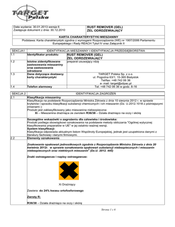 Data wydania: 30.01.2013 wersja 6 Zastępuje dokument z dnia: 30.12.2010 RUST REMOVER (GEL) śEL ODRDZEWIAJĄCY KARTA CHARAKTERYSTYKI MIESZANINY Podstawa: Karta charakterystyki zgodna z wymogami Rozporządzenia (WE) nr 1907/2006 Parlamentu Europejskiego i Rady REACH Tytuł IV oraz Załącznik II SEKCJA1. IDENTYFIKACJA MIESZANINY I IDENTYFIKACJA PRZEDSIĘBIORSTWA 1.1 Identyfikator produktu RUST REMOVER (GEL) śEL ODRDZEWIAJĄCY 1.2 1.3 1.4 Istotne zidentyfikowane zastosowania mieszaniny oraz zastosowania odradzane Dane dotyczące dostawcy karty charakterystyki preparat usuwający rdzę Telefon alarmowy TARGET Polska Sp. z o.o. ul. Pogodna 63/1; 15-365 Białystok Tel/fax: +48 742 06 36 e- mail: [email protected] Tel: +48 742 06 36 w godz. 8-16 IDENTYFIKACJA ZAGROśEŃ SEKCJA 2 2.1 Klasyfikacja mieszaniny Klasyfikacja na podstawie Rozporządzenia Ministra Zdrowia z dnia 10 sierpnia 2012 r. w sprawie kryteriów i sposobu klasyfikacji substancji chemicznych i ich mieszanin (Dz. U.2012.1018 z późniejszymi zmianami ): Produkt jest zaklasyfikowany jako mieszanina niebezpieczna: Xi – Mieszanina draŜniąca ze zwrotem R36/38 – Działa draŜniąco na oczy i skórę 2.2 Szczególne wskazówki o zagroŜeniu dla człowieka i środowiska: Produkt podlega obowiązkowi oznakowania na podstawie metody obliczania "Ogólnej wytycznej klasyfikowania preparatów w UE" w jej ostatnio waŜnej wersji. System klasyfikacji: Klasyfikacja odpowiada aktualnym listom Wspólnoty Europejskiej, jednak jest uzupełniona danymi z literatury fachowej i danymi firmowymi. Elementy oznakowania Znakowanie opakowań jednostkowych zgodnie z Rozporządzenie Ministra Zdrowia z dnia 20 kwietnia 2012r. w sprawie oznakowania opakowań substancji niebezpiecznych i mieszanin niebezpiecznych oraz niektórych mieszanin2 (Dz.U. 2012. 445) Znaki ostrzegawcze i napisy ostrzegawcze: Xi DraŜniący Zawiera: do 24% kwasu ortofosforowego Zwroty R: R36/38 – Działa draŜniąco na oczy i skórę Strona 1 z 6 SEKCJA 2 IDENTYFIKACJA ZAGROśEŃ Zwroty S: S2 Chronić przed dziećmi. S26 Zanieczyszczone oczy przemyć natychmiast duŜa ilością wody i zasięgnąć porady lekarza. S46 W razie połknięcia niezwłocznie zasięgnij porady lekarza - pokaz opakowanie lub etykietę. Inne zagroŜenia: brak 2.3 SEKCJA 3 SKŁAD/INFORMACJA O SKŁADNIKACH 3.2 Mieszanina Składniki niebezpieczne zawarte w produkcie: Nazwa Zawartość Nr CAS Nr WE (EINECS) Nr indeksowy Klasyfikacja w% wg. dyrektywy 67/548/EWG C R34; Kwas ortofosforowy (V) 75 % 203-872-2 015-011-00-6 10-24 7664-38-2 Klasyfikacja wg rozporządzenia 1272/2008 Skin Corr., H314; Gdzie: C - Produkt Ŝrący R34 - Powoduje oparzenia Skin Corr. – Działa Ŝrąco na skórę H314 - Powoduje powaŜne oparzenia skóry oraz uszkodzenia oczu ŚRODKI PIERWSZEJ POMOCY SEKCJA 4. 4.1 Opis środków pierwszej pomocy Wdychanie W przypadku zatrucia drogą oddechową wyprowadzić lub wynieść poszkodowanego na świeŜe powietrze i zapewnić warunki do odpoczynku. Skóra Natychmiast zmyć woda i mydłem i dobrze spłukać. Oczy Wyjąć szkła kontaktowe. Niezwłocznie płukać oczy delikatnym strumieniem wody przy podwiniętych powiekach, przez co najmniej 15 minut. Niezwłocznie zasięgnąć porady lekarza. Połknięcie Nie wywoływać wymiotów bez zaleceń lekarza. Przepłukać usta wodą. Zapewnić ciepło i spokój. Wezwać lekarza. PokaŜ opakowanie lub etykietę produktu. 4.2 NajwaŜniejsze ostre i opóźnione objawy oraz skutki naraŜenia Brak dostępnych dalszych istotnych danych 4.3 Wskazania dotyczące wszelkiej natychmiastowej pomocy lekarskiej i szczególnego postępowania z poszkodowanym Brak dostępnych dalszych istotnych danych SEKCJA 5. POSTĘPOWANIE W PRZYPADKU POśARU 5.1 Środki gaśnicze: Odpowiednie środki gaśnicze: Stosować ditlenek węgla, suche proszki gaśnicze, zwykłą pianę gaśniczą, rozpyloną wodę w zaleŜności od otoczenia. Nieodpowiednie środki gaśnicze: Brak danych 5.2 Szczególne zagroŜenie związane z mieszaniną: Podczas spalania mogą uwalniać się następujące substancje/ grupy substancji: Dwutlenek węgla, tlenek węgla, Strona 2 z 6 SEKCJA 5. POSTĘPOWANIE W PRZYPADKU POśARU 5.3 Informacje dla straŜy poŜarnej: Nosić izolacyjne aparaty oddechowe z niezaleŜnym źródłem powietrza i kombinezony ochronne. SEKCJA 6 POSTĘPOWANIE W PRZYPADKU NIEZAMIERZONEGO UWOLNIENIA DO ŚRODOWISKA 6.1 Indywidualne środki ostroŜności, wyposaŜenie ochronne i procedury w sytuacjach awaryjnych: Stosować ubranie robocze, odpowiednie rękawice ochronne, odpowiednie okulary ochronne 6.2. 6.3. 6.4. Środki ostroŜności w zakresie ochrony środowiska: Nie dopuszczać do przedostawania się produktu do kanalizacji, wód powierzchniowych i wód gruntowych. W przypadku skaŜenia środowiska zawiadomić odpowiednie władze lokalne. Metody i materiały zapobiegające rozprzestrzenianiu się skaŜenia i słuŜące do usuwania skaŜenia: Zebrać za pomocą materiału wiąŜącego ciecze (piasek, ziemia okrzemkowa, materiał wiąŜący kwasy, materiał wiąŜący uniwersalny, trociny). W odpowiednich pojemnikach dostarczyć do odzysku lub utylizacji. Odniesienia do innych sekcji Informacje na temat bezpiecznej obsługi patrz rozdział 7. Informacje na temat osobistego wyposaŜenia ochronnego patrz rozdział 8. Informacje na temat utylizacji patrz rozdział 13. SEKCJA 7. POSTĘPOWANIE Z MIESZANINĄ I JEJ MAGAZYNOWANIE 7.1 Środki ostroŜności dotyczące bezpiecznego postępowania: Składować w dobrze zamkniętych opakowaniach w chłodnych i suchych miejscach. Wskazówki dla ochrony przeciwpoŜarowej i przeciwwybuchowej: Nie są potrzebne szczególne zabiegi. 7.2. Warunki bezpiecznego magazynowania, łącznie z informacjami dotyczącymi wszelkich wzajemnych niezgodności. Przechowywać w oryginalnych, szczelnie zamkniętych pojemnikach. Optymalna temperatura magazynowania od +5° C do +25° C. Nie dopuszczać do zamarzania produktu. Nie przechowywać z Ŝywnością, napojami i paszą