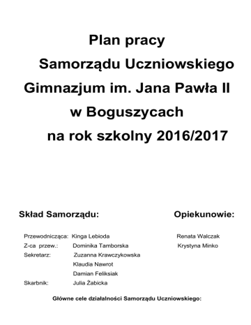 Plan pracy Samorządu Uczniowskiego Gimnazjum im. Jana Pawła II w Boguszycach na rok szkolny 2016/2017 Skład Samorządu: Opiekunowie: Przewodnicząca: Kinga Lebioda Renata Walczak Z-ca przew.: Dominika Tamborska Krystyna Minko Sekretarz: Zuzanna Krawczykowska Klaudia Nawrot Damian Feliksiak Skarbnik: Julia Żabicka Główne cele działalności Samorządu Uczniowskiego: Budowanie wśród uczniów poczucia własnej wartości i przydatności działania na rzecz szkoły; Urzeczywistnienie idei wolności poprzez rozumienie i poszanowanie elementarnych praw człowieka; Kształtowanie zdrowego i bezpiecznego stylu życia i inspirowanie harmonijnego rozwoju; Założenia na rok szkolny 2016/2017: Przygotowanie uczniów do świadomego i odpowiedzialnego uczestnictwa w życiu społecznym; Stwarzanie sytuacji dających możliwość wykazania inicjatywy samorządowej w bezinteresownym działaniu na rzecz szkoły i środowiska; Ukazywanie sensu praw i obowiązków, zasad i reguł, nakazów i zakazów obowiązujących w życiu społecznym; Integrowanie wychowawczych działań szkoły i rodziny oraz środowiska lokalnego; Kultywowanie tradycji i obrzędów szkolnych; Rozwijanie prawidłowych zachowań sprzyjających bezpieczeństwu w różnych sytuacjach; Uświadomienie roli dziecka jako ucznia w rodzinie i społeczności lokalnej. Prace w ciągu roku szkolnego: organizowanie zebrań samorządu uczniowskiego współdziałanie z władzami szkolnymi i wychowawcami klas prowadzenie gazetki ściennej samorządu uczniowskiego udział w akcjach charytatywnych współudział w uroczystościach szkolnych Działalność samorządu uczniowskiego poddawana jest ciągłej ewaluacji w związku z czym pewne działania zawarte w planie pracy mogą ulec zmianom. 2 Zadania Formy realizacji Termin wybory przedstawicieli do samorządu przez poszczególne klasy, samorządu, 1. Wybory samorządu kampania wyborcza i wybory do podział samorządu na sekcje: dekoracyjną, informacyjną do uczniowskiego spraw akcji różnych (np. charytatywnych) i określenie zadań każdej z nich wypisanie propozycji zgłaszanych przez przedstawicieli samorządu do 2. Opracowanie planu pracy wrzesień planu pracy, samorządu ustalenie harmonogramu zadań i określenie terminów ich realizacji oraz osób odpowiedzialnych za ich wykonanie wręczenie wszystkim chłopcom 3. Dzień Chłopca słodkiego upominku gazetka okolicznościowa na holu szkolnym 4. Dzień Edukacji Narodowej współudział w przygotowaniu uroczystości zakup kwiatów dla wszystkich październik pracowników szkoły 5. Narodowe Święto Niepodległości 6. Andrzejki 7. Wszystkich Świętych gazetka na holu szkolnym współudział w przygotowaniu akademii, gazetka na holu szkolnym organizacja dyskoteki andrzejkowej przygotowanie wróżb gazetka na holu szkolnym kwiaty i znicze pod tablicą listopad pamiątkową Jana Pawła II 3 8. Góra Grosza charytatywne 9. Wigilia w szkole 10. Wielka Orkiestra pomoc w zbiórce pieniędzy na cele współudział w przygotowaniu uroczystości konkurs na świąteczny plakat gazetka na holu szkolnym udział w zbiórce pieniędzy pomoc w organizacji zabawy grudzień Świątecznej Pomocy 11. Zabawa choinkowej (przygotowanie holu oraz choinkowa 12. Zebranie styczeń zgody na udział uczniów w zabawie) podsumowujące przygotowanie listy uczniów z najlepszą średnią ocen w szkole I półrocze przygotowanie skrzynki na kartki walentynkowe doręczanie korespondencji walentynkowej przez „szkolnych listonoszy” 13. Walentynki luty pomoc przy wykonaniu dekoracji w szkole 14. Święto Kobiet 15. Powitanie wiosny gazetka na holu szkolnym zakup kwiatów dla wszystkich pań gazetka na holu szkolnym przygotowanie zabaw i konkursów wspólna zabawa na sali marzec gimnastycznej 16. Wielkanoc 17. Rocznica uchwalenia konkurs na najładniejszą kartkę świąteczną gazetka na holu szkolnym pomoc w przygotowaniu akademii gazetka na holu szkolnym kwiecień 4 Konstytucji 3 Maja 18. Dzień Patrona przygotowanie dekoracji pomoc w przygotowaniu akademii pomoc w zorganizowaniu imprezy sportowej polegającej na rywalizacji 19. Dzień Sportu maj między klasami w różnych konkursach, zawodach i dyscyplinach 20. Wakacje tuż, tuż porządkowanie materiałów SU opracowanie wniosków do pracy na następny rok 21. Pożegnanie absolwentów współudział w przygotowaniu czerwiec akademii pożegnalnej dekoracja sali gimnastycznej 5