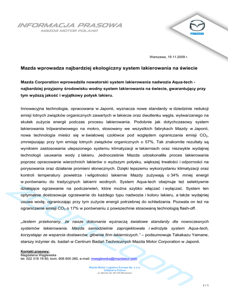 Warszawa, 19.11.2009 r. Mazda wprowadza najbardziej ekologiczny system lakierowania na *wiecie Mazda Corporation wprowadzi a nowatorski system lakierowania nadwozia Aqua-tech najbardziej przyjazny *rodowisku wodny system lakierowania na *wiecie, gwarantuj/cy przy tym wy sz/ jako*0 i wyj/tkowy po ysk lakieru. Innowacyjna technologia, opracowana w Japonii, wyznacza nowe standardy w dziedzinie redukcji emisji lotnych zwi!zków organicznych zawartych w lakierze oraz dwutlenku w#gla, wytwarzanego na skutek zu$ycia energii podczas procesu lakierowania. Podobnie jak dotychczasowy system lakierowania trójwarstwowego na mokro, stosowany we wszystkich fabrykach Mazdy w Japonii, nowa technologia mie)ci si# w )wiatowej czo*ówce pod wzgl#dem ograniczania emisji CO2, zmniejszaj!c przy tym emisj# lotnych zwi!zków organicznych o 57%. Tak znakomite rezultaty s! wynikiem zastosowania ulepszonego systemu klimatyzacji w lakierniach oraz niezwykle wydajnej technologii usuwania wody z lakieru. Jednocze)nie Mazda udoskonali*a proces lakierowania poprzez opracowanie wierzchnich lakierów o wy$szym po*ysku, wi#kszej trwa*o)ci i odporno)ci na porysowania oraz dzia*anie promieni s*onecznych. Dzi#ki lepszemu wykorzystaniu klimatyzacji oraz kontroli temperatury powietrza i wilgotno)ci lakiernie Mazdy zu$ywaj! o 34% mniej energii w porównaniu do tradycyjnych lakierni wodnych. System Aqua-tech obejmuje te$ selektywnie dzia*aj!ce ogrzewanie na podczerwie8, które mo$na szybko w*!cza9 i wy*!cza9. System ten optymalnie dostosowuje ogrzewanie do ka$dego typu nadwozia i koloru lakieru, a tak$e wydajniej usuwa wod#, ograniczaj!c przy tym zu$ycie energii potrzebnej do sch*adzania. Pozwala on te$ na ograniczenie emisji CO2 o 17% w porównaniu z powszechnie stosowan! technologi! flash-off. „Jestem przekonany, e nasze dokonania wyznacz wiatowe standardy dla nowoczesnych systemów lakierowania. Mazda samodzielnie zaprojektowa a i wdro y a system Aqua-tech, korzystaj c ze wsparcia dostawców, g ównie firm lakierniczych.” – podsumowuje Takakazu Yamane, starszy in$ynier ds. bada8 w Centrum Bada8 Technicznych Mazda Motor Corporation w Japonii. Kontakt prasowy: Magdalena W#glewska tel. 022 318 19 80, kom. 606 600 260, e-mail: [email protected] Mazda Motor Logistics Europe Sp. z o.o. Oddzia w Polsce ul. I ecka 24, 02-135 Warszawa 1/1