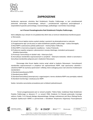 ZAPROSZENIE Serdecznie zapraszam członków Rad Działalności Pożytku Publicznego, w tym przedstawicieli jednostek samorządu terytorialnego, radnych i przedstawicieli organizacji pozarządowych z województw kujawsko-pomorskiego, mazowieckiego, podlaskiego i warmińsko-mazurskiego na II Forum Ponadregionalne Rad Działalności Pożytku Publicznego, które odbędzie się w dniach 21-22 października 2014 roku w Centrum Szkoleniowo-Konferencyjnym w Warszawie. W ramach Forum będzie można uzyskać wiedzę i wymienić się doświadczeniami w zakresie: 1) Przygotowanie ngo i jst do pracy w radzie działalności pożytku publicznego – Łukasz Domagała, 2) Rola RDPP w planowaniu polityk publicznych – Andrzej Rybus-Tołłoczko, 3) Rola RDPP w tworzeniu programu współpracy – Łukasz Prykowski, 4) Praktyczne aspekty związane z planowaniem rozwoju lokalnego, metodami partycypacji – Wioletta Gawrońska, 5) Promocja i komunikacja nt działań rady – Katarzyna Zych, 6) Konsultacje standardów wypracowanych w projekcie - Katarzyna Łotowska. Udział w warsztacie z konsultacji standardów połączony jest z badaniem fokusowym. Pierwszego dnia forum będzie można wziąć udział w badaniu fokusowym i konsultacjach standardów wypracowanych w projekcie lub zaprezentować RDPP, stąd zapraszamy członków i członkinie RDPP do wymiany spostrzeżeń i refleksji, które wzbogacą prace nad czterema modelowymi standardami: 1) Standard powoływania RDPP, 2) Standard pracy RDPP, 3) Standard komunikacji (wewnętrznej z organizacjami z terenu działania RDPP oraz pomiędzy radami) 4) Standard monitoringu i ewaluacji prac RDPP. Każdy z tematów warsztatów prowadzony jest w blokach jednodniowych. Forum przygotowywane jest w ramach projektu "Dobre Rady: modelowe Rady Działalności Pożytku Publicznego w obszarze 2", w ramach POKL Działanie 5.4 Rozwój potencjału trzeciego sektora, Poddz. 5.4.2 Rozwój dialogu obywatelskiego, którego realizatorem jest Biuro Obsługi Ruchu Inicjatyw Społecznych BORIS w partnerstwie z Ośrodkiem Wspierania Organizacji Pozarządowych OWOP, Elbląskim Stowarzyszeniem Wspierania Inicjatyw Pozarządowych, Stowarzyszeniem Kujawsko-Pomorskim Ośrodkiem Wsparcia Inicjatyw Pozarządowych TŁOK oraz Samorządem Województwa Mazowieckiego. Projekt uczestniczy w ogólnopolskiej akcji „Splot rad dla Rad”, prowadzonej przez Sieć Wspierania Organizacji Pozarządowych SPLOT. Jej celem jest zwiększenie uczestnictwa obywateli w zarządzaniu wspólnotą lokalną poprzez promocję rad działalności pożytku publicznego i innych mechanizmów partycypacji (więcej: www.siecsplot.pl). Udział w Forum jest bezpłatny. Uczestnicy mają zapewnione zakwaterowanie i wyżywienie oraz zwrot kosztów podróży do 100 zł. Podpisane zgłoszenia należy przesłać do dnia 25 września 2014 r.(fax. 056 655 50 22 e-mail: [email protected]). Szczegółowych informacji udziela: Iga Sypek, tel: 500 127 355, e-mail: [email protected]). W imieniu partnerstwa projektowego Ewa Kwiesielewicz-Szyszka Prezeska Stowarzyszenia TŁOK