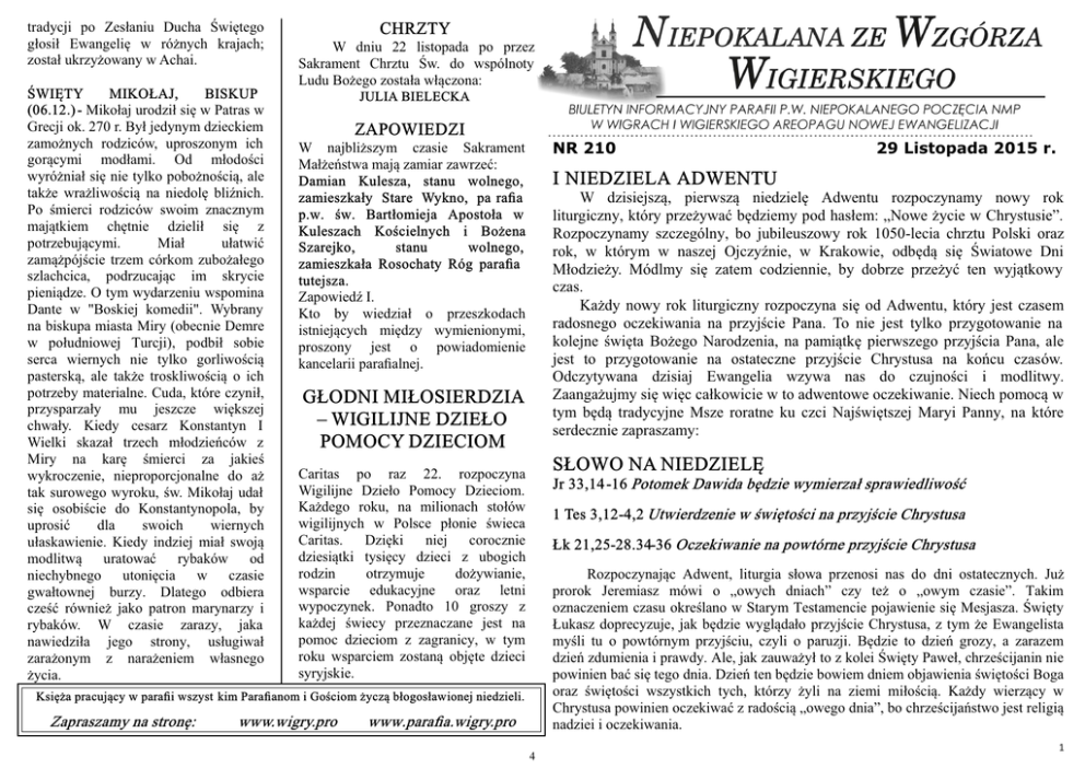 tradycji po Zesłaniu Ducha Świętego głosił Ewangelię w różnych krajach; został ukrzyżowany w Achai. ŚWIĘTY MIKOŁAJ, BISKUP (06.12.) - Mikołaj urodził się w Patras w Grecji ok. 270 r. Był jedynym dzieckiem zamożnych rodziców, uproszonym ich gorącymi modłami. Od młodości wyróżniał się nie tylko pobożnością, ale także wrażliwością na niedolę bliźnich. Po śmierci rodziców swoim znacznym majątkiem chętnie dzielił się z potrzebującymi. Miał ułatwić zamążpójście trzem córkom zubożałego szlachcica, podrzucając im skrycie pieniądze. O tym wydarzeniu wspomina Dante w "Boskiej komedii". Wybrany na biskupa miasta Miry (obecnie Demre w południowej Turcji), podbił sobie serca wiernych nie tylko gorliwością pasterską, ale także troskliwością o ich potrzeby materialne. Cuda, które czynił, przysparzały mu jeszcze większej chwały. Kiedy cesarz Konstantyn I Wielki skazał trzech młodzieńców z Miry na karę śmierci za jakieś wykroczenie, nieproporcjonalne do aż tak surowego wyroku, św. Mikołaj udał się osobiście do Konstantynopola, by uprosić dla swoich wiernych ułaskawienie. Kiedy indziej miał swoją modlitwą uratować rybaków od niechybnego utonięcia w czasie gwałtownej burzy. Dlatego odbiera cześć również jako patron marynarzy i rybaków. W czasie zarazy, jaka nawiedziła jego strony, usługiwał zarażonym z narażeniem własnego życia. CHRZTY W dniu 22 listopada po przez Sakrament Chrztu Św. do wspólnoty Ludu Bożego została włączona: JULIA BIELECKA ZAPOWIEDZI NR 210 W najbliższym czasie Sakrament Małżeństwa mają zamiar zawrzeć: Damian Kulesza, stanu wolnego, zamieszkały Stare Wykno, pa rafia p.w. św. Bartłomieja Apostoła w Kuleszach Kościelnych i Bożena Szarejko, stanu wolnego, zamieszkała Rosochaty Róg parafia tutejsza. Zapowiedź I. Kto by wiedział o przeszkodach istniejących między wymienionymi, proszony jest o powiadomienie kancelarii parafialnej. I NIEDZIELA ADWENTU W dzisiejszą, pierwszą niedzielę Adwentu rozpoczynamy nowy rok liturgiczny, który przeżywać będziemy pod hasłem: „Nowe życie w Chrystusie”. Rozpoczynamy szczególny, bo jubileuszowy rok 1050-lecia chrztu Polski oraz rok, w którym w naszej Ojczyźnie, w Krakowie, odbędą się Światowe Dni Młodzieży. Módlmy się zatem codziennie, by dobrze przeżyć ten wyjątkowy czas. Każdy nowy rok liturgiczny rozpoczyna się od Adwentu, który jest czasem radosnego oczekiwania na przyjście Pana. To nie jest tylko przygotowanie na kolejne święta Bożego Narodzenia, na pamiątkę pierwszego przyjścia Pana, ale jest to przygotowanie na ostateczne przyjście Chrystusa na końcu czasów. Odczytywana dzisiaj Ewangelia wzywa nas do czujności i modlitwy. Zaangażujmy się więc całkowicie w to adwentowe oczekiwanie. Niech pomocą w tym będą tradycyjne Msze roratne ku czci Najświętszej Maryi Panny, na które serdecznie zapraszamy: GŁODNI MIŁOSIERDZIA – WIGILIJNE DZIEŁO POMOCY DZIECIOM SŁOWO NA NIEDZIELĘ Caritas po raz 22. rozpoczyna Wigilijne Dzieło Pomocy Dzieciom. Każdego roku, na milionach stołów wigilijnych w Polsce płonie świeca Caritas. Dzięki niej corocznie dziesiątki tysięcy dzieci z ubogich rodzin otrzymuje dożywianie, wsparcie edukacyjne oraz letni wypoczynek. Ponadto 10 groszy z każdej świecy przeznaczane jest na pomoc dzieciom z zagranicy, w tym roku wsparciem zostaną objęte dzieci syryjskie. Jr 33,14 -16 Potomek Dawida będzie wymierzał sprawiedliwość 1 Tes 3,12-4,2 Utwierdzenie w świętości na przyjście Chrystusa Łk 21,25-28.34-36 Oczekiwanie na powtórne przyjście Chrystusa Rozpoczynając Adwent, liturgia słowa przenosi nas do dni ostatecznych. Już prorok Jeremiasz mówi o „owych dniach” czy też o „owym czasie”. Takim oznaczeniem czasu określano w Starym Testamencie pojawienie się Mesjasza. Święty Łukasz doprecyzuje, jak będzie wyglądało przyjście Chrystusa, z tym że Ewangelista myśli tu o powtórnym przyjściu, czyli o paruzji. Będzie to dzień grozy, a zarazem dzień zdumienia i prawdy. Ale, jak zauważył to z kolei Święty Paweł, chrześcijanin nie powinien bać się tego dnia. Dzień ten będzie bowiem dniem objawienia świętości Boga oraz świętości wszystkich tych, którzy żyli na ziemi miłością. Każdy wierzący w Chrystusa powinien oczekiwać z radością „owego dnia”, bo chrześcijaństwo jest religią nadziei i oczekiwania. Księża pracujący w parafii wszyst kim Parafianom i Gościom życzą błogosławionej niedzieli. Zapraszamy na stronę: www.wigry.pro 29 Listopada 2015 r. www.parafia.wigry.pro 4 1 KALENDARIUM LITURGICZNE 29.11. – Niedziela I Niedziela Adwentu. 30.11. – Poniedziałek Święto Św. Andrzeja Apostoła. 01.12. – Wtorek Dzień powszedni Adwentu. 02.12. – Środa Dzień powszedni Adwentu. 03.12. – Czwartek Wspomnienie Św. Franciszka Ksawerego, Prezbitera. Odwiedziny Chorych w parafii. 04.12. – Piątek I Dzień rekolekcji adwentowych w parafii. I piątek miesiąca. 05.12. – Sobota II Dzień rekolekcji adwentowych w parafii – dzień spowiedzi. I sobota miesiąca. 06.12. – Niedziela II Niedziela Adwentu. Uroczystość Niepokalanego Poczęcia NMP – przeniesiona z 8 grudnia. – Uroczystość Odpustowa w parafii. Zakończenie rekolekcji adwentowych. Wspomnienie Św. Mikołaja. INTENCJE MSZY ŚWIĘTEJ NIEDZIELA 29 Listopada 9:00 – Za zmarłych z miejscowości Tartak. 9:00 – Dziękczynna od mieszkańców Żubrówki N. i ST.. 11:30 – Za śp. Marianna Buczyńska (20r.śm.). 11:30 – Dziękczynna za otrzymane łaski i tegoroczne plony z prośbą o dalszą opiekę Bożą dla mieszkańców Czerwonego Folwarku. 13:30 – Za śp. Marian Świacki (3r.śm.), Zofia Świacka (25r.śm.) i zmarłych z rodziny Grudkowskich.. PONIEDZ IAŁEK 30 Listopada 18:00 – Za śp. Andrzej Malinowski (z okazji imienin). 18:30 – Za śp. Lucjan Biziewski (16r.śm.) i zmarłych z rodziny Biziewskich. 18:30 – Za śp.
