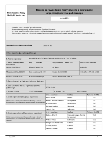 ZŽĐnjŶĞƐƉƌĂǁŽnjĚĂŶŝĞŵĞƌLJƚŽƌLJĐnjŶĞnjĚnjŝĂųĂůŶŽƑĐŝ ŽƌŐĂŶŝnjĂĐũŝƉŽǏLJƚŬƵƉƵďůŝĐnjŶĞŐŽ Ministerstwo Pracy ŝWŽůŝƚLJŬŝ^ƉŽųĞĐnjŶĞũ za rok 2014 • • • • &ŽƌŵƵůĂƌnjŶĂůĞǏLJǁLJƉĞųŶŝđǁũħnjLJŬƵƉŽůƐŬŝŵ͖ ^ƉƌĂǁŽnjĚĂǁĐĂǁLJƉĞųŶŝĂƚLJůŬŽƉƌnjĞnjŶĂĐnjŽŶĞĚůĂŶŝĞŐŽďŝĂųĞƉŽůĂ͖ tƚƌĂŬĐŝĞǁLJƉĞųŶŝĂŶŝĂĨŽƌŵƵůĂƌnjĂŝƐƚŶŝĞũĞŵŽǏůŝǁŽƑđĚŽĚĂǁĂŶŝĂǁŝĞƌƐnjLJŽƌĂnjnjĂǁŝũĂŶŝĂƚĞŬƐƚſǁǁƉŽůĂĐŚ͖ tĞǁƐnjLJƐƚŬŝĐŚƉŽůĂĐŚ͕ǁŬƚſƌLJĐŚŶŝĞďħĚČǁƉŝƐĂŶĞŽĚƉŽǁŝĞĚŶŝĞŝŶĨŽƌŵĂĐũĞ͕ŶĂůĞǏLJǁƐƚĂǁŝđƉŽũĞĚLJŶĐnjLJnjŶĂŬŵLJƑůŶŝŬĂ (--–). Data zamieszczenia sprawozdania 2015-06-30 /͘ĂŶĞŽƌŐĂŶŝnjĂĐũŝƉŽǏLJƚŬƵƉƵďůŝĐnjŶĞŐŽ 1. Nazwa organizacji KLUCZBORSKO-OLESKA LOKALNA ORGANIZACJA TURYSTYCZNA 2. Adres siedziby i dane kontaktowe Kraj Gmina KLUCZBORK Ulica KATOWICKA Nr domu 1 Nr lokalu DŝĞũƐĐŽǁŽƑđ<>hKZ< Kod pocztowy 46-200 Poczta KLUCZBORK Nr telefonu 77-418-52-18 Nr faksu 77-418-65-20 E-mail [email protected] Strona www www.kolot.pl POLSKA Województwo OPOLSKIE Powiat KLUCZBORSKI ϯ͘ĂƚĂƌĞũĞƐƚƌĂĐũŝǁ<ƌĂũŽǁLJŵZĞũĞƐƚƌnjĞ^ČĚŽǁLJŵ ϰ͘ĂƚĂƵnjLJƐŬĂŶŝĂƐƚĂƚƵƐƵŽƌŐĂŶŝnjĂĐũŝƉŽǏLJƚŬƵ publicznego 5. Numer REGON 53230165200000 ϳ͘^ŬųĂĚŽƌŐĂŶƵnjĂƌnjČĚnjĂũČĐĞŐŽŽƌŐĂŶŝnjĂĐũŝ ;EĂůĞǏLJǁƉŝƐĂđŝŵŝŽŶĂ͕ŶĂnjǁŝƐŬĂŽƌĂnjŝŶĨŽƌŵĂĐũĞŽĨƵŶŬĐũŝ ƉĞųŶŝŽŶĞũƉƌnjĞnjƉŽƐnjĐnjĞŐſůŶLJĐŚĐnjųŽŶŬſǁŽƌŐĂŶƵnjĂƌnjČĚnjĂũČĐĞŐŽͿ ϴ͘^ŬųĂĚŽƌŐĂŶƵŬŽŶƚƌŽůŝůƵďŶĂĚnjŽƌƵŽƌŐĂŶŝnjĂĐũŝ ;EĂůĞǏLJǁƉŝƐĂđŝŵŝŽŶĂ͕ŶĂnjǁŝƐŬĂŽƌĂnjŝŶĨŽƌŵĂĐũĞŽĨƵŶŬĐũŝ ƉĞųŶŝŽŶĞũƉƌnjĞnjƉŽƐnjĐnjĞŐſůŶLJĐŚĐnjųŽŶŬſǁŽƌŐĂŶƵŬŽŶƚƌŽůŝůƵď nadzoru) Druk: MPiPS 2004-12-08 6. Numer KRS 0000079532 /ŵŝħŝŶĂnjǁŝƐŬŽ Funkcja Wpisany do KRS DĂƌŝĂƵƌĞŬ Prezes TAK ZĞŶĂƚĂWųĂĐnjĞŬͲŝĞůŽŶŬĂ Wiceprezes TAK Krystyna Janik Wiceprezes TAK ĂƌďĂƌĂ^ƚŽĚŽųĂ Skarbnik TAK Henryk Zug Sekretarz TAK /ŵŝħŝŶĂnjǁŝƐŬŽ Funkcja ŽǏĞŶĂKůĞũŶŝŬ WƌnjĞǁŽĚŶŝĐnjČĐĂ<ŽŵŝƐũŝ Rewizyjnej TAK Antoni Polak Sekretarz TAK DĂųŐŽƌnjĂƚĂ<ŽŶĚƌĂĐŬĂ njųŽŶĞŬ TAK :ĂŶƵƐnj:ĂƐŝŷƐŬŝ njųŽŶĞŬ TAK Tadeusz Dubiel njųŽŶĞŬ TAK Wpisany do KRS 1 ĞůĞŵ<K>KdũĞƐƚƌĞĂůŝnjĂĐũĂŶĂƐƚħƉƵũČĐLJĐŚnjĂĚĂŷ͗ 9. Cele statutowe organizacji ;EĂůĞǏLJŽƉŝƐĂđĐĞůĞŶĂƉŽĚƐƚĂǁŝĞƐƚĂƚƵƚƵŽƌŐĂŶŝnjĂĐũŝͿ 1. Wspieranie rozwoju turystyki. 2͘/ŶƚĞŐƌĂĐũĂƐƉŽųĞĐnjŶŽƑĐŝůŽŬĂůŶĞũŐųſǁŶŝĞ͗ũĞĚŶŽƐƚĞŬƐĂŵŽƌnjČĚƵ ůŽŬĂůŶĞŐŽŝďƌĂŶǏLJƚƵƌLJƐƚLJĐnjŶĞũ͘ 3͘dǁŽƌnjĞŶŝĞŝƌŽnjǁſũƉƌŽĚƵŬƚƵƚƵƌLJƐƚLJĐnjŶĞŐŽǁŽŬſųůŽŬĂůŶLJĐŚĂƚƌĂŬĐũŝ turystycznych. 4. Promocja lokalnych produktów i atrakcji turystycznych. 5. Gromadzenie i aktualizacja informacji o atrakcjach i produktach turystycznych. 6͘WƌŽƉĂŐŽǁĂŶŝĞŝƉŽĚĞũŵŽǁĂŶŝĞĚnjŝĂųĂŷŶĂƌnjĞĐnjĞŬŽůŽŐŝŝŝŽĐŚƌŽŶLJ ƑƌŽĚŽǁŝƐŬĂ͘ 7͘<ŽŽƌĚLJŶĂĐũĂǁƐnjĞůŬŝĐŚĚnjŝĂųĂŷƉƌŽƚƵƌLJƐƚLJĐnjŶLJĐŚ͘ 8͘ŽƐŬŽŶĂůĞŶŝĞŬĂĚƌ͕ƉƌŽǁĂĚnjĞŶŝĞďĂĚĂŷŵĂƌŬĞƚŝŶŐŽǁLJĐŚǁnjĂŬƌĞƐŝĞ turystyki oraz ich analiza. 9. Tworzenie lokalnego systemu informacji turystycznej. 10͘tƐƉŝĞƌĂŶŝĞŝŶŝĐũĂƚLJǁŬůĂƐƚƌŽǁLJĐŚǁďƌĂŶǏLJƚƵƌLJƐƚLJĐnjŶĞũǁŽďƐnjĂƌĂĐŚ͗ njĂƌnjČĚnjĂŶŝĂ͕ŵĂƌŬĞƚŝŶŐƵ͕ŬĂƉŝƚĂųƵůƵĚnjŬŝĞŐŽ͕ŝŶŶŽǁĂĐũŝ͕ĨŝŶĂŶƐſǁŝ internacjonalizacji. 11͘KƌŐĂŶŝnjŽǁĂŶŝĞǁLJƉŽĐnjLJŶŬƵĚůĂĚnjŝĞĐŝŝŵųŽĚnjŝĞǏLJ͘ KOLOT realizuje swoje cele poprzez: 1͘tƐƉſųƉƌĂĐħnjŽƌŐĂŶĂŵŝĂĚŵŝŶŝƐƚƌĂĐũŝƐĂŵŽƌnjČĚŽǁĞũ͕ũĞĚŶŽƐƚŬĂŵŝ 10. Sposób realizacji celów statutowych organizacji ŶĂƵŬŽǁŽͲďĂĚĂǁĐnjLJŵŝ͕ZĞŐŝŽŶĂůŶČKƌŐĂŶŝnjĂĐũČdƵƌLJƐƚLJĐnjŶČ͕WŽůƐŬČ KƌŐĂŶŝnjĂĐũČdƵƌLJƐƚLJĐnjŶČŽƌĂnjƉŽĚŵŝŽƚĂŵŝŐŽƐƉŽĚĂƌĐnjLJŵŝĚnjŝĂųĂũČĐLJŵŝǁ ;EĂůĞǏLJŽƉŝƐĂđƐƉŽƐſďƌĞĂůŝnjĂĐũŝĐĞůſǁƐƚĂƚƵƚŽǁLJĐŚŽƌŐĂŶŝnjĂĐũŝŶĂ zakresie turystyki. 2͘tƐƉſųƉƌĂĐħnjŽƐŽďĂŵŝĨŝnjLJĐnjŶLJŵŝŝǁƐnjLJƐƚŬŝŵŝƉŽĚŵŝŽƚĂŵŝ podstawie statutu organizacji) ƌĞĂůŝnjƵũČĐLJŵŝĐĞůĞŝnjĂĚĂŶŝĂĚŽƚLJĐnjČĐĞƉƌŽŵŽĐũŝƉƌŽĚƵŬƚſǁŝŽďŝĞŬƚſǁ turystycznych. 3͘WƌŽǁĂĚnjĞŶŝĞĚnjŝĂųĂůŶŽƑĐŝĞĚƵŬĂĐLJũŶĞũ͕ƐnjŬŽůĞŶŝŽǁĞũŽƌĂnjǁLJĚĂǁŶŝĐnjĞũ͘ 4͘hĚnjŝĂųǁŝŵƉƌĞnjĂĐŚ͕ŽƌĂnjƚĂƌŐĂĐŚŬƌĂũŽǁLJĐŚŝnjĂŐƌĂŶŝĐnjŶLJĐŚ͘ 5. Organizowanie objazdów studyjnych. 6. Prowadzenie banku informacji turystycznej. //͘ŚĂƌĂŬƚĞƌLJƐƚLJŬĂĚnjŝĂųĂůŶŽƑĐŝŽƌŐĂŶŝnjĂĐũŝƉŽǏLJƚŬƵƉƵďůŝĐnjŶĞŐŽǁŽŬƌĞƐŝĞƐƉƌĂǁŽnjĚĂǁĐnjLJŵ ϭ͘KƉŝƐĚnjŝĂųĂůŶŽƑĐŝƉŽǏLJƚŬƵƉƵďůŝĐnjŶĞŐŽ ͲtůƵƚLJŵnjųŽǏŽŶŽŽĨĞƌƚħƉŶͣ͘^ĞŶŝŽƌŝũƵŶŝŽƌʹĚǁĂďƌĂƚĂŶŬŝ͟ĚŽŽƚǁĂƌƚĞŐŽŬŽŶŬƵƌƐƵŽĨĞƌƚǁ2014 ƌŽŬƵnjĞƑƌŽĚŬſǁŬƌĂũŽǁĞŐŽWƌŽŐƌĂŵƵKƉĞƌĂĐLJũŶĞŐŽ&ƵŶĚƵƐnj/ŶŝĐũĂƚLJǁKďLJǁĂƚĞůƐŬŝĐŚ;WK&/KͿ ŽŐųŽƐnjŽŶĞŐŽƉƌnjĞnjDŝŶŝƐƚƌĂWƌĂĐLJŝWŽůŝƚLJŬŝ^ƉŽųĞĐnjŶĞũ͘ ϭ͘ϭ͘KƉŝƐŐųſǁŶLJĐŚ ĚnjŝĂųĂŷƉŽĚũħƚLJĐŚ ƉƌnjĞnjŽƌŐĂŶŝnjĂĐũħ Ͳtŵ