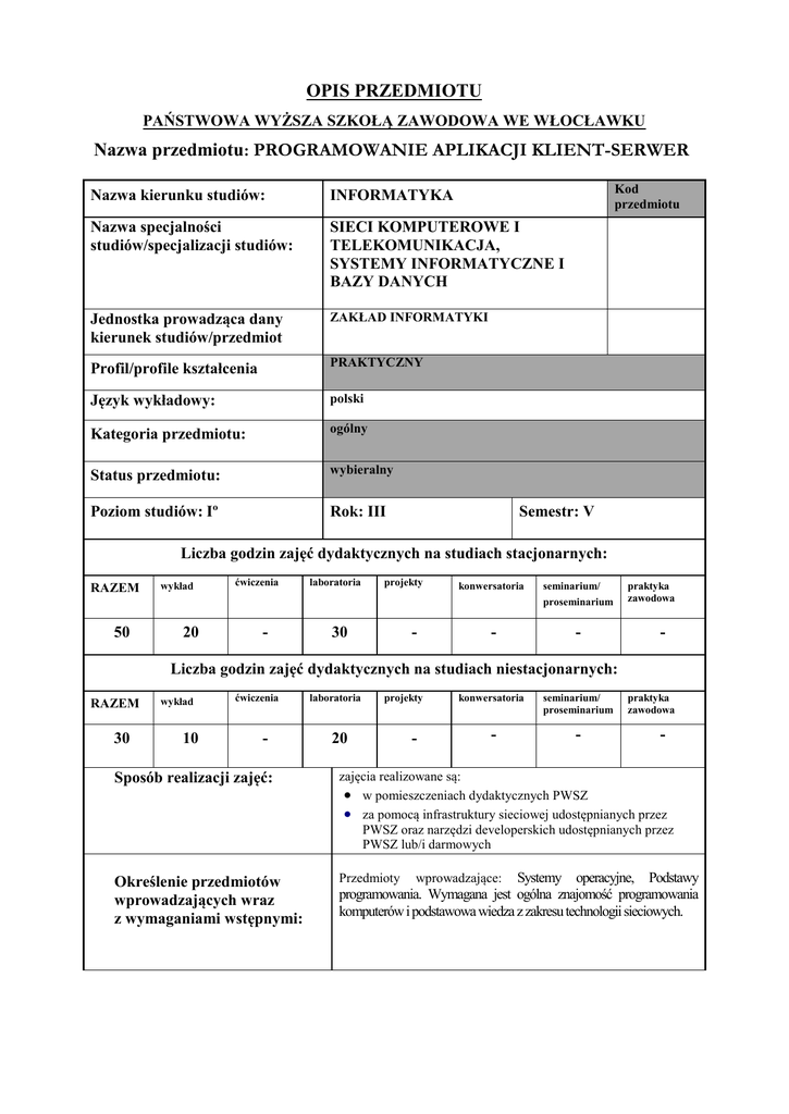 OPIS PRZEDMIOTU PAŃSTWOWA WYŻSZA SZKOŁĄ ZAWODOWA WE WŁOCŁAWKU Nazwa przedmiotu: PROGRAMOWANIE APLIKACJI KLIENT-SERWER Kod przedmiotu Nazwa kierunku studiów: INFORMATYKA Nazwa specjalności studiów/specjalizacji studiów: SIECI KOMPUTEROWE I TELEKOMUNIKACJA, SYSTEMY INFORMATYCZNE I BAZY DANYCH Jednostka prowadząca dany kierunek studiów/przedmiot ZAKŁAD INFORMATYKI Profil/profile kształcenia PRAKTYCZNY Język wykładowy: polski ogólny Kategoria przedmiotu: Status przedmiotu: wybieralny Poziom studiów: Iº Rok: III Semestr: V Liczba godzin zajęć dydaktycznych na studiach stacjonarnych: RAZEM wykład ćwiczenia laboratoria projekty konwersatoria seminarium/ proseminarium 50 20 - 30 - - - praktyka zawodowa - Liczba godzin zajęć dydaktycznych na studiach niestacjonarnych: RAZEM 30 wykład 10 ćwiczenia - laboratoria projekty 20 - konwersatoria seminarium/ proseminarium - - praktyka zawodowa - Sposób realizacji zajęć: zajęcia realizowane są: w pomieszczeniach dydaktycznych PWSZ za pomocą infrastruktury sieciowej udostępnianych przez PWSZ oraz narzędzi developerskich udostępnianych przez PWSZ lub/i darmowych Określenie przedmiotów wprowadzających wraz z wymaganiami wstępnymi: Przedmioty wprowadzające: Systemy operacyjne, Podstawy programowania. Wymagana jest ogólna znajomość programowania komputerów i podstawowa wiedza z zakresu technologii sieciowych. Cel kształcenia: Celem przedmiotu jest poznanie zasad projektowania i implementacji aplikacji klienckich i serwerowych z wykorzystaniem gniazd języka Java. Efekty kształcenia: Wiedza: - student zna podstawowe metody, techniki i narzędzia stosowane przy rozwiązywaniu nieskomplikowanych zadań informatycznych z zakresu projektowania i implementacji systemów informatycznych, systemów operacyjnych, sieci komputerowych i systemów rozproszonych, grafiki i systemów multimedialnych, sztucznej inteligencji, baz danych, inżynierii oprogramowania oraz bezpieczeństwa systemów informatycznych (K_W07) Umiejętności: - student ma umiejętność projektowania prostych sieci komputerowych przewodowych, bezprzewodowych, lub mieszanych; potrafi pełnić funkcję administratora sieci komputerowej; potrafi zabezpieczać transmitowane dane (K_U05) Kompetencje społeczne: - student ma świadomość odpowiedzialności za pracę własną oraz gotowość podporządkowania się zasadom pracy w zespole i ponoszenia odpowiedzialności za wspólnie realizowane zadania (K_K04) Pełny opis przedmiotu/treści programowe Treści programowe Metody prowadzenia zajęć: Wykład: 1. wykład 2. ćwiczenia laboratoryjne 1. Podstawowe pojęcia i definicje architektury klient-serwer. 2. Własności architektur klient-serwer. 3. Architektura serwera połączeniowego i bezpołączeniowego. 4. Architektura serwera iteracyjnego i współbieżnego. 5. Protokóły UDP i TCP. Interfejs gniazd dla systemu Linux. Gniazda Javy. 6. Przykłady aplikacji klienckich i serwerowych dla protokółów UDP, TCP i SSL. 7. Projekt, implementacja i analiza prostego serwera współbieżnego. Formy aktywności Obciążenie pracą studenta/ punkty ECTS I. Studia stacjonarne: 1) wliczone do pensum: - wykład (20) - ćwiczenia laboratoryjne (30) - konsultacje bezpośrednie (1) - konsultacje e-mailowe (1) 2) nie wliczone do pensum: - egzaminy i zaliczenia (3) Godziny kontaktowe z nauczycielem akademickim Godziny bez udziału nauczyciela akademickiego: 1. Przygotowanie się do zajęć, w tym studiowanie zalecanej literatury, Średnia liczba godzin na zrealizowanie aktywności Stacjonarne Niestacjonarne W W AF/ ćw. AF/ ćw. 20 35 15 25 5 15 10 25 II. Studia niestacjonarne: 1) wliczone do pensum: - wykład (10) - ćwiczenia laboratoryjne (20) - konsultacje bezpośrednie (1) - konsultacje e-mailowe (1) 2) nie wliczone do pensum: - egzaminy i zaliczenia (3) Forma i sposób zaliczenia oraz kryteria oceny lub wymagania 2.Opracowanie wyników/przygotowanie do egzaminu, zaliczenia, kolokwium, inne 3. Przygotowanie raportu, prezentacji, dyskusji Suma Sumaryczna liczba punktów ECTS dla prowadzonej formy zajęć Sumaryczna liczba punktów ECTS dla przedmiotu Sposób zaliczenia: zaliczenie z oceną 5 15 15 25 0 25 50 25 50 1 2 1 2 3 3 Formy zaliczenia: wykład – końcowy test pisemny jednokrotnego wyboru laboratorium – przygotowanie zaplanowanych projektów programistycznych Podstawowe kryteria: wykład – zaliczenie testu końcowego przynajmniej na ocenę trzy laboratorium – realizacja wszystkich zaplanowanych projektów programistycznych przynajmniej na ocenę trzy Wykaz literatury : Literatura podstawowa: M. Ben-Ari, „Podstawy programowania współbieżnego”, WNT, Warszawa 2009. J. Bloch, „Java. Efektywne programowanie”, Helion, 2009. K. Krysiak, „Sieci komputerowe. Kompedium”, Helion, 2005. B. Eckel, „Thinking in Java”, Edycja Polska, Helion, Gliwice 2001. Literatura uzupełniająca: W. Stallings, „Systemy operacyjne. Struktura i zasady budowy”, PWN, Warszawa 2006. D. Comer, „Sieci komputerowe TCP/IP”, Wydawnictwo NaukowoTechniczne, 1997. A.Tanenbaum, „Sieci komputerowe”, Helion, Gliwice 2004. Holub A., "Wątki w Javie. Poradnik dla programistów", Mikom, 2001. Nazwiska i imiona osób prowadzących/osoby prowadzącej: dr inż. Kamil Stokfiszewski OPIS PRZEDMIOTU PAŃSTWOWA WYŻSZA SZKOŁĄ ZAWODOWA WE WŁOCŁAWKU Nazwa przedmiotu: Telekomunikacja Kod przedmiotu Nazwa kierunku studiów: INFORMATYKA Nazwa specjalności studiów/specjalizacji studiów: Specjalność: Sieci komputerowe i telekomunikacja Jednostka prowadząca dany kierunek studiów/przedmiot ZAKŁAD INFORMATYKI Profil/profile kształcenia praktyczny Język wykładowy: polski specjalnościowy Kategoria przedmiotu: Status przedmiotu: obligatoryjny Poziom studiów: Rok: IV Semestr: VII Liczba godzin zajęć dydaktycznych na studiach stacjonarnych: RAZEM 50 Wykład ćwiczenia 20 - laboratoria 30 projekty - Seminarium Praktyka zawodowa - - Liczba godzin zajęć dydaktycznych na studi