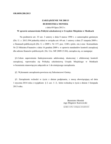 OR.0050.288.2013 ZARZĄDZENIE NR 288/13 BURMISTRZA MONIEK z dnia 09 lipca 2013 r. W sprawie ustanowienia Polityki szkoleniowej w Urzędzie Miejskim w Mońkach Na podstawie art. 33 ust. 3 ustawy z dnia 8 marca 1990 r. o samorządzie gminnym (Dz. U. z 2013.594 jednolity tekst) w związku art. 69 ust. 1 ustawy z dnia 27 sierpnia 2009 r. o finansach publicznych (Dz. U. z 2009 r. Nr 157, poz. 1240 z późn. zm.) oraz Komunikatu Nr 23 Ministra Finansów z dnia 16 grudnia 2009 r. w sprawie standardów kontroli zarządczej dla sektora finansów publicznych ( Dz. Urz. MF.2009.15.84), zarządza się, co następuje: §1.Celem zapewnienia funkcjonowania adekwatnej, skutecznej i efektownej kontroli zarządczej, wprowadza się Politykę szkoleniową Urzędu Miejskiego w Mońkach w brzmieniu stanowiącym załącznik nr 1 do niniejszego zarządzenia. §2. Wykonanie zarządzenia powierza się Sekretarzowi Gminy. §3. Zarządzenie wchodzi w życie z dniem podpisania, z mocą obowiązującą od dnia 1 stycznia 2014 roku z wyjątkiem § 2. ust. 1 i 2, które wchodzą w życie z dniem 1 listopada 2013 roku. Burmistrz Moniek mgr Zbigniew Karwowski ……………………………………….. (podpis osoby wydającej zarządzenie) Załącznik do Zarządzenia Nr 288/13 Burmistrza Moniek z dnia 09 lipca 2013 r. POLITYKA SZKOLENIOWA URZEDU MIEJSKIEGO W MOŃKACH ROZDZIAŁ I CEL POLITYKI SZKOLENIOWEJ § 1.1. Celem polityki szkoleniowej jest stałe podnoszenie poziomu wiedzy i doskonalenia umiejętności pracowników Urzędu Miejskiego w Mońkach koniecznych do wykonywania powierzonych zadań i zapewnienia profesjonalnej obsługi interesanta. Realizowana przez Urząd polityka ma za zadanie optymalne wykorzystanie środków publicznych przeznaczonych na wspieranie doskonalenia zawodowego pracowników Urzędu. 2. Polityka szkoleniowa Urzędu Miejskiego w Mońkach określa: 1) planowanie szkoleń, 2) realizację szkoleń, 3) ocenę ich jakości. ROZDZIAŁ II ZASADY TWORZENIA ROCZNEGO PLANU SZKOLEŃ § 2.1. W terminie do 30 listopada każdego roku kierownicy referatów oraz pracownicy na samodzielnych stanowiskach przekazują do Kadr ustną informację o zapotrzebowaniu pracowników na szkolenia w następnym roku kalendarzowym. 2. Plan szkoleń stanowiący załącznik nr 1 do niniejszej polityki szkoleniowej opracowywany jest przez pracownika odpowiedzialnego za sprawy kadrowe w terminie do 15 grudnia danego roku kalendarzowego, na podstawie zgłoszonych potrzeb szkoleniowych. 3. Plan szkoleń podlega zaparafowaniu przez Sekretarza Gminy i Skarbnika Gminy oraz zatwierdzeniu przez Burmistrza Moniek. 4. Ostateczną decyzję dotyczącą ujęcia proponowanych szkoleń w planie szkoleń podejmuje Burmistrz Moniek. 5. Roczny plan szkoleń przekazywany jest kierownikom referatów w terminie nie później niż 7 dni od daty jego akceptacji. 6. Plan szkoleń w uzasadnionych przypadkach może być modyfikowany w trakcie roku. 7. W miarę potrzeb i możliwości, szkolenia zewnętrzne mogą być realizowane poza planem. ROZDZIAŁ III REALIZACJA SZKOLEŃ § 3. Realizacja szkoleń odbywa się zgodnie z przyjętym planem rocznym. Uczestnictwo pracowników w szkoleniach jest traktowane na równi z wykonywaniem obowiązków służbowych. § 4. Forma szkoleń obejmuje: a) szkolenia zewnętrzne w formach pozaszkolnych: kursy, warsztaty, seminaria, konferencje, b) szkolenia zewnętrzne w formach szkolnych tj. studia wyższe, studia podyplomowe, b) szkolenia wewnętrzne organizowane przez pracowników Urzędu, d) szkolenia wewnętrzne specjalistyczne organizowane przez firmy zewnętrzne w Urzędzie. § 5.1. Szkolenia zewnętrzne Oferty szkoleniowe, które wpływają do Urzędu Miejskiego w Mońkach są przekazywane kierownikom odpowiednich referatów i pracownikom na samodzielnych stanowiskach do analizy i wyboru zgodnie z planem szkoleń, a w szczególnych przypadkach oferty, których tematyka nie została ujęta w rocznym planie szkoleń. 2. Kierownicy referatów oraz pracownicy na samodzielnych stanowiskach składają wybraną ofertę (po akceptacji przez bezpośredniego przełożonego) do pracownika odpowiedzialnego za sprawy kadrowe. 3. Pracownik odpowiedzialny za sprawy kadrowe przekłada do zatwierdzenia Burmistrzowi Moniek ofertę szkoleniową z potwierdzeniem Skarbnika Gminy zabezpieczenia środków finansowych na realizację wniosku. 4. Wniosek po zatwierdzeniu zostaje przekazany do realizacji. Pracownik po zakończeniu dokształcania jest zobowiązany złożyć do kadr zaświadczenie (certyfikat) o ukończeniu szkolenia. Kserokopie dokumentów są zamieszczane w aktach osobowych pracownika. 5. Pracownik po zakończeniu szkolenia wypełnia Arkusz Indywidualnej Oceny Szkolenia stanowiący załącznik nr 2 do niniejszej polityki szkoleniowej i przekazuje do kadr 7 dni po ukończeniu szkolenia. Arkusz Indywidualnej Oceny Szkolenia służy ocenie jakości i przydatności przeprowadzonego szkolenia dla wykonywania obowiązków pracownika. Pracownik odpowiedzialny za kadry odnotowuje uczestnictwo w szkoleniu w Rejestrze szkoleń. 6. Pracownicy mają możliwość korzystania z bezpłatnych szkoleń finansowanych ze środków zewnętrznych w tym funduszy europejskich. W sprawach związanych z dokształceniem zawodowym pracowników w formie np.: studiów wyższych lub podyplomowych, Burmistrz podejmuje decyzję o dofinansowanie indywidualne. § 6. Szkolenia wewnętrzne Szkolenia wewnętrzne realizowane są wewnątrz Urzędu poprzez zapewnienie prowadzącego i uczestników, a także odpowiednio wyposażoną salę. ROZDZIAŁ IV FINANSOWANIE SZKOLEŃ § 7. Środki finansowe na realizację polityki szkoleniowej są ustalane corocznie zgodnie z ustalonym „Rocznym planem szkoleń”. § 8. Wniosek na indywidualne szkolenie każdorazowo musi być akceptowany przez Skarbnika Gminy. ROZDZIAŁ V OCENA JAKOŚCI I EFEKTYWNOŚCI ZREALIZOWANEGO SZKOLENIA § 9.1. Ocena jakości i efektywności zrealizowanego szkolenia prowadzona jest przez przeszkol