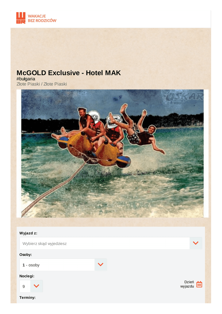 McGOLD Exclusive - Hotel MAK #bułgaria Złote Piaski / Złote Piaski Wyjazd z: Wybierz skąd wyjedziesz Osoby: 1 - osoby Noclegi: 9 Terminy: Dzień wyjazdu 13 dni 27.06.2017 - 10.07.2017 Pokój: pokoj wieloosobowy Wyżywienie: Wszystko w cenie Warunki płatności: Cena za 1 osobę: Razem: cena katalogowa 1747 zł 3494 zł Opis oferty Miejscowość Wiek 13Wycieczki - 18 lat fakultatywne Złote Piaski Opinie Perła bułgarskiej riwiery. Mieniące się złotem piaszczyste plaże są idealne do brania kąpieli słonecznych a wyjątkowy klimat zachęca do korzystania z innych uroków tego regionu. Przy plaży Rozkład jazdy znajdziemy liczne kluby i dyskoteki, w których nikt nie kończy zabawy przed wschodem słońca! Każda pora dnia i nocy jest dobra na totalne szaleństwo! #oskarobozy Złote Piaski to królestwo wodnego szaleństwa! ATRAKCJĄ obozu jest słynne Aquapolis . Wyobraź sobie tyle zjeżdżalni, że na ich zaliczenie brakuje dnia. Królową jest zapierająca dech w piersiach zjeżdżalnia Niagara, w czasie zjazdu z której można osiągnąć prędkość 50 kilometrów na godzinę!!! Ostrzegamy! Nie ma, jak zapiąć pasów, a zjazd odbywa się bez trzymanki! Kamikaze jest przeznaczona TYLKO dla osób lubiących ekstremalne doznania! ;) Zgrana ekipa to podstawa dobrej zabawy! Poznaj swoją obozową ekipę jeszcze przed wyjazdem, dzięki specjalnie dla Was utworzonej grupie na FB! https - //www.facebook.com/groups/253837181694508/ Położenie Witaj w Hotelu MAK! jest położony w samym centrum Złotych Piasków i zlokalizowany w odległości 300 m od plaży. Pobyt tutaj to złoty interes, bo w cenie otrzymasz czego dusza zapragnie. W hotelu jest basen z leżakami i beach bar’em. To co, zaczynamy party? Zakwaterowanie Pokoje 3, 4 i 5 - osobowe z klimatyzacją. Każdy pokój ma balkon, lodówkę i włąsną łazienkę. Hotel posiada Sky bar i basen, przy których również jest zasięg WiFi. Wyżywienie Wyżywienie All Inclusive Light - 4 posiłki dziennie, wszystkie w formie bufetu, czyli 9 śniadań, 10 lunchy, 9 podwieczorków, 9 obiadokolacji. Napoje bez ograniczeń w godz. 07.00-20.00. Co za ile, czyli hajs musi się zgadzać - ) Sugerowane kieszonkowe - zabierz ze sobą ok. 80 € na drobne wydatki! pizza 2 leva / porcja Coca-cola 1,6 leva / 0,33 l pocztówka ze znaczkiem 1,5 leva Dodatkowe info Legitymacja nie wystarczy- obowiązkowo musisz zabrać ze sobą ważny dowód osobisty lub paszport, a jeśli chcesz jechać do Stambułu to no way bez paszportu. Pamiętaj, żeby zabrać Kartę Uczestnika Obozu, podpisany Regulamin oraz kartę EKUZ ( www.ekuz.nfz.gov.pl) Klub Arrogance Music Factory – najlepszy klub w Złotych! 5 stylów muzycznych - jedno miejsce! Tego się nie da opisać. Sprawdź to! http - //arroganceclub.com/en/halls Dokumenty do pobrania Karta kwalifikacyjna www.oskar.com.pl/zalaczniki/karta_kwalifikacyjna Regulamin obozu www.oskar.com.pl/zalaczniki/regulamin_obozu Karta Dużej Rodziny www.oskar.com.pl/zalaczniki/karta_duzej_rodziny Turystyczny Fundusz Gwarancyjny W związku z powołaniem do życia w dniu 26.11.2016 Turystycznego Funduszu Gwarancyjnego każdy klient Biura Podróży Oskar zobowiązany jest do zapłaty kwoty w wysokości 10zł/os. przy każdorazowej rezerwacji imprezy turystycznej (obowiązuje od dnia 26.11.2016). Kwota przeznaczona na Turystyczny Fundusz Gwarancyjny zostanie automatycznie doliczona do wartości rezerwacji (w momencie jej dokonania). Wyjątkiem są imprezy turystyczne odbywające się w krajach posiadających granicę z Rzeczpospolitą Polską. Składka nie jest przychodem biura. Ubezpieczenie Warunki ubezpieczenia Bezpieczne Podróże Signal Iduna dokument do pobrania www.oskar.com.pl/zalaczniki/owu Warunki ubezpieczenia Kosztów Imprezy Turystycznej Signal Iduna dokument do pobrania www.oskar.com.pl/zalaczniki/owurg Udogodnienia Ułatwienia dla niepełnosprawnych Windsurfing Nordic walking Jazda konna Nurkowanie Sporty wodne Program ramowy Dzień 1 Wyjazd z Polski zgodnie z rozkładem jazdy autokarów. Przejazd przez Czechy, Słowację, Węgry, Rumunię / Serbię. Dzień 2 Przyjazd do Złotych Piasków w godzinach przedpołudniowych. Zakwaterowanie w godzinach od 12-14. Lunch / obiad. Dzień 3 - 10 Leżing, plażing, smażing... i PARTY! Dzień 11 Wykwaterowanie w godzinach porannych. Czas na złapanie ostatnich wspomnień i pożegnanie z bułgarskimi plażami. Wyjazd do Polski w godzinach popołudniowych. Dzień 12 Podróż powrotna. Przejazd przez Rumunię/Serbię ,Węgry, Słowację. Przyjazd do Polski w godzinach nocnych/porannych dnia następnego. Cena zawiera ATRAKCJĘ! - Aquapolis transport nowoczesnym i komfortowym autokarem klasy LUX (klimatyzacja, WC, DVD, minibar) zakwaterowanie - 9 noclegów w pokojach wieloosobowych wyżywienie All Inclusive light - 9 śniadań, 10 lunchy, 9 obiadokolacji w formie bufetu opiekę pilota i wychowawców na trasie przejazdu opiekę kadry i rezydenta na miejscu ubezpieczenie [KL 10000 euro, NNW 10000 zł, BP 500 zł (utrata)] bogaty program rekreacyjno - rozrywkowy suchy prowiant na drogę powrotną Dopłaty wymagane na miejscu atrakcje programowe i opłata klimatyczna - 30 €/os. - płatne u pilota w autokarze kaucja zwrotna - 20 €/os. - płatne u kierownika obozu, zwracane po wykwaterowaniu pod warunkiem braku szkód Dopłaty opcjonalne wycieczki fakultatywne i bilety wstępu do zwiedzanych obiektów Disco ARROGANCE - 10 €/os obiad na trasie przejazdu (ok. 5 €/posiłek) podczas dłuższego postoju do i w drodze powrotnej ubezpieczenie od chorób przewlekłych i nowotworowych KL 20000 euro, NNW 10000 zł, bagaż (500 zł utrata) - 160 zł/os Wycieczki fakultatywne 25 € /os. 39 € /os. Panorama z Jachtu Balczik - Kaliakra - 25 € /os. Piknik Wedkarstwo Potrzebujesz pomocy? Zadzwoń lub napisz: 61 852 45 72 [email protected] 39 € /os. Nessebar Balczyk-Ogrod botaniczny-Kaliakra © 2015 WakacjeBezRodzicow.pl pl.Wolności 2/4c, 61-738 Poznań Grafika i użyteczność: Simpl