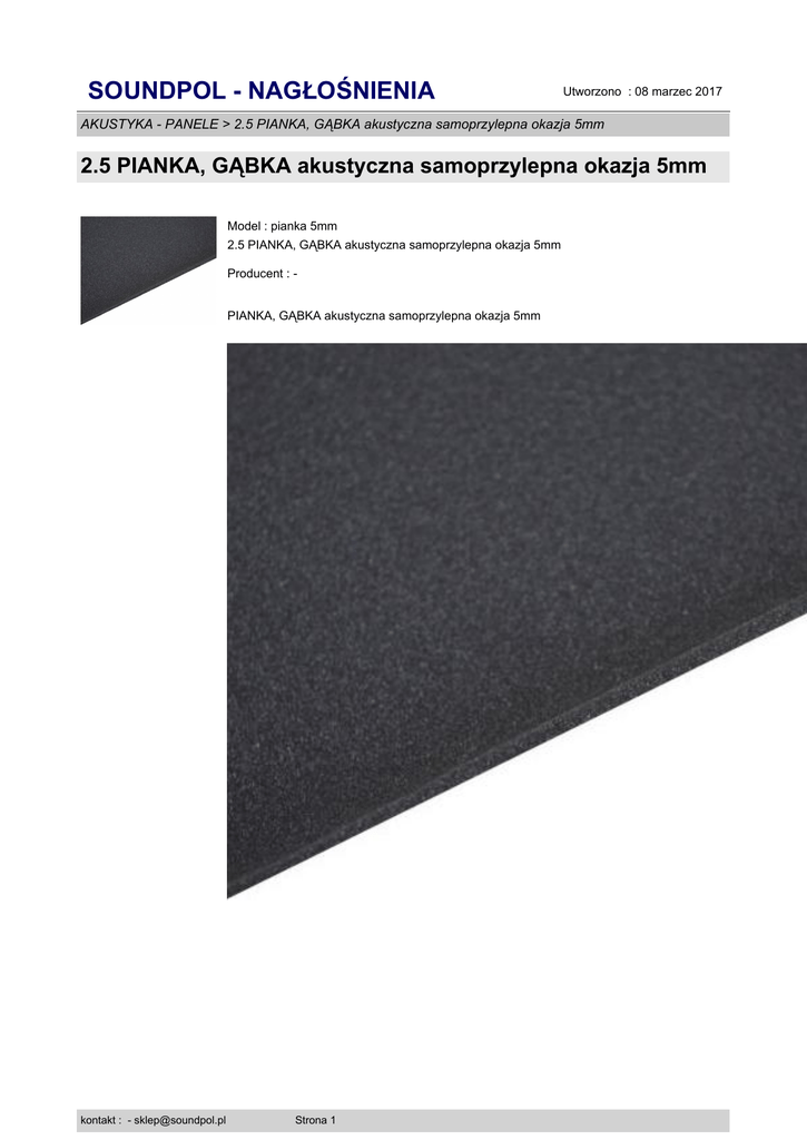 SOUNDPOL - NAGŁOŚNIENIA Utworzono : 08 marzec 2017 AKUSTYKA - PANELE > 2.5 PIANKA, GĄBKA akustyczna samoprzylepna okazja 5mm 2.5 PIANKA, GĄBKA akustyczna samoprzylepna okazja 5mm Model : pianka 5mm 2.5 PIANKA, GĄBKA akustyczna samoprzylepna okazja 5mm Producent : PIANKA, GĄBKA akustyczna samoprzylepna okazja 5mm kontakt : - [email protected] Strona 1 SOUNDPOL - NAGŁOŚNIENIA Utworzono : 08 marzec 2017 AKUSTYKA - PANELE > 2.5 PIANKA, GĄBKA akustyczna samoprzylepna okazja 5mm 2.5 PIANKA, GĄBKA akustyczna samoprzylepna okazja 5mm kontakt : - [email protected] Strona 2 SOUNDPOL - NAGŁOŚNIENIA Utworzono : 08 marzec 2017 AKUSTYKA - PANELE > 2.5 PIANKA, GĄBKA akustyczna samoprzylepna okazja 5mm 2.5 PIANKA, GĄBKA akustyczna samoprzylepna okazja 5mm Pianka akustyczna 5KL1 Wymiary pianki: szerokość 100cm (1000mm) długość 25cm (250mm) grubość 0,5cm (5mm) Materiał cięty z rolki, max wymiar 1 na 25m. Dostępna w kolorze szarym. Pianka samoprzylepna. Zakupione ilości mnożone są przez długość i wysyłane w jednym kawałku (np. 4szt. to odcinek 1m na 1m). Zastosowanie: kontakt : - [email protected] Strona 3 SOUNDPOL - NAGŁOŚNIENIA Utworzono : 08 marzec 2017 AKUSTYKA - PANELE > 2.5 PIANKA, GĄBKA akustyczna samoprzylepna okazja 5mm 2.5 PIANKA, GĄBKA akustyczna samoprzylepna okazja 5mm Stosowana do poprawy akustyki, wytłumienia i wyciszenia. Pianka świetnie spisuje się do wyklejania kolumn głośnikowych. Doskonale sprawdza się również w motoryzacji, przemyśle i branży opakowań (jako zabezpieczenie) Główne zalety: * redukcja drgań * tłumienie wibracji * dodatkowa izolacja cieplna * ograniczenie przenoszenia hałasu * stosowana w kolumnach głośnikowych najwyższej jakości * trwały, miękki, elastyczny i lekki * łatwy montażu i profilowaniu * możliwość sklejania z różnymi powierzchniami * mała podatność na działanie rozpuszczalników organicznych i detergentów. * produkt bezpieczny dla człowieka * fabrycznie nowa, prosto od producenta Cena : 6,80 zł Brutto ( 5,53 zł Netto) Dostępność: Produkt dostępny w naszym sklepie od 27 marzec 2015 kontakt : - [email protected] Strona 4