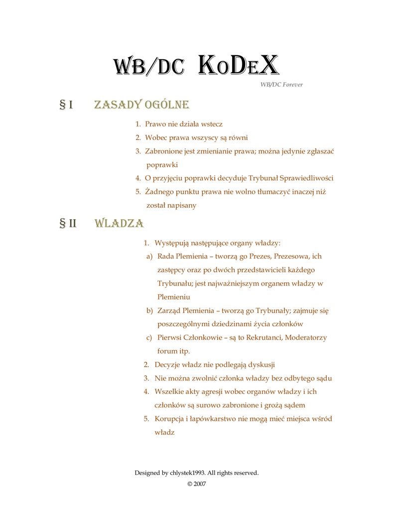 KODEX WB/DC WB/DC Forever §I Zasady ogólne 1. Prawo nie działa wstecz 2. Wobec prawa wszyscy są równi 3. Zabronione jest zmienianie prawa; można jedynie zgłaszać poprawki 4. O przyjęciu poprawki decyduje Trybunał Sprawiedliwości 5. Żadnego punktu prawa nie wolno tłumaczyć inaczej niż został napisany § II WLadza 1. Występują następujące organy władzy: a) Rada Plemienia – tworzą go Prezes, Prezesowa, ich zastępcy oraz po dwóch przedstawicieli każdego Trybunału; jest najważniejszym organem władzy w Plemieniu b) Zarząd Plemienia – tworzą go Trybunały; zajmuje się poszczególnymi dziedzinami życia członków c) Pierwsi Członkowie – są to Rekrutanci, Moderatorzy forum itp. 2. Decyzje władz nie podlegają dyskusji 3. Nie można zwolnić członka władzy bez odbytego sądu 4. Wszelkie akty agresji wobec organów władzy i ich członków są surowo zabronione i grożą sądem 5. Korupcja i łapówkarstwo nie mogą mieć miejsca wśród władz Designed by chlystek1993. All rights reserved. © 2007 § III RekRutacja 1. Gracze mogą być rekrutowani do plemienia po przekroczeniu przez nich progu 1000P. 2. Wszystkie zaproszenia są zgłaszane Rekrutantom na Forum Plemienia 3. Gracze poniżej 1000P. są rekrutowani do Akademii WB/DC (aWB/DC) 4. Możliwe jest rekrutowanie graczy poniżej 1000P. do głównego Plemienia, za pozwoleniem Rady Plemienia, po wystosowaniu odpowiedniego podania 5. Ważne jest, aby zapraszać graczy od 800P. do głównego Plemienia, znajdujących się blisko członka. Nie jest wtedy wymagana zgoda Rady Plemienia § IV Rangi i Odznaczenia 1. Rangi są ewidentnie elementem prawa Plemienia i nie mogą zostać zniesione. 2. Każdy członek Plemienia, który nie należy do władz Plemienia, tj.: Zarządu Plemienia, Rady Plemienia lub Pierwszych Członków, musi posiadać swoją rangę 3. Rangi w Plemieniu WB/DC: a) 1000-1500 Właściciel Ziemski b) 1501-2000 Szlachcic c) 2001-2800 Magnat d) 2801-4000 Baron e) 4001-5800 Hrabia f) 5801-8000 Komtur g) 8001-10800 Marszałek h) 10801-15000 Hetman 4. Za przyznawanie rang odpowiedzialny jest Trybunał Członkostwa Designed by chlystek1993. All rights reserved. © 2007 5. Odznaczenia są elementem prawa Plemienia, jednakże niekoniecznym i mniej ważnym od rang 6. Odznaczenia w Plemieniu WB/DC: a) … b) … c) … d) … e) … f) … g) … h) … 7. Za przyznawanie rang odpowiedzialny jest Trybunał Członkostwa §V AtAki 1. Ataki są ważną częścią rozgrywki i prawo do atakowania nie może zostać odebrane 2. Surowo zabronione jest atakowanie członków Plemienia i sojuszników 3. Prawo do atakowania neutralnych członków nie wymaga zgody ani żadnej informacji 4. Prawo do atakowania wrogów nie wymaga zgody, lecz jedynie pisemnej informacji na forum § VI Pomoc i ZastEpstwa 1. Każdy członek plemienia ma prawo do pomocy ze strony innych członków i odwrotnie 2. Członkowie słabsi nie mają obowiązku pomagania mocniejszym, natomiast mocniejsi słabszym – tak 3. Członkowie znajdujący się blisko (do 50 godzin drogi) mają obowiązek pomocy. Członkowie znajdujący się w Designed by chlystek1993. All rights reserved. © 2007 odległości większej niż 50 godzin drogi nie mają obowiązku pomocy 4. Prośby o pomoc są zgłaszane na Forum Plemienia, w dziale: Dowództwo Wojsk 5. Każdy ma prawo do przyjmowania zastępstwa i prośby o nie 6. Nie ma obowiązku odpowiadania na prośby o zastępstwa § VII Fuzje, Pakty, SojuSze, Wojny 1. Występują następujące typy stosunków politycznych: a) Fuzje – połączenie z obcym plemieniem b) Pakty – umowa o nieagresji militarnej c) Sojusze – umowa o wsparciu militarnym i ekonomicznym d) Wojny – konflikt połączony z agresją militarną 2. O każdym ze stanów decyduje Trybunał Stosunków Politycznych i Dyplomacji, do której wpłynie odpowiedni wniosek 3. W stanie wojny wskazane jest atakowanie wrogów 4. W stanie pokoju zabronione jest atakowanie przyjaciół § VIII Forum Plemienia 1. Forum Plemienia jest jedną z najważniejszych instytucji w Plemieniu. Za porządek na Forum odpowiadają Moderatorzy Forum: a) … b) … c) … d) … e) … 2. Zabronione jest wypowiadanie się na Forum w sposób wulgarny, obrażając innych członków Designed by chlystek1993. All rights reserved. © 2007 3. Posty, na które nie ma odpowiedzi przez co najmniej tydzień, są zamykane lub usuwane 4. Wszystkie głosowania odbywają się na forum 5. Wszystkie głosowania odbywają się w sposób jawny, co nie musi mieć miejsca w sprawach poufnych § IX Kary 1. Kary zapisane w niniejszym paragrafie nie podlegają dyskusji ani zmianom 2. Za wykroczenia dot. § I grozi degradacja na niższe stanowisko 3. Za wykroczenia dot. § II grozi wyrzucenie z Plemienia lub kara śmierci 4. Za wykroczenia dot. § III grozi sąd 5. Za wykroczenia dot. § IV grozi degradacja lub zawieszenie w wypełnianiu obowiązków 6. Za wykroczenia dot. § V grozi zawieszenie w członkostwie lub wyrzucenie z Plemienia 7. Za wykroczenia dot. § VI grozi upomnienie lub sąd 8. Za wykroczenia dot. § VII grozi zawieszenie w członkostwie, wyrzucenie z Plemienia lub kara śmierci 9. Za wykroczenia dot. § VIII grozi degradacja, upomnienie lub sąd 10. Za wykroczenia dot. § IX grozi wyrzucenie z Plemienia 11. Kara śmierci jest najwyższym wymiarem kary i polega a przejęciu wioski 12. Podczas sądu Trybunał Sprawiedliwości rozpatrza sprawę winowajcy i podejmuje odpowiednie kroki Designed by chlystek1993. All rights reserved. © 2007