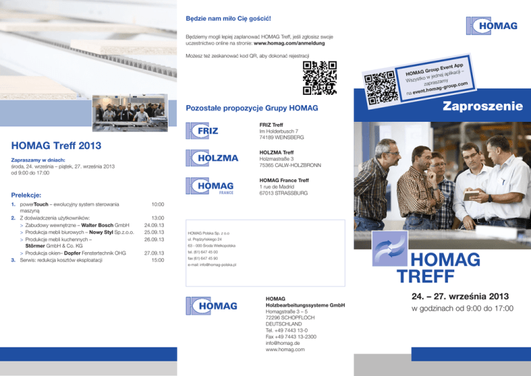 Będzie nam miło Cię gościć! Będziemy mogli lepiej zaplanować HOMAG Treff, jeśli zgłosisz swoje uczestnictwo online na stronie: www.homag.com/anmeldung Możesz też zeskanować kod QR, aby dokonać rejestracji t App p Even G Grou acji – A lik M p O H jednej a w o tk s Wszy amy om zaprasz group.c g a om h t. n e na ev Pozostałe propozycje Grupy HOMAG FRIZ Treff Im Holderbusch 7 74189 WEINSBERG HOMAG Treff 2013 HOLZMA Treff Holzmastraße 3 75365 CALW-HOLZBRONN Zapraszamy w dniach: środa, 24. września – piątek, 27. września 2013 od 9:00 do 17:00 HOMAG France Treff 1 rue de Madrid 67013 STRASSBURG Prelekcje: 1. powerTouch – ewolucyjny system sterowania maszyną 2. Z doświadczenia użytkowników: >> Zabudowy wewnętrzne – Walter Bosch GmbH >> Produkcja mebli biurowych – Nowy Styl Sp.z.o.o. >> Produkcje mebli kuchennych – Störmer GmbH & Co. KG >> Produkcja okien– Dopfer Fenstertechnik OHG 3. Serwis: redukcja kosztów eksploatacji Zaproszenie 10:00 13:00 24.09.13 25.09.13 26.09.13 HOMAG Polska Sp. z o.o 20 HOMAG TREFF – where innovation m ul. Prądzyńskiego 24 63 - 000 Środa Wielkopolska 27.09.13 15:00 YEARS tel. (61) 647 45 00 fax (61) 647 45 90 e-mail: [email protected] HOMAG Holzbearbeitungssysteme GmbH Homagstraße 3 – 5 72296 SCHOPFLOCH DEUTSCHLAND Tel. +49 7443 13-0 Fax +49 7443 13-2300 [email protected] www.homag.com 24. – 27. września 2013 w godzinach od 9:00 do 17:00 20 HOMAG - fascynacja innowacyjną technologią meets fascination TREFF – where innovation YEARS HOMAG Treff 2013 - przyjedź i zobacz! Trendy & nowości Indywidualne rozwiązania linii produkcyjnych PRACTIVE dla małych i średnich firm Grupa HOMAG - lider rynku maszyn do obróbki drewna powerTouch – całkiem nowy wymiar obsługi maszyn Grupy HOMAG Indywidualne rozwiązania od produkcji pojedynczych elementów po produkcję wieloseryjną Wszystko, czego potrzebują małe i średnie firmy Technologia, dzięki której zyskujesz >>Maszyna w akcji Ambition 2275: oklejarka dla wymagających >>Nowe połączenie technologii 5-osiowej z technologią oklejania >>Oszczędność zasobów, wzrost produktywności >>Oszczędność energii aż do 30 % >>Wymierne korzyści zaprasza na spotkanie branżowe - zobacz wszystkie maszyny „w akcji”, poznaj trendy i nowości rynkowe oraz indywidualne rozwiązania linii produkcyjnych dla małych i średnich firm. Daj się uwieść technologii, którą stosują dziś producenci mebli, podłóg, okien, schodów i drzwi. Możliwość przyjrzenia się produkcji z bliska i indywidualnej konsultacji z naszymi specjalistami to powody, dla których z pewnością warto wybrać się na HOMAG Treff 2013. Czekamy na Ciebie! >>Łączy w sobie stylowy design i funkcjonalność w obsłudze maszyn i urządzeń Minimalna spoina klejowa dla „wszystkich” – od airTec po laserTec >>Rozwiązania dla małych i średnich firm oraz tych produkujących na skalę przemysłową >>Niezależnie od kształtu elementu i rodzaju materiału >>Technologia laserTec z zastosowaniem kleju topliwego na maszynach CNC Technologia obróbki powierzchni reacTec – kaszerowanie & opłaszczowywanie >>Innowacyjna metoda oklejania wąskich i szerokich powierzchni elementów w połączeniu z nowym systemem szpachlowania wąskich powierzchni >>Produkcja pojedynczych elementów: od początku do końca >>Prezentacja różnych rozwiązań do ekonomicznej produkcji seryjnej >>Technologia automatyzacji dla centr obróbczych CNC i komórek produkcyjnych HOMAG Group Engineering Specjaliści od linii produkcyjnych >>Obszerny Know-how >>Indywidualne doradztwo >>Rozwiązania dostosowane do potrzeb, obejmujące kompletną produkcję mebli, stolarki budowlanej i parkietów Technologia obróbki okien dzięki technologii ecoPlus Oprogramowanie >>Technologia produkcji okien dostosowana do różnych potrzeb: od najmniejszych maszyn aż po te z serii powerProfiler 2 produkujące do 50 okien na zmianę Odpowiednie rozwiązania dla każdego >>Funkcje CAD zintegrowane z woodWOP-em 6.1 >>Oprogramowanie do p rodukcji okien, schodów, drzwi >>Sterowanie urządzeniami „na żywo” woodCAD|CAM Serwis Oprogramowanie HOMAG eSOLUTION >>Specjalnie dla małych i średnich firm >>Bezpiecznie, szybko i łatwo - od projektu aż po produkt końcowy Cele - zwiększyć dostępność, przedłużyć żywotność i zagwarantować bezpieczeństwo dzięki: >>indywidualnym pakietom serwisowym >>usługom „szytym na miarę” >>nowym aplikacjom s erwisowym