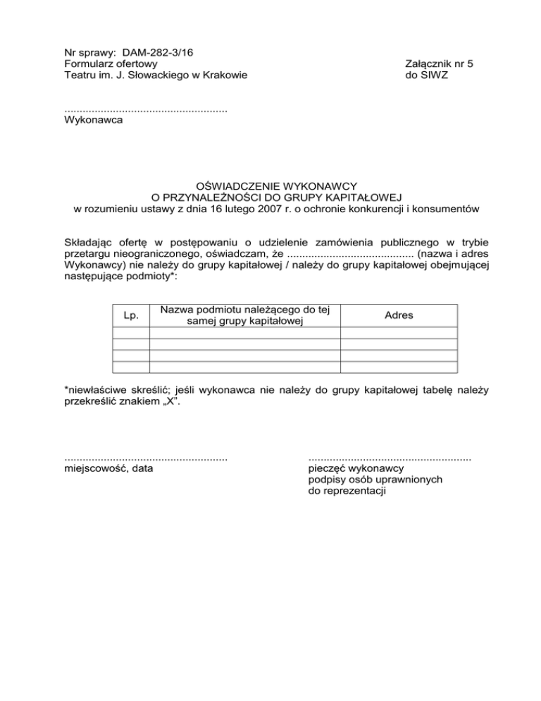 Nr sprawy: DAM-282-3/16 Formularz ofertowy Teatru im. J. Słowackiego w Krakowie Załącznik nr 5 do SIWZ ...................................................... Wykonawca OŚWIADCZENIE WYKONAWCY O PRZYNALEŻNOŚCI DO GRUPY KAPITAŁOWEJ w rozumieniu ustawy z dnia 16 lutego 2007 r. o ochronie konkurencji i konsumentów Składając ofertę w postępowaniu o udzielenie zamówienia publicznego w trybie przetargu nieograniczonego, oświadczam, że .......................................... (nazwa i adres Wykonawcy) nie należy do grupy kapitałowej / należy do grupy kapitałowej obejmującej następujące podmioty*: Lp. Nazwa podmiotu należącego do tej samej grupy kapitałowej Adres *niewłaściwe skreślić; jeśli wykonawca nie należy do grupy kapitałowej tabelę należy przekreślić znakiem „X”. ...................................................... miejscowość, data ...................................................... pieczęć wykonawcy podpisy osób uprawnionych do reprezentacji