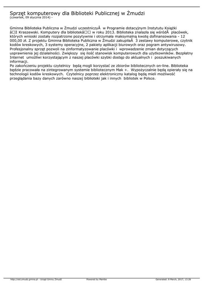 Sprzęt komputerowy dla Biblioteki Publicznej w Żmudzi (czwartek, 09 stycznia 2014) - Gminna Biblioteka Publiczna w Żmudzi uczestniczy w Programie dotacyjnym Instytutu Książki „Kraszewski. Komputery dla bibliotek― w roku 2013. Biblioteka znalazła się wśród placówek, których wnioski zostały rozpatrzone pozytywnie i otrzymała maksymalną kwotę dofinansowania - 12 000,00 zł. Z projektu Gminna Biblioteka Publiczna w Żmudzi zakupiła 3 zestawy komputerowe, czytnik kodów kreskowych, 3 systemy operacyjne, 2 pakiety aplikacji biurowych oraz pogram antywirusowy. Profesjonalny sprzęt pozwoli na zinformatyzowanie placówki i wprowadzenie zmian dotyczących usprawnienia jej działalności. Zwiększy się ilość stanowisk komputerowych dla użytkowników. Bezpłatny Internet umożliwi korzystającym z naszej placówki szybki dostęp do aktualnych i poszukiwanych informacji. Po zakończeniu projektu czytelnicy będą mogli korzystać ze zbiorów bibliotecznych on-line. Biblioteka będzie pracowała na zintegrowanym systemie bibliotecznym Mak +. Wypożyczalnie będą opierały się na technologii kodów kreskowych. Czytelnicy poprzez elektroniczny katalog będą mieli możliwość przeglądania bazy danych zarówno naszej biblioteki jak i innych bibliotek w Polsce. http://old.zmudz.gmina.pl - Urząd Gminy Żmudź Powered by Mambo Generated: 8 March, 2017, 13:26
