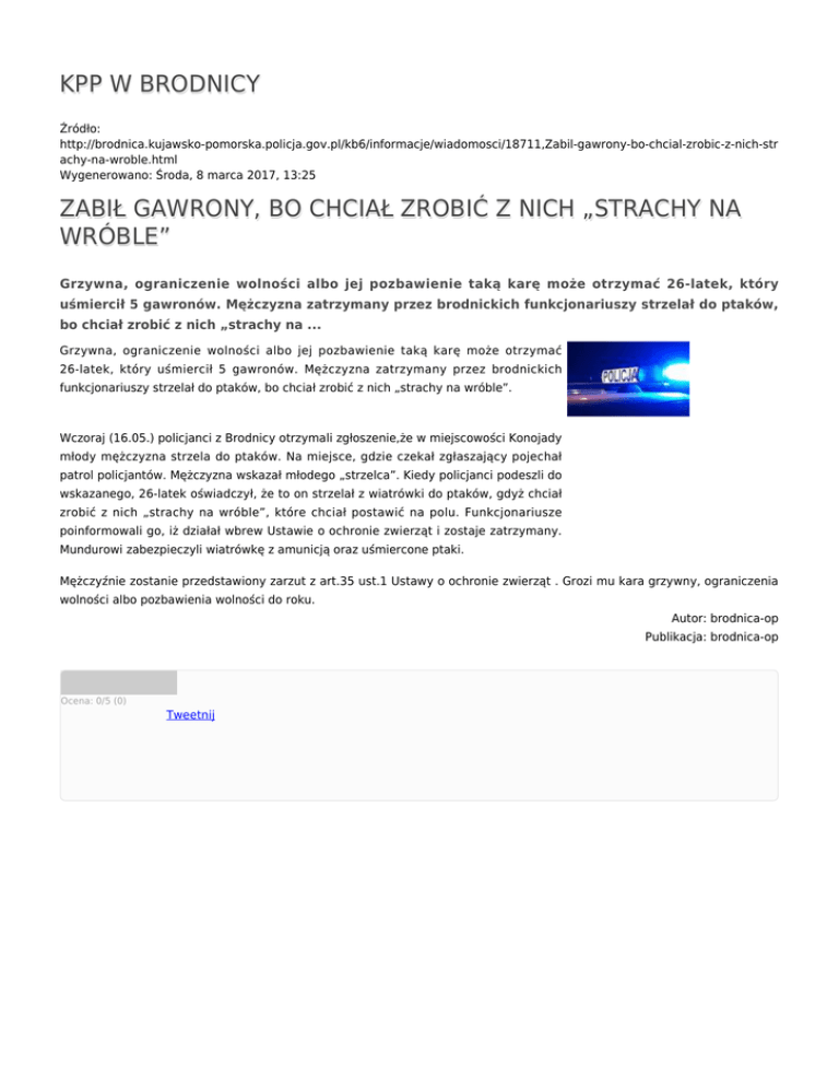 KPP W BRODNICY Źródło: http://brodnica.kujawsko-pomorska.policja.gov.pl/kb6/informacje/wiadomosci/18711,Zabil-gawrony-bo-chcial-zrobic-z-nich-str achy-na-wroble.html Wygenerowano: Środa, 8 marca 2017, 13:25 ZABIŁ GAWRONY, BO CHCIAŁ ZROBIĆ Z NICH „STRACHY NA WRÓBLE” Grzywna, ograniczenie wolności albo jej pozbawienie taką karę może otrzymać 26-latek, który uśmiercił 5 gawronów. Mężczyzna zatrzymany przez brodnickich funkcjonariuszy strzelał do ptaków, bo chciał zrobić z nich „strachy na ... Grzywna, ograniczenie wolności albo jej pozbawienie taką karę może otrzymać 26-latek, który uśmiercił 5 gawronów. Mężczyzna zatrzymany przez brodnickich funkcjonariuszy strzelał do ptaków, bo chciał zrobić z nich „strachy na wróble”. Wczoraj (16.05.) policjanci z Brodnicy otrzymali zgłoszenie,że w miejscowości Konojady młody mężczyzna strzela do ptaków. Na miejsce, gdzie czekał zgłaszający pojechał patrol policjantów. Mężczyzna wskazał młodego „strzelca”. Kiedy policjanci podeszli do wskazanego, 26-latek oświadczył, że to on strzelał z wiatrówki do ptaków, gdyż chciał zrobić z nich „strachy na wróble”, które chciał postawić na polu. Funkcjonariusze poinformowali go, iż działał wbrew Ustawie o ochronie zwierząt i zostaje zatrzymany. Mundurowi zabezpieczyli wiatrówkę z amunicją oraz uśmiercone ptaki. Mężczyźnie zostanie przedstawiony zarzut z art.35 ust.1 Ustawy o ochronie zwierząt . Grozi mu kara grzywny, ograniczenia wolności albo pozbawienia wolności do roku. Autor: brodnica-op Publikacja: brodnica-op Ocena: 0/5 (0) Tweetnij