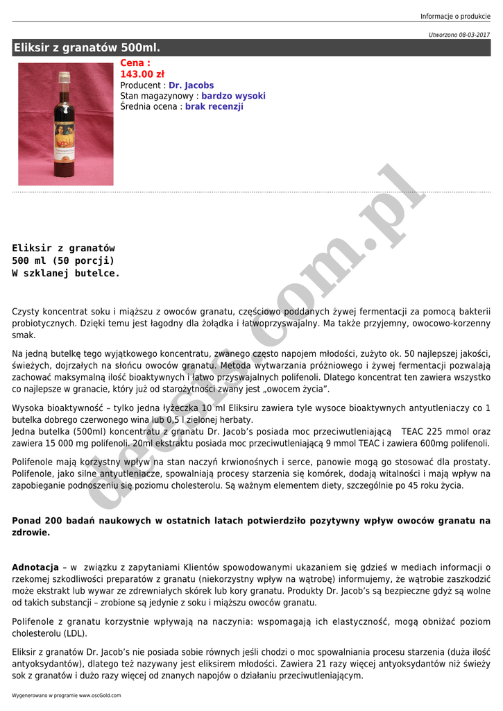 Informacje o produkcie Utworzono 08-03-2017 Eliksir z granatów 500ml. Cena : 143.00 zł m .p l Producent : Dr. Jacobs Stan magazynowy : bardzo wysoki Średnia ocena : brak recenzji .c o Eliksir z granatów 500 ml (50 porcji) W szklanej butelce. Czysty koncentrat soku i miąższu z owoców granatu, częściowo poddanych żywej fermentacji za pomocą bakterii probiotycznych. Dzięki temu jest łagodny dla żołądka i łatwoprzyswajalny. Ma także przyjemny, owocowo-korzenny smak. es is Na jedną butelkę tego wyjątkowego koncentratu, zwanego często napojem młodości, zużyto ok. 50 najlepszej jakości, świeżych, dojrzałych na słońcu owoców granatu. Metoda wytwarzania próżniowego i żywej fermentacji pozwalają zachować maksymalną ilość bioaktywnych i łatwo przyswajalnych polifenoli. Dlatego koncentrat ten zawiera wszystko co najlepsze w granacie, który już od starożytności zwany jest „owocem życia”. Wysoka bioaktywność – tylko jedna łyżeczka 10 ml Eliksiru zawiera tyle wysoce bioaktywnych antyutleniaczy co 1 butelka dobrego czerwonego wina lub 0,5 l zielonej herbaty. Jedna butelka (500ml) koncentratu z granatu Dr. Jacob’s posiada moc przeciwutleniającą TEAC 225 mmol oraz zawiera 15 000 mg polifenoli. 20ml ekstraktu posiada moc przeciwutleniającą 9 mmol TEAC i zawiera 600mg polifenoli. de Polifenole mają korzystny wpływ na stan naczyń krwionośnych i serce, panowie mogą go stosować dla prostaty. Polifenole, jako silne antyutleniacze, spowalniają procesy starzenia się komórek, dodają witalności i mają wpływ na zapobieganie podnoszeniu się poziomu cholesterolu. Są ważnym elementem diety, szczególnie po 45 roku życia. Ponad 200 badań naukowych w ostatnich latach potwierdziło pozytywny wpływ owoców granatu na zdrowie. Adnotacja – w związku z zapytaniami Klientów spowodowanymi ukazaniem się gdzieś w mediach informacji o rzekomej szkodliwości preparatów z granatu (niekorzystny wpływ na wątrobę) informujemy, że wątrobie zaszkodzić może ekstrakt lub wywar ze zdrewniałych skórek lub kory granatu. Produkty Dr. Jacob’s są bezpieczne gdyż są wolne od takich substancji – zrobione są jedynie z soku i miąższu owoców granatu. Polifenole z granatu korzystnie wpływają na naczynia: wspomagają ich elastyczność, mogą obniżać poziom cholesterolu (LDL). Eliksir z granatów Dr. Jacob’s nie posiada sobie równych jeśli chodzi o moc spowalniania procesu starzenia (duża ilość antyoksydantów), dlatego też nazywany jest eliksirem młodości. Zawiera 21 razy więcej antyoksydantów niż świeży sok z granatów i dużo razy więcej od znanych napojów o działaniu przeciwutleniającym. Wygenerowano w programie www.oscGold.com Eliksir z granatu stosuje się: – dla naczyń i serca – dla prostaty – w celu wzmożenia witalności i wydolności – w celu wzmocnienia odporności – przy kuracjach oczyszczających i "odmładzających" Sposób spożywania: – zalecana dawka dzienna: 10 ml – przy wzmożonym zapotrzebowaniu: dwa razy 10 ml. m .p l 10 ml eliksiru z granatu zawiera tyle wysoce bioaktywnych antyutleniaczy co 1 butelka dobrego czerwonego wina lub 0,5 l zielonej herbaty. Spożywać rozcieńczony w szklance wody lub soku 20 minut przed lub 2 godziny po posiłku. .c o Po otwarciu przechowywać w lodówce, spożyć w ciągu 7 tygodni. Przed użyciem wstrząsnąć. Wytrącający się osad jest naturalny. Poszczególne partie produktu mogą różnić się konsystencją i kolorem (zależnie od partii surowca), co nie ma wpływu na jakość i zawartość substancji aktywnych. Nie łączyć z posiłkami białkowymi lub zawierającymi tłuszcze zwierzęce. Skład: es is koncentrat soku i miąższu owoców granatu – częściowo przefermentowany (97%), naturalny aromat (ekstrakt waniliowy), substancja żelująca (pektyna), przyprawy (0,1%). Wartość odżywcza 100ml koncentratu: Wartość energetyczna 1248 kJ / 294 kcal Białko 2,3g Węglowodany de Cukier owocowy 69g 67g Tłuszcze 0,1g Nasycone kwasy tłuszczowe 0,06g Błonnik 3g Sód < 0,03g Ilość polifenoli 3000mg Moc antyutleniająca TEAC 45 mmol