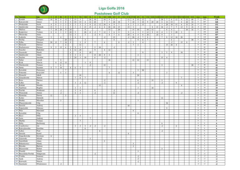 Liga Golfa 2016 Postołowo Golf Club Poz. Nazwisko Imię 1 2 3 4 5 6 7 8 9 10 11 12 13 14 15 16 17 18 19 20 21 22 23 24 25 26 27 28 29 30 31 32 33 34 35 36 37 38 39 40 41 42 43 44 45 46 47 48 49 50 51 52 53 54 55 56 57 58 Tomasz Janusz Jacek Dominik Piotr Tomasz Anna Tomasz Grzegorz Mariusz Dariusz Dariusz Radosław Marek Adam Jarosław Leszek Marcin Tomasz Szymon Patrycjusz Krzysztof Jakub Marcin Dariusz Jan Monika Bogdan Waldemar Antoni Dorota Dominik Mirosław Filip Andrzej Mateusz Sławomir Filip Mike Andrzej Tomasz Bartłomiej Jan Karolina Piotr Kamil Krystyna Michał Adam Marek Bartosz Robert Marek Małgorzata Ireneusz Andrzej Marcin Włodzimierz Kordek Karczewski Wodzyński Jakubowski Malissa Karpowicz Morawska Ładocha Sochaj Pełka Dymecki Ruchniewicz Iwaszko Guzowski Jakubowski Sztyber Sykut Kruk Onichowski Sarna Kowalski Piskorski Dymecki Gniazdowski Koss Łabas Kubiak Szpilman Pawlak Wiercinski Dymecka Kolan Brańka Płaszczykowski Sawicki Papużyński Woś Kowalski Ricci Justa Martko Babij Czachowicz Kulczykowska Lubos Sawicki Zajączkowska Guzowski Szarafiński Bokuniewicz Brzoska Brzozowski Pisarski Brzezińska-Pawlak Ćwirko Janik Karwacki Smolnicki I II III IV V VI VII 10 20 12 6 9 10 4 8 3 3 3 20 3 12 8 3 3 9 5 7 5 3 3 10 20 12 3 15 9 15 10 3 3 3 15 3 3 4 15 7 8 3 20 9 4 15 5 8 5 7 7 15 9 12 6 10 5 20 10 4 6 3 8 6 3 3 5 3 4 9 12 3 20 VIII 4 3 15 9 20 3 IX X 20 12 8 15 10 20 12 -2 6 -2 -2 XI XII XIII XIV 12 6 10 7 20 8 9 5 4 20 15 3 8 5 20 9 10 7 9 3 3 12 3 20 8 4 3 12 -2 3 8 7 3 5 9 6 7 15 8 6 XV 10 7 15 20 9 6 8 10 XVI XVII XVIII XIX 12 7 8 15 9 20 -2 -2 6 10 3 4 -2 9 4 20 9 -2 9 -2 3 8 12 9 20 15 12 10 4 9 7 8 15 8 15 10 7 4 5 3 12 6 -2 20 12 15 7 20 10 -2 -2 12 3 5 9 10 15 12 12 4 15 5 20 12 20 3 3 7 -2 -2 6 -2 15 3 -2 9 4 3 8 -2 -2 12 10 -2 -2 12 3 7 10 10 9 9 8 5 7 7 3 2 3 6 -2 -2 6 -2 -2 8 -2 6 6 5 5 3 3 3 3 -2 -2 -2 -2 -2 8 8 3 3 40 14 24 18 16 20 15 7 3 9 3 XXX 5 20 12 12 20 15 9 10 30 15 3 3 8 9 8 6 12 3 6 2 10 12 20 8 7 20 7 12 20 -2 6 3 12 5 3 9 20 8 3 10 7 7 3 7 5 8 7 6 4 XXI XXII XXIII XXIV XXV XXVI XXVII XXVIII XXIX 15 3 10 6 12 10 15 9 15 6 10 XX 3 10 3 4 3 7 15 3 3 -2 10 15 8 10 5 3 15 6 4 20 6 Kary 0 Suma 284 0 287 0 224 -4 228 0 183 -2 199 -2 124 -6 118 0 104 -4 119 0 69 -2 66 0 65 0 60 0 60 -2 59 0 58 0 47 -2 44 0 42 0 32 0 32 0 30 0 27 -2 22 -6 20 0 19 0 19 -4 16 -8 15 0 15 0 12 0 10 0 10 0 10 0 9 0 9 0 8 0 8 0 7 0 7 0 6 -8 6 0 6 -2 6 0 6 0 6 0 5 0 5 0 3 0 3 0 3 0 3 -2 -2 -2 -2 -2 -2 -2 -2 -2 -2 Wynik 178 168 152 146 138 129 107 105 104 103 69 66 65 60 60 59 58 47 44 42 32 32 30 27 22 20 19 19 16 15 15 12 10 10 10 9 9 8 8 7 7 6 6 6 6 6 6 5 5 3 3 3 3 -2 -2 -2 -2 -2