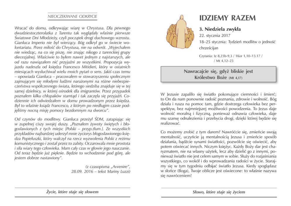 NIEOCZEKIWANE ODKRYCIE Wracać do domu, odkrywając wiarę w Chrystusa. Dla pewnego dwudziestoczterolatka z Tarentu tak wyglądały właśnie pierwsze Światowe Dni Młodzieży, czyli początek drogi duchowego wzrostu. Gianluca Imperio nie był wierzący. Bóg odkrył go w świecie wolontariatu. Przez miłość do Chrystusa, nie na odwrót. „Wyjechałem nie wiedząc, na co się piszę, nie znając nikogo z tarenckiej grupy diecezjalnej. Właściwie to byłem nawet jednym z najstarszych, ale od razu nawiązałem nić przyjaźni ze wszystkimi. Propozycja wyjazdu nadeszła od księdza Francesco Mitidieri, który w ostatnich miesiącach wysłuchiwał wielu moich pytań o sens. Jakiś czas temu – opowiada Gianluca – pracowałem w stowarzyszeniu społecznym zajmującym się młodymi ludźmi narażonymi na różne niebezpieczeństwa współczesnego świata, którego siedziba znajduje się w tej samej dzielnicy, w której ośrodek dla imigrantów. Przez przypadek poznałem kilku chłopaków stamtąd i tak zaczęła się przyjaźń. Codziennie ich odwiedzałem w domu prowadzonym przez księdza. Był to właśnie ksiądz Francesco, z którym po niedługim czasie podjęliśmy nocną misję pomocy bezdomnym na dworcu”. Od czynów do modlitwy. Gianluca przeżył ŚDM, zatapiając się w zupełnej ciszy swojej duszy. „Poznałem żywoty świętych i błogosławionych z tych miejsc [Polski – przyp.tłum.]. Ze wszystkich przykładów najbardziej uderzył mnie życiorys błogosławionego księdza Popiełuszki, który walczył na rzecz wyzwolenia Polski z reżimu komunistycznego i został przez to zabity. Oczarowała mnie prostota i siła wiary tego człowieka. Mam cały czas w głowie jego nauczanie. Od teraz będzie już pięknie. Będzie to wchodzenie pod górę, ale jestem dobrze nastawiony”. (z czasopisma „Avvenire”, 28.09. 2016 – tekst Mariny Luzzi) Życie, które staje się słowem Idziemy razem 3. Niedziela zwykła 22. stycznia 2017 18–25 stycznia: Tydzień modlitw o jedność chrześcijan Czytania: Iz 8,23b-9,3 / 1Kor 1,10–13.17 / / Mt 4,12–23 Nawracajcie się, gdyż bliskie jest Królestwo Boże (Mt 4,17) W Jezusie zapaliło się światło pokonujące ciemności i śmierć; to On da nam ponownie radość poznania, zdrowie i wolność. Bóg działa i rusza na pomoc tam, gdzie dostrzega człowieka bez perspektyw, bez najmniejszej możliwości powodzenia. To Jezus daje wolność moralną i fizyczną, ponieważ odnawia człowieka, daje mu szansę odnalezienia i przebycia drogi, dzięki której będzie się realizować. Co możemy zrobić z tym darem? Nawróćcie się, zmieńcie swoją mentalność, uczyńcie ją mentalnością Jezusa i zmieńcie sposób działania, bądźcie synami światłości, pozwólcie się oświecić, aby potem oświecać innych. Niczym księżyc. Każdy Boży dar jest charyzmatem, nie na własny użytek, lecz aby dzielić go z innymi, ponieważ światło nie jest celem samym w sobie. Służy do rozjaśniania wszystkiego, co wokół i do wprowadzania radości w życie. Starajmy się w tym tygodniu odbijać światło Jezusa. Kiedy spoglądasz w słońce (Boga), Twoje oblicze jest oświecone: to właśnie nazywa się nawróceniem! Słowo, które staje się życiem