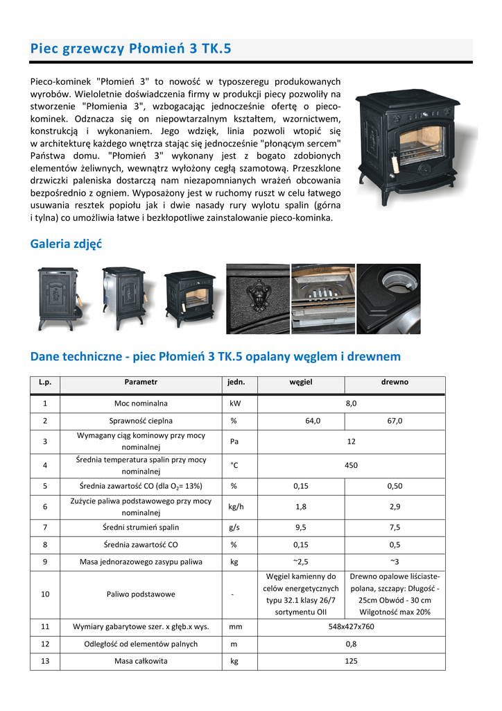 Piec grzewczy Płomień 3 TK.5 Pieco-kominek "Płomień 3" to nowość w typoszeregu produkowanych wyrobów. Wieloletnie doświadczenia firmy w produkcji piecy pozwoliły na stworzenie "Płomienia 3", wzbogacając jednocześnie ofertę o piecokominek. Odznacza się on niepowtarzalnym kształtem, wzornictwem, konstrukcją i wykonaniem. Jego wdzięk, linia pozwoli wtopić się w architekturę każdego wnętrza stając się jednocześnie "płonącym sercem" Państwa domu. "Płomień 3" wykonany jest z bogato zdobionych elementów żeliwnych, wewnątrz wyłożony cegłą szamotową. Przeszklone drzwiczki paleniska dostarczą nam niezapomnianych wrażeń obcowania bezpośrednio z ogniem. Wyposażony jest w ruchomy ruszt w celu łatwego usuwania resztek popiołu jak i dwie nasady rury wylotu spalin (górna i tylna) co umożliwia łatwe i bezkłopotliwe zainstalowanie pieco-kominka. Galeria zdjęć Dane techniczne - piec Płomień 3 TK.5 opalany węglem i drewnem L.p. Parametr jedn. 1 Moc nominalna kW 2 Sprawność cieplna % 3 4 Wymagany ciąg kominowy przy mocy nominalnej Średnia temperatura spalin przy mocy nominalnej węgiel drewno 8,0 64,0 67,0 Pa 12 °C 450 5 Średnia zawartość CO (dla O2= 13%) % 0,15 0,50 6 Zużycie paliwa podstawowego przy mocy nominalnej kg/h 1,8 2,9 7 Średni strumień spalin g/s 9,5 7,5 8 Średnia zawartość CO % 0,15 0,5 9 Masa jednorazowego zasypu paliwa kg ~2,5 ~3 - Węgiel kamienny do celów energetycznych typu 32.1 klasy 26/7 sortymentu OII Drewno opalowe liściastepolana, szczapy: Długość 25cm Obwód - 30 cm Wilgotność max 20% 10 Paliwo podstawowe 11 Wymiary gabarytowe szer. x głęb.x wys. mm 548x427x760 12 Odległość od elementów palnych m 0,8 13 Masa całkowita kg 125 Budowa
