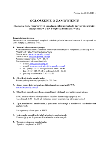 Poręby, dn. 20.03.2013 r. OGŁOSZENIE O ZAMÓWIENIU (Dostawa 4 szt. rezerwowych urządzeń chłodniczych do hurtowni surowic i szczepionek w CBR Poręby k/Zduńskiej Woli.) Przedmiot zamówienia Dostawa 4 szt. rezerwowych urządzeń chłodniczych do hurtowni surowic i szczepionek w CBR Poręby k/Zduńskiej Woli. 1. Nazwa i adres zamawiającego: Centralna Baza Rezerw Sanitarno-Przeciwepidemicznych w Porębach k/Zduńskiej Woli Wieś Poręby 26a, 98-220 Zduńska Wola Strona www: www.cbr-poreby.com.pl Adres e-mail: [email protected] Godziny urzędowania: 7.30 – 15.30 Szczegółowych informacji udziela: e-mail: [email protected] e-mail: [email protected] tel.: (043) 823-57-70 w godzinach 8.00 – 13.00 fax.: (0-43) 823-57-62 w godzinach 8.00 – 13.00 godziny urzędowania: 7.30 – 15.30 2. Określenie trybu zamówienia: Przetarg nieograniczony powyżej 14.000 Euro 3. Adres strony internetowej, na której zamieszczony jest SIWZ: www.cbr-poreby.com.pl 4. Określenie sposobu uzyskania specyfikacji istotnych warunków zamówienia: SIWZ można odebrać nieodpłatnie w siedzibie Zamawiającego pokój nr 1 w godzinach 8.00 – 13.00 lub pobrać ze strony internetowej, adres jak w pkt.3 5. Opis przedmiotu zamówienia, z podaniem informacji o możliwości składania ofert częściowych: Szczegółowy zakres ujęto w SIWZ . 6. Informacja o możliwości złożenia oferty wariantowej: Zamawiający nie dopuszcza składnia ofert wariantowych 7. Termin wykonania zamówienia: Zgodnie z zapisami w SIWZ 8. Opis warunków udziału w postępowaniu oraz opis sposobu dokonywania oceny spełniania tych warunków: Warunki udziału i sposób dokonywania oceny zawarte w SIWZ. 9. Kryteria oceny ofert: Cena 100% 10. Miejsce i termin składania ofert: W siedzibie zamawiającego: Centralna Baza Rezerw Sanitarno-Przeciwepidemicznych w Porębach k/Zduńskiej Woli Wieś Poręby 26 a 98-220 Zduńska Wola Pokój nr 1 Do dnia 09.04.2013 r. do godziny 08.30 11. Miejsce i termin otwarcia ofert: W siedzibie zamawiającego: Centralna Baza Rezerw Sanitarno-Przeciwepidemicznych w Porębach k/Zduńskiej Woli Wieś Poręby 26 a 98-220 Zduńska Wola Pokój nr 3 Dnia 09.04.2013 r. o godzinie 09:00 12. Termin związania ofertą: okres 30 dni (od ostatecznego terminu składania ofert) Ogłoszenie zostało opublikowane w Portalu Urzędu Zamówień Publicznych pod nr 111344-2013 w dniu 20.03.2013 roku.