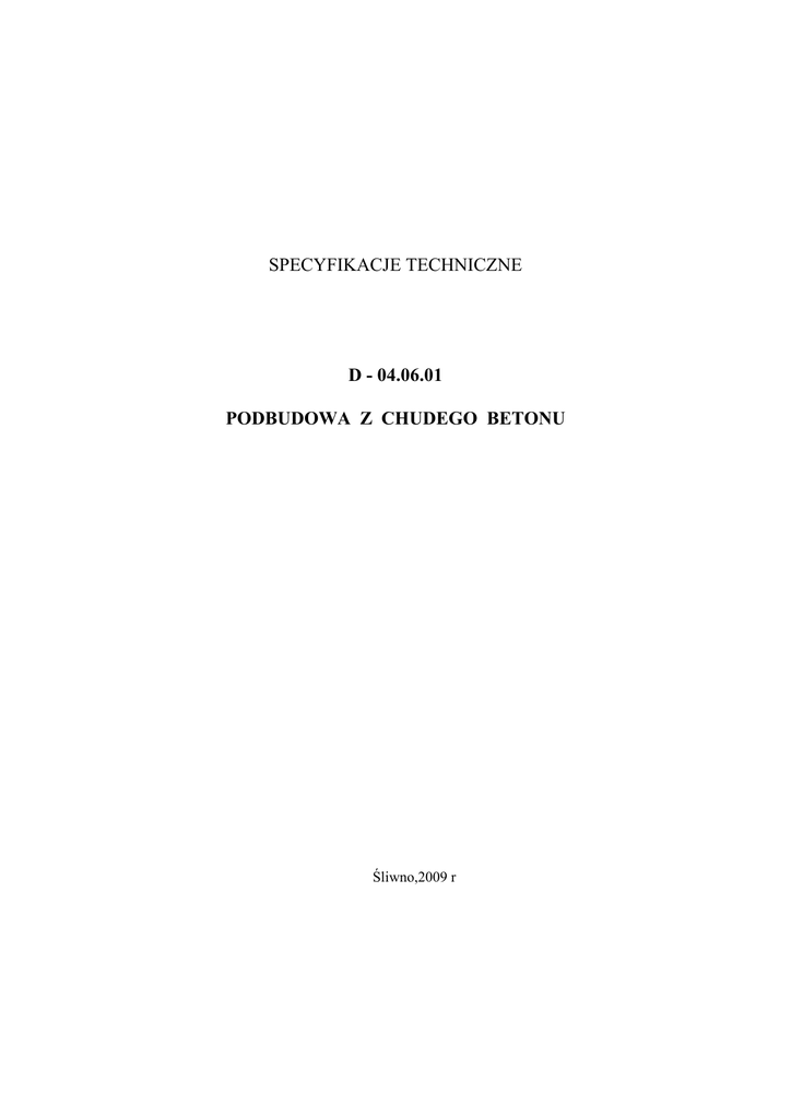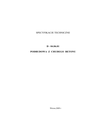 SPECYFIKACJE TECHNICZNE D - 04.06.01 PODBUDOWA Z CHUDEGO BETONU Śliwno,2009 r SPIS TREŚCI 1. WSTĘP ........................................................................................................................... 3 2. MATERIAŁY ................................................................................................................ 4 3. SPRZĘT.......................................................................................................................... 5 4. TRANSPORT................................................................................................................. 5 5. WYKONANIE ROBÓT................................................................................................ 6 6. KONTROLA JAKOŚCI ROBÓT.............................................................................. 10 7. OBMIAR ROBÓT....................................................................................................... 14 8. ODBIÓR ROBÓT ....................................................................................................... 14 9. PODSTAWA PŁATNOŚCI ........................................................................................ 15 10. PRZEPISY ZWIĄZANE............................................................................................. 15 NAJWAśNIEJSZE OZNACZENIA I SKRÓTY OST SST IBDiM CZDP - ogólna specyfikacja techniczna - szczegółowa specyfikacja techniczna - Instytut Badawczy Dróg i Mostów - Centralny Zarząd Dróg Publicznych D-04.06.01 Podbudowa z chudego betonu 3 1. WSTĘP 1.1. Przedmiot ST Przedmiotem niniejszej Specyfikacji technicznej (ST) są wymagania dotyczące wykonania i odbioru robót związanych z wykonywaniem podbudowy z chudego betonu klasy B-7,5 przy przebudowie schodów przy pomniku wraz z budową miejsc parkingowych w Świdwinie. 1.2. Zakres stosowania ST Specyfikacja techniczna (ST) stanowi dokument przetargowy i kontraktowy przy zlecaniu i realizacji robót wymienionych w punkcie 1.1. 1.3. Zakres robót objętych ST Ustalenia zawarte w niniejszej specyfikacji dotyczą zasad prowadzenia robót związanych z wykonywaniem podbudowy z chudego betonu. Podbudowa z chudego betonu moŜe być wykonywana dla dróg o kategorii ruchu od KR1 do KR6 wg „Katalogu typowych konstrukcji nawierzchni sztywnych”, IBDiM 2001 r. [25]. W przypadku wykonywania nawierzchni betonowej, podbudowę z chudego betonu zaleca się dla dróg o kategorii ruchu od KR3 do KR6 w zaleŜności od rodzaju gruntu w podłoŜu. Tablica 1. Klasyfikacja ruchu ze względu na liczbę osi obliczeniowych Liczba osi obliczeniowych na dobę na pas obliczeniowy Kategoria ruchu KR1 KR2 KR3 KR4 KR5 KR6 obciąŜenie osi 100 kN ≤ 12 od 13 do 70 od 71 do 335 od 336 do 1000 od 1001 do 2000 2001 i więcej 1) obciąŜenie osi 115 kN ≤7 od 8 do 40 od 41 do 192 od 193 do 572 od 573 do 1144 1145 i więcej 1) 1) Obliczenia konstrukcji wykonano dla 4000 osi 100 kN lub 2280 osi 115 kN Podbudowę z chudego betonu wykonuje się, zgodnie z ustaleniami podanymi w dokumentacji projektowej, jako: − podbudowę zasadniczą. 1.4. Określenia podstawowe 1.4.1. Podbudowa z chudego betonu - jedna warstwa zagęszczonej mieszanki betonowej, która po osiągnięciu wytrzymałości na ściskanie nie mniejszej niŜ 6 MPa i nie większej niŜ 9 MPa, stanowi fragment nośnej części nawierzchni drogowej. 4 Podbudowa z chudego betonu D-04.06.01 1.4.2. Chudy beton - materiał budowlany powstały przez wymieszanie mieszanki kruszyw z cementem w ilości od 5% do 7% w stosunku do kruszywa lecz nie przekraczającej 130 kg/m3 oraz optymalną ilością wody, który po zakończeniu procesu wiązania osiąga wytrzymałość na ściskanie R28 w granicach od 6 do 9 MPa. 1.4.2. Pozostałe określenia podstawowe są zgodne z obowiązującymi, odpowiednimi polskimi normami i z definicjami podanymi w ST D-M-00.00.00 „Wymagania ogólne” pkt 1.4. 1.5. Ogólne wymagania dotyczące robót Ogólne wymagania dotyczące robót podano w ST D-M-00.00.00 „Wymagania ogólne” pkt 1.5. 2. MATERIAŁY 2.1. Ogólne wymagania dotyczące materiałów Ogólne wymagania dotyczące materiałów, ich pozyskiwania i składowania podano w ST D-M-00.00.00 „Wymagania ogólne” pkt 2. 2.2. Cement NaleŜy stosować cementy powszechnego uŜytku: portlandzki CEM I klasy 32,5 N, cement portlandzki wieloskładnikowy CEM II klasy 32,5 N, cement hutniczy CEM III klasy 32,5 N, cement pucolanowy CEM IV klasy 32,5 N według PN-EN 197-1:2002 [5] . Wymagania dla cementu zestawiono w tablicy 2. Tablica 2. Wymagania dla cementu do chudego betonu Lp. Właściwości Klasa cementu 32,5 1 Wytrzymałość na ściskanie (MPa), po 7 dniach, nie mniej niŜ: 16 2 Wytrzymałość na ściskanie (MPa), po 28 dniach, nie mniej niŜ: 32,5 3 Początek czasu wiązania, min , nie wcześniej niŜ: 75 4 Stałość objętości, mm, nie więcej niŜ: 10 Przechowywanie cementu powinno się odbywać zgodnie z BN-88/6731-08 [22]. 2.3. Kruszywo − − − − − Do wykonania mieszanki chudego betonu naleŜy stosować: Ŝwir i mieszankę wg PN-B-11111:1996 [14], piasek wg PN-B-11113:1996 [16], kruszywo łamane wg PN-B-11112:1996 [15] i WT/MK-CZDP84 [26], kruszywo ŜuŜlowe z ŜuŜla wielkopiecowego kawałkowego wg PN-B-23004: 1988 [17], kruszywo z recyklingu betonu o ziarnach większych niŜ 4 mm. D-04.06.01 Podbudowa z chudego betonu 5 Kruszywo powinno spełniać wymagania określone w normie PN-S-96013:1997 [20]. Kruszywo ŜuŜlowe powinno być całkowicie odporne na rozpad krzemianowy według PN-B-06714-37:1980 [12] i Ŝelazawy według PN-B-06714-39:1978 [13]. 2.4. Woda Do wytwarzania mieszanki betonowej jak i do pielęgnacji wykonanej podbudowy naleŜy stosować wodę odpowiadającą wymaganiom normy PN-B-32250:1988 [18]. Bez badań laboratoryjnych moŜna stosować wodociągową wodę pitną. 2.6. Materiały do pielęgnacji podbudowy z chudego betonu − − − − Do pielęgnacji podbudowy z chudego betonu mogą być stosowa