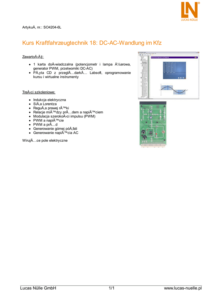 ArtykuÅ‚ nr.: SO4204-6L Kurs Kraftfahrzeugtechnik 18: DC-AC-Wandlung im Kfz Zawartość: 1 karta doÅ›wiadczalna (potencjometr i lampa żarowa, generator PWM, przetworniki DC-AC) PÅ‚yta CD z przeglÄ…darkÄ… Labsoft, oprogramowanie kursu i wirtualne instrumenty TreÅ›ci szkoleniowe: Indukcja elektryczna SiÅ‚a Lorentza ReguÅ‚a prawej rÄ™ki Relacje miÄ™dzy prÄ…dem a napiÄ™ciem Modulacja szerokoÅ›ci impulsu (PWM) PWM a napiÄ™cie PWM a prÄ…d Generowanie górnej póÅ‚fali Generowanie napiÄ™cia AC WirujÄ…ce pole elektryczne Lucas Nülle GmbH 1/1 www.lucas-nuelle.pl