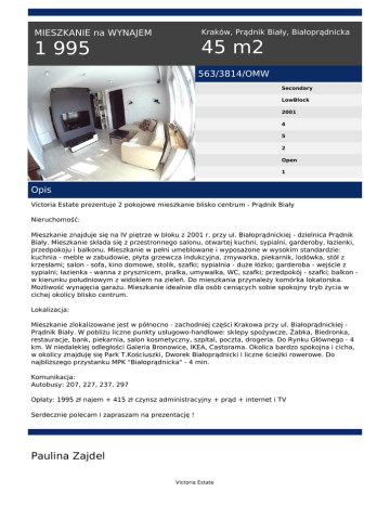 Kraków, Prądnik Biały, Białoprądnicka MIESZKANIE na WYNAJEM 45 m2 1 995 563/3814/OMW Secondary LowBlock 2001 4 5 2 Open 1 Opis Victoria Estate prezentuje 2 pokojowe mieszkanie blisko centrum - Prądnik Biały Nieruchomość: Mieszkanie znajduje się na IV piętrze w bloku z 2001 r. przy ul. Białoprądnickiej - dzielnica Prądnik Biały. Mieszkanie składa się z przestronnego salonu, otwartej kuchni, sypialni, garderoby, łazienki, przedpokoju i balkonu. Mieszkanie w pełni umeblowane i wyposażone w wysokim standardzie: kuchnia - meble w zabudowie, płyta grzewcza indukcyjna, zmywarka, piekarnik, lodówka, stół z krzesłami; salon - sofa, kino domowe, stolik, szafki; sypialnia - duże łóżko; garderoba - wejście z sypialni; łazienka - wanna z prysznicem, pralka, umywalka, WC, szafki; przedpokój - szafki; balkon w kierunku południowym z widokiem na zieleń. Do mieszkania przynależy komórka lokatorska. Możliwość wynajęcia garażu. Mieszkanie idealnie dla osób ceniących sobie spokojny tryb życia w cichej okolicy blisko centrum. Lokalizacja: Mieszkanie zlokalizowane jest w północno - zachodniej części Krakowa przy ul. Białoprądnickiej Prądnik Biały. W pobliżu liczne punkty usługowo-handlowe: sklepy spożywcze, Żabka, Biedronka, restauracje, bank, piekarnia, salon kosmetyczny, szpital, poczta, drogeria. Do Rynku Głównego - 4 km. W niedalekiej odległości Galeria Bronowice, IKEA, Castorama. Okolica bardzo spokojna i cicha, w okolicy znajduję się Park T.Kościuszki, Dworek Białoprądnicki i liczne ścieżki rowerowe. Do najbliższego przystanku MPK "Białoprądnicka" - 4 min. Komunikacja: Autobusy: 207, 227, 237, 297 Opłaty: 1995 zł najem + 415 zł czynsz administracyjny + prąd + internet i TV Serdecznie polecam i zapraszam na prezentację ! Paulina Zajdel Victoria Estate tel. +48 789 453 049 email: [email protected] Victoria Estate Powered by TCPDF (www.tcpdf.org)