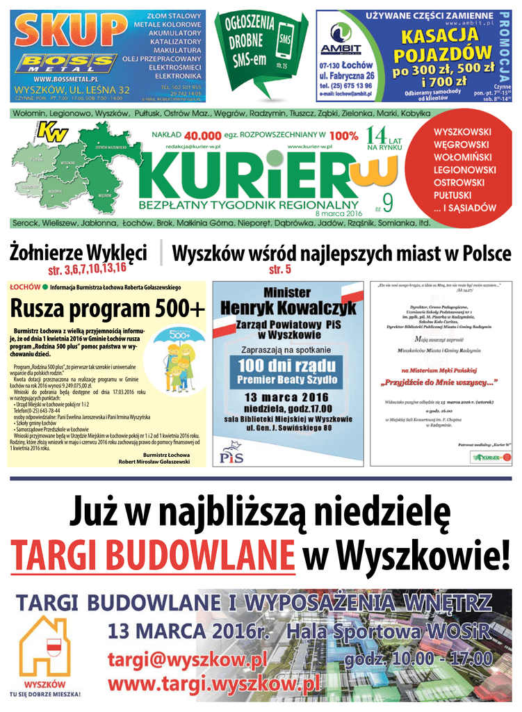 8 marca 2016 Żołnierze Wyklęci 16 str. 3,6,7,10,13, nr 9 Wyszków wśród najlepszych miast w Polsce str. 5 ŁOCHÓW l Informacja Burmistrza Łochowa Roberta Gołaszewskiego Rusza program 500+ Burmistrz Łochowa z wielką przyjemnością informuje, że od dnia 1 kwietnia 2016 w Gminie Łochów rusza program „Rodzina 500 plus” pomoc państwa w wychowaniu dzieci. Program„Rodzina 500 plus”„to pierwsze tak szerokie i uniwersalne wsparcie dla polskich rodzin.” Kwota dotacji przeznaczona na realizację programu w Gminie Łochów na rok 2016 wynosi 9.249.075,00 zł. Wnioski do pobrania będą dostępne od dnia 17.03.2016 roku w następujących punktach: • Urząd Miejski w Łochowie pokój nr 1 i 2 Telefon(0-25) 643-78-44 osoby odpowiedzialne: Pani Ewelina Jaroszewska i Pani Irmina Wyszyńska • Szkoły gminy Łochów • Samorządowe Przedszkole w Łochowie Wnioski przyjmowane będą w Urzędzie Miejskim w Łochowie pokój nr 1 i 2 od 1 kwietnia 2016 roku. Rodziny, które złożą wniosek w maju i czerwcu 2016 roku zachowują prawo do pomocy finansowej od 1 kwietnia 2016 roku. Burmistrz Łochowa Robert Mirosław Gołaszewski Już w najbliższą niedzielę TARGI BUDOWLANE w Wyszkowie! 2 8 marca 2016 SOBOTNIE SPOTKANIE Z EDUKACJĄ W I JĘZYKOWEJ SZKOLE PODSTAWOWEJ ZDZ W WYSZKOWIE klasowych, uczniowie nie noszą tornistrów – lekcje odrabiają pod okiem nauczyciela świetlicy, codziennie uczą się języka angielskiego oraz dodatkowo dwa razy w tygodniu języka hiszpańskiego i bardzo chętnie uczestniczą w klubach badawczych: chemika, podróżnika, MasterChefa i naukowca oraz w zajęciach z logopedii i gim- W sobotę, 27 lutego odbył się dzień otwarty w I JSP w Wyszkowie. Przyszli uczniowie mieli możliwość poznać budynek szkoły, uczestniczyć w ciekawych zajęciach językowych, interaktywnych i doświadczalnych. Rodzice natomiast zapoznali się z ofertą placówki a także wzięli udział w warsztatach oraz wykładzie na temat „Dojrzałości dziecka do nauki w szkole”, które poprowadzili specjaliści w dziedzinie pedagogiki i psychologii dziecięcej pani Joanna Korczakowska i pani Edyta Puławska oraz w prelekcji na temat „ Roli oceny kształtującej w rozwoju dziecka” prowadzonej przez pedagoga, trenera i edukatora oświaty Eugeniusza Nowickiego. Dyrekcja oraz grono pedagogiczne serdecznie dziękuje wszystkim gościom oraz zaprasza do współpracy z placówką. Podkreślamy, że w I JSP prowadzimy edukację w małolicznych zespołach , - Ekologiczni uczniowie w Gminie Wyszków Gmina Wyszków prowadząc placówki oświatowe w dużej mierze stawia na rozwój ekologii wśród dzieci i młodzieży. Od lat wspiera inicjatywy szkolne związane z organizacją konkursów z przedmiotów przyrodniczych. W obecnym roku szkolnym Gmina Wyszków zrealizowała dwa zadania z zakresu rozwoju edukacji ekologicznej wśród uczniów dofinansowane ze środków Wojewódzkiego Funduszu Ochrony Środowiska i Gospodarki Wodnej w Warszawie. Pierwszym z nich był projekt pn. „Ekologiczni Wyszkowianie – kampania edukacyjna dla mieszkańców Gminy Wyszków”. Projekt miał na celu podniesienie świadomości społeczeństwa Wyszkowa na temat stanu i ochrony środowiska naturalnego poprzez przybliżenie zagadnień związanych m.in. z niską emisją poprzez organizację warsztatów dla uczniów, wyjazdu do obiektu przyrodniczego i warsztatów dla mieszkańców. Całkowita wartość zadania wyniosła 6 840,69 zł, zaś otrzymane z WFOŚiGW dofinansowanie 6 156,62 zł, co stanowi 90% całkowitych wydatków. Drugim zadaniem był projekt pn.: „Eko uczniowie! - rozwój edukacyjnej infrastruktury terenowej”. Celem ogólnym zadania było podniesienie wiedzy wśród uczniów Szkoły Podstawowej nr 1, Zespołu Szkół w Wyszkowie oraz przedszkolaków Przedszkola nr 9 w Wyszkowie w zakresie fauny i flory Mazowsza w warunkach terenowych wraz z zapobieganiem antropogenizacji środowiska naturalnego. Celem szczegółowym było doposażenie istniejących ścieżek edukacyjnych, ogródków botanicznych w trzech ww. placówkach oświatowych. W efekcie przy placówkach powstały ścieżki edukacyjno-przyrodnicze i mini-ogródki doposażone w tablice edukacyjne, kosze na śmieci, ławki oraz pomoce dydaktyczne. Koszt całkowity zadania wyniósł 40 207,00 zł, zaś otrzymane z WFOŚiGW dofinansowanie 32 926,70 zł, co stanowi 82% kosztów całego zadania. Gmina Wyszków planuje kontynuację podjętych działań w kierunku rozwoju infrastruktury ekologicznej w prowadzonych przez siebie placówkach. Obecnie przygotowywane są wnioski o dofinansowanie na stworzenie kolejnych ścieżek edukacyjnych przy szkołach i przedszkolu. nastyki korekcyjno-kompensacyjnej. Więcej szczegółów na stronie www. jspwyszkow.edu.pl. REKLAMY JUŻ OD 1290 ZŁ e-mail: [email protected] 8 marca 2016 3 WYSZKÓW l Obchody Narodowego Dnia Pamięci „Żołnierzy Wyklętych” W hołdzie poległym i pomordowanym 1 marca, to dzień szczególny w całej Polsce - obchodzimy święto Żołnierzy Wyklętych, ale przede wszystkim przywracamy pamięć o żołnierzach w walce o niepodległą ojczyznę niezłomnych i niepokonanych. W Wyszkowie do uczczenia Narodowego Dnia Pamięci 1 marca 2016 r. zaprosili: Prawo i Sprawiedliwość w Wyszkowie oraz Światowy Związek Żołnierzy Armii Krajowej Obwód „Rajski - Ptak”. Wyszkowskie obchody odbyły się przy pomniku poświęconym poległym i pomordowanym żołnierzom antykomunistycznego podziemia zbrojnego oraz cywilnym mieszkańcom ziemi wyszkowskiej w latach 1944-1952. Zebrani oddali hołd nie tylko 51 żołnierzyon, których upamiętnia pomnik „Żołnierzy Wyklętych” w Wyszkowie (przy moście kołowym), ale też wszystkim walczącym z komunistami o niepodległą Polskę. W obchodach udział wzięli: poseł na Sejm RP Daniel Milewski, w imieniu posła i sekretarza Stanu Marka Zagórskiego - dyrektor jego biura Łukasz Dudkiewicz, rodziny pomordowanych m.in. bratanek Jana Kmio