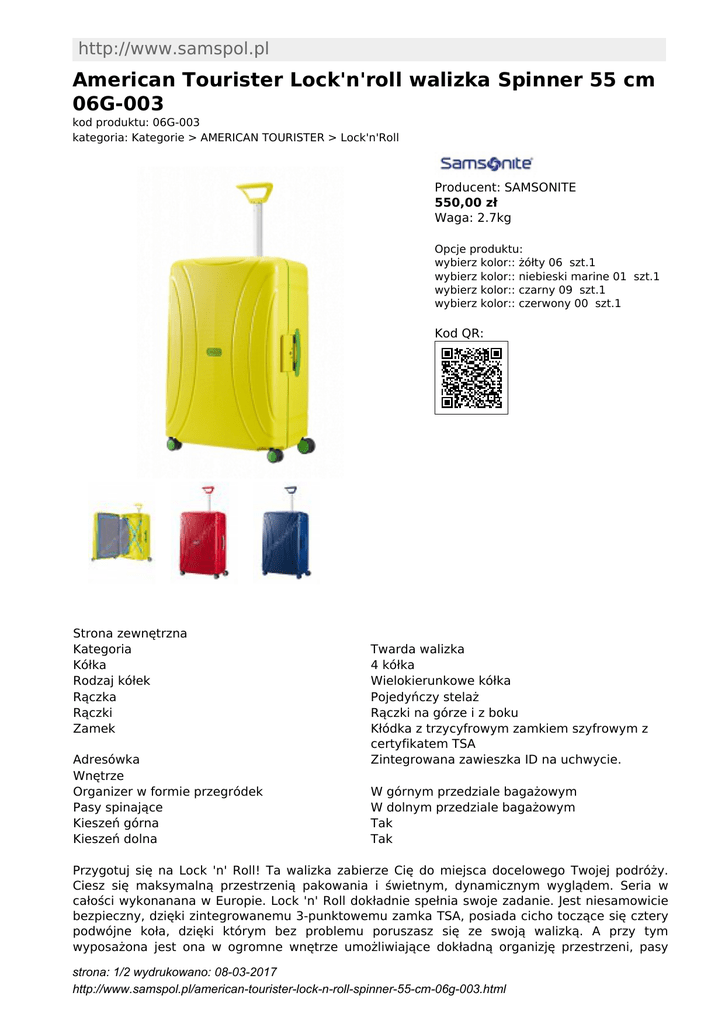 http://www.samspol.pl American Tourister Lock'n'roll walizka Spinner 55 cm 06G-003 kod produktu: 06G-003 kategoria: Kategorie > AMERICAN TOURISTER > Lock'n'Roll Producent: SAMSONITE 550,00 zł Waga: 2.7kg Opcje produktu: wybierz kolor:: żółty 06 szt.1 wybierz kolor:: niebieski marine 01 szt.1 wybierz kolor:: czarny 09 szt.1 wybierz kolor:: czerwony 00 szt.1 Kod QR: Strona zewnętrzna Kategoria Kółka Rodzaj kółek Rączka Rączki Zamek Adresówka Wnętrze Organizer w formie przegródek Pasy spinające Kieszeń górna Kieszeń dolna Twarda walizka 4 kółka Wielokierunkowe kółka Pojedyńczy stelaż Rączki na górze i z boku Kłódka z trzycyfrowym zamkiem szyfrowym z certyfikatem TSA Zintegrowana zawieszka ID na uchwycie. W górnym przedziale bagażowym W dolnym przedziale bagażowym Tak Tak Przygotuj się na Lock 'n' Roll! Ta walizka zabierze Cię do miejsca docelowego Twojej podróży. Ciesz się maksymalną przestrzenią pakowania i świetnym, dynamicznym wyglądem. Seria w całości wykonanana w Europie. Lock 'n' Roll dokładnie spełnia swoje zadanie. Jest niesamowicie bezpieczny, dzięki zintegrowanemu 3-punktowemu zamka TSA, posiada cicho toczące się cztery podwójne koła, dzięki którym bez problemu poruszasz się ze swoją walizką. A przy tym wyposażona jest ona w ogromne wnętrze umożliwiające dokładną organizję przestrzeni, pasy strona: 1/2 wydrukowano: 08-03-2017 http://www.samspol.pl/american-tourister-lock-n-roll-spinner-55-cm-06g-003.html krzyżowe i praktyczny, pojedynczy uchwyt. A wszystko to w kilku żywych kombinacjach kolorystycznych! strona: 2/2 wydrukowano: 08-03-2017 http://www.samspol.pl/american-tourister-lock-n-roll-spinner-55-cm-06g-003.html