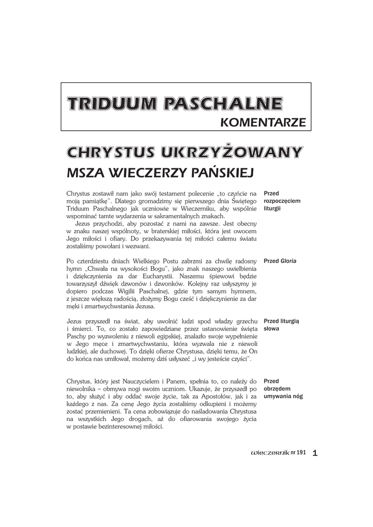 TRIDUUM PASCHALNE KOMENTARZE CHRYSTUS UKRZYŻOWANY MSZA WIECZERZY PAŃSKIEJ Chrystus zostawił nam jako swój testament polecenie „to czyńcie na moją pamiątkę”. Dlatego gromadzimy się pierwszego dnia Świętego Triduum Paschalnego jak uczniowie w Wieczerniku, aby wspólnie wspominać tamte wydarzenia w sakramentalnych znakach. Jezus przychodzi, aby pozostać z nami na zawsze. Jest obecny w znaku naszej wspólnoty, w braterskiej miłości, która jest owocem Jego miłości i ofiary. Do przekazywania tej miłości całemu światu zostaliśmy powołani i wezwani. Przed rozpoczęciem liturgii Po czterdziestu dniach Wielkiego Postu zabrzmi za chwilę radosny hymn „Chwała na wysokości Bogu”, jako znak naszego uwielbienia i dziękczynienia za dar Eucharystii. Naszemu śpiewowi będzie towarzyszył dźwięk dzwonów i dzwonków. Kolejny raz usłyszymy je dopiero podczas Wigilii Paschalnej, gdzie tym samym hymnem, z jeszcze większą radością, złożymy Bogu cześć i dziękczynienie za dar męki i zmartwychwstania Jezusa. Przed Gloria Jezus przyszedł na świat, aby uwolnić ludzi spod władzy grzechu Przed liturgią i śmierci. To, co zostało zapowiedziane przez ustanowienie święta słowa Paschy po wyzwoleniu z niewoli egipskiej, znalazło swoje wypełnienie w Jego męce i zmartwychwstaniu, która wyzwala nie z niewoli ludzkiej, ale duchowej. To dzięki ofierze Chrystusa, dzięki temu, że On do końca nas umiłował, możemy dziś usłyszeć „i wy jesteście czyści”. Chrystus, który jest Nauczycielem i Panem, spełnia to, co należy do niewolnika – obmywa nogi swoim uczniom. Ukazuje, że przyszedł po to, aby służyć i aby oddać swoje życie, tak za Apostołów, jak i za każdego z nas. Za cenę Jego życia zostaliśmy odkupieni i możemy zostać przemienieni. Ta cena zobowiązuje do naśladowania Chrystusa na wszystkich Jego drogach, aż do ofiarowania swojego życia w postawie bezinteresownej miłości. Przed obrzędem umywania nóg nr 191 1 Przed przygotowaniem darów Chrześcijanie na całym świecie gromadzą się dzisiaj, aby sprawować żywą pamiątkę ustanowienia Eucharystii. Dzięki niej jesteśmy umacniani mocą Ciała i Krwi Chrystusa na wszystkich naszych drogach. Każdy z nas, dzięki obecności Boga w Eucharystii, jest objęty Jego niezwykłą miłością, która prowadzi do spotkania w wieczności i nieustannego radowania się obecnością Tego, który dziś przychodzi pod postacią chleba i wina. LITURGIA MĘKI PAŃSKIEJ Przed rozpoczęciem liturgii W dzisiejszym dniu nie sprawuje się Eucharystii. Tabernakulum pozostaje puste. W centrum uwagi staje nie ołtarz, a krzyż. To przed Jezusem ukrzyżowanym, którego czcimy i adorujemy, przyklękamy aż do Wigilii Paschalnej. Również dzisiejsza liturgia rozpoczyna się od uczczenia Boga, który dał się przybić do krzyża. Kapłani padając przed Nim na twarz błagają o przebaczenie wszystkich naszych grzechów. My, w postawie klęczącej, dołączamy się w milczeniu do tej modlitwy. Przed Przez Jezusa, przez Jego miłość aż po krzyż, przychodzi zbawienie liturgią słowa wieczne dla wszystkich, którzy Go słuchają. To ostateczne i jedyne rozwiązanie, jedyna droga, jaką pokazał nam Zbawiciel. Tylko miłość ma taką moc, że zwycięża zło i przemienia człowieka – poprzez krzyż do chwały zmartwychwstania. Przed modlitwą powszechną Jezus przychodzi ze swoją miłością do wszystkich, bez wyjątku. Naszym zadaniem jest naśladowanie tej miłości, dlatego dziś pragniemy obejmować swoją modlitwą cały świat. Dzisiejsza modlitwa powszechna ma wyjątkową formę – po wypowiedzeniu przez kapłana intencji, obejmujemy modlitwą w ciszy wszystkie sprawy, które chcemy polecić Bogu. Następnie kapłan wypowiada modlitwę, która kończy się wspólnym „Amen”. Przed adoracją Nie ma innej drogi zbawienia, jak tylko przez krzyż. Przed tą tajemnicą krzyża przyklękamy dziś w pokorze adorując Jezusa, który wziął na siebie nasze grzechy i złożył swoje życie w ofierze, aby je zgładzić. Przez trzykrotne przyklęknięcie w czasie słów „pójdźmy z pokłonem” wyrażamy dziękczynienie i uwielbienie za wielki dar odkupienia. Przed procesją do Grobu Pańskiego 2 Po zdjęciu z krzyża, Ciało Jezusa zostało złożone w grobie, przy którym postawiono straż. Wspominając te wydarzenia i my za chwilę udamy się w procesji do ołtarza adoracji, w którym zostanie wystawiony Najświętszy Sakrament. My również możemy pozostać przy Ciele naszego Pana, adorując Go i czuwając na modlitwie. nr 191 CHRYSTUS POGRZEBANY W tym dniu nie celebruje się Eucharystii ani żadnych nabożeństw. Kościół „oczekuje powrotu Oblubieńca” modląc się liturgią godzin. CHRYSTUS ZMARTWYCHWSTAŁY WIGILIA PASCHALNA Już w pierwszych wiekach chrześcijaństwa przygotowanie do święta Zmartwychwstania koncentrowało się wokół czuwania na modlitwie, śpiewach i słuchaniu Słowa Bożego. Nasze życie jest natomiast nieustannym oczekiwaniem na powtórne przyjście Pana. Dlatego wspominając pierwsze przyjście Jezusa, zakończone śmiercią i zmartwychwstaniem, oczekujemy jednocześnie Jego powtórnego przyjścia, które nam zapowiedział. Przed rozpoczęciem liturgii Za chwilę kapłan poświęci rozpalony na zewnątrz ogień, a następnie zapali od niego paschał, który jest symbolem Zmartwychwstałego Pana. Dla podkreślenia tego faktu, kapłan wyżłobi w niej znak krzyża, pierwszą i ostatnią literę alfabetu greckiego: Alfę i Omegę oraz 4 cyfry bieżącego roku. Następnie z ciemności wejdziemy do kościoła za światłem Chrystusa, które otrzymaliśmy pierwszy raz na chrzcie świętym. Przed obrzędem światła Przed wiekami Bóg prowadził naród wybrany przez pustynię, z niewoli egipskiej do ziemi obiecanej, za pomocą poprzedzającego ich słupa ognia. My wszyscy, od dnia naszego chrztu, pielgrzymujemy do niebieskiej ojczyzny za Zmartwychwstałym Chrystuse