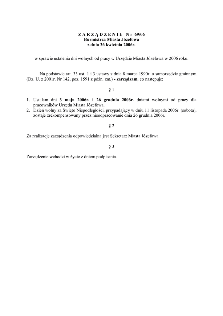 Z A R Z D Z E N I E N r 69/06 Burmistrza Miasta Józefowa z dnia 26 kwietnia 2006r. w sprawie ustalenia dni wolnych od pracy w Urz dzie Miasta Józefowa w 2006 roku. Na podstawie art. 33 ust. 1 i 3 ustawy z dnia 8 marca 1990r. o samorz dzie gminnym (Dz. U. z 2001r. Nr 142, poz. 1591 z pó n. zm.) - zarz dzam, co nast puje: §1 1. Ustalam dni 3 maja 2006r. i 26 grudnia 2006r. dniami wolnymi od pracy dla pracowników Urz du Miasta Józefowa. 2. Dzie wolny za wi to Niepodległo ci, przypadaj cy w dniu 11 listopada 2006r. (sobota), zostaje zrekompensowany przez nieodpracowanie dnia 26 grudnia 2006r. §2 Za realizacj zarz dzenia odpowiedzialna jest Sekretarz Miasta Józefowa. §3 Zarz dzenie wchodzi w ycie z dniem podpisania.