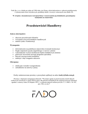 Fado Sp. z o.o. działa na rynku od 1984 roku, jest firmą z doświadczeniem w zakresie projektowania i wykonywania form wtryskowych, produkcji detali z tworzyw sztucznych oraz druku 3D. W związku z dynamicznym rozwojem firmy i rozszerzeniem jej działalności, poszukujemy kandydata na stanowisko: Przedstawiciel Handlowy Zakres obowiązków: aktywne pozyskiwanie klientów rozwijanie nowych kontaktów handlowych analiza rynku i konkurencji Wymagania: doświadczenie na podobnym stanowisku (warunek konieczny) biegła znajomość języka angielskiego w mowie i piśmie wykształcenie wyższe (techniczne będzie dodatkowym atutem) gotowość stworzenia nowego programu sprzedaży łatwość nawiązywania kontaktów ambicja i chęć osiągania sukcesów Oferujemy: atrakcyjne warunki wynagrodzenia zatrudnienie na umowę o pracę Osoby zainteresowane prosimy o przesyłanie aplikacji na adres [email protected]. Prosimy o dopisanie następującej klauzuli: "Wyrażam zgodę na przetwarzanie moich danych osobowych zawartych w mojej ofercie pracy dla potrzeb niezbędnych do realizacji procesu rekrutacji zgodnie z ustawą z dnia 29 sierpnia 1997 r. o ochronie danych osobowych (Dz. U. z 2002 r. Nr 101, poz. 926, ze zm.)"