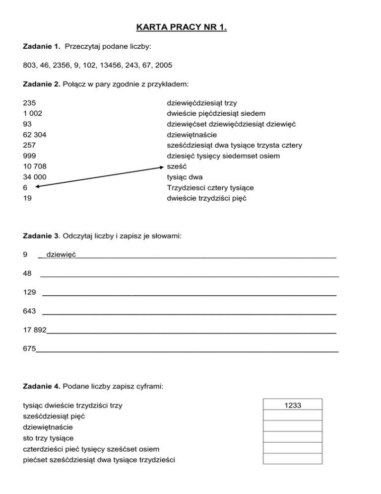 KARTA PRACY NR 1. Zadanie 1. Przeczytaj podane liczby: 803, 46, 2356, 9, 102, 13456, 243, 67, 2005 Zadanie 2. Połącz w pary zgodnie z przykładem: 235 dziewięćdziesiąt trzy 1 002 93 dwieście pięćdziesiąt siedem dziewięćset dziewięćdziesiąt dziewięć 62 304 dziewiętnaście 257 999 sześćdziesiąt dwa tysiące trzysta cztery dziesięć tysięcy siedemset osiem 10 708 34 000 sześć tysiąc dwa 6 19 Trzydziesci cztery tysiące dwieście trzydziści pięć Zadanie 3. Odczytaj liczby i zapisz je słowami: 9 __dziewięć_____________________________________________________________ 48 ______________________________________________________________________ 129 _____________________________________________________________________ 643 _____________________________________________________________________ 17 892____________________________________________________________________ 675_______________________________________________________________________ Zadanie 4. Podane liczby zapisz cyframi: tysiąc dwieście trzydziści trzy sześćdziesiąt pięć dziewiętnaście sto trzy tysiące czterdzieści pieć tysięcy sześćset osiem piećset sześćdziesiąt dwa tysiące trzydzieści 1233 Zadanie 4. Z cyfr 7,3,6,2,9 zbuduj liczbę i zapisz ją słowami: a) trzycyfrową : ______________________________________________________________________ ______________________________________________________________________ b) czterocyfrową: ______________________________________________________________________ ______________________________________________________________________ c) pięciocyfrową: ______________________________________________________________________ ______________________________________________________________________ Zadanie domowe Zadanie 1. Ile różnych liczb czterocyfrowych można zbudować z cyfr 8,3,5,6 tak żeby cyfry się nie powtarzały? Zadanie 2. Wybierz cztery dowolne liczby z zadania 1 i zapisz je słownie. Zadanie dla chętnych: Znajdź po dwie liczby dwucyfrowe spełniające podane waruki. a) Jeśli do jednej cyfry dodasz drugą cyfrę , to otrzymasz 9 (np: 54 bo 5 + 4= 9) Odp:...................... b) Jeśli od jednej cyfry odejmiesz drugą cyfrę, to otrzymasz 3. Odp:............................... c) Jeśli pomnożysz jedną cyfrę przez drugą cyfrą, to otrzymasz 12. Odp:...................................