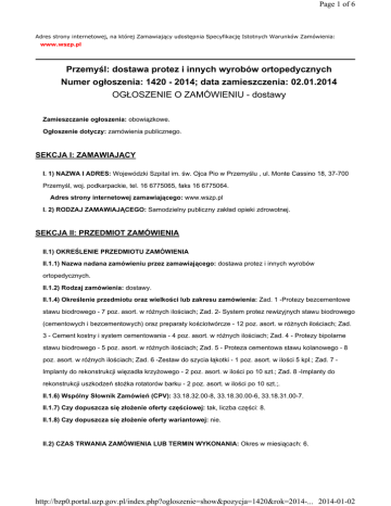 Page 1 of 6 Adres strony internetowej, na której Zamawiający udostępnia Specyfikację Istotnych Warunków Zamówienia: www.wszp.pl Przemyśl: dostawa protez i innych wyrobów ortopedycznych Numer ogłoszenia: 1420 - 2014; data zamieszczenia: 02.01.2014 OGŁOSZENIE O ZAMÓWIENIU - dostawy Zamieszczanie ogłoszenia: obowiązkowe. Ogłoszenie dotyczy: zamówienia publicznego. SEKCJA I: ZAMAWIAJĄCY I. 1) NAZWA I ADRES: Wojewódzki Szpital im. św. Ojca Pio w Przemyślu , ul. Monte Cassino 18, 37-700 Przemyśl, woj. podkarpackie, tel. 16 6775065, faks 16 6775064. Adres strony internetowej zamawiającego: www.wszp.pl I. 2) RODZAJ ZAMAWIAJĄCEGO: Samodzielny publiczny zakład opieki zdrowotnej. SEKCJA II: PRZEDMIOT ZAMÓWIENIA II.1) OKREŚLENIE PRZEDMIOTU ZAMÓWIENIA II.1.1) Nazwa nadana zamówieniu przez zamawiającego: dostawa protez i innych wyrobów ortopedycznych. II.1.2) Rodzaj zamówienia: dostawy. II.1.4) Określenie przedmiotu oraz wielkości lub zakresu zamówienia: Zad. 1 -Protezy bezcementowe stawu biodrowego - 7 poz. asort. w różnych ilościach; Zad. 2- System protez rewizyjnych stawu biodrowego (cementowych i bezcementowych) oraz preparaty kościotwórcze - 12 poz. asort. w różnych ilościach; Zad. 3 - Cement kostny i system cementowania - 4 poz. asort. w różnych ilościach; Zad. 4 - Protezy bipolarne stawu biodrowego - 5 poz. asort. w różnych ilościach; Zad. 5 - Proteza cementowa stawu kolanowego - 8 poz. asort. w różnych ilościach; Zad. 6 -Zestaw do szycia łąkotki - 1 poz. asort. w ilości 5 kpl.; Zad. 7 Implanty do rekonstrukcji więzadła krzyżowego - 2 poz. asort. w ilości po 10 szt.; Zad. 8 -Implanty do rekonstrukcji uszkodzeń stożka rotatorów barku - 2 poz. asort. w ilości po 10 szt.;. II.1.6) Wspólny Słownik Zamówień (CPV): 33.18.32.00-8, 33.18.30.00-6, 33.18.31.00-7. II.1.7) Czy dopuszcza się złożenie oferty częściowej: tak, liczba części: 8. II.1.8) Czy dopuszcza się złożenie oferty wariantowej: nie. II.2) CZAS TRWANIA ZAMÓWIENIA LUB TERMIN WYKONANIA: Okres w miesiącach: 6. http://bzp0.portal.uzp.gov.pl/index.php?ogloszenie=show&pozycja=1420&rok=2014-... 2014-01-02 Page 2 of 6 SEKCJA III: INFORMACJE O CHARAKTERZE PRAWNYM, EKONOMICZNYM, FINANSOWYM I TECHNICZNYM III.1) WADIUM Informacja na temat wadium: Warunkiem udziału w postępowaniu jest wniesienie wadium w wysokości j.n. oraz w terminie określonym w rozdziale XII w pkt. 1 SIWZ tj. 10.01.2014 r. do godz. 9:45 Zad. 1 1000,00 Zad. 2 - 1300,00 Zad. 3 - 260,00 Zad. 4- 1200,00 Zad. 5- 1500,00 Zad. 6 - 80,00 Zad. 7 - 280,00 Zad. 8 - 170,00 III.2) ZALICZKI III.3) WARUNKI UDZIAŁU W POSTĘPOWANIU ORAZ OPIS SPOSOBU DOKONYWANIA OCENY SPEŁNIANIA TYCH WARUNKÓW III. 3.1) Uprawnienia do wykonywania określonej działalności lub czynności, jeżeli przepisy prawa nakładają obowiązek ich posiadania Opis sposobu dokonywania oceny spełniania tego warunku Ocena spełniania tego warunku nastąpi na podstawie dołączonych do ofert oświadczeńzałącznik nr 4 SIWZ III.3.2) Wiedza i doświadczenie Opis sposobu dokonywania oceny spełniania tego warunku Ocena spełniania tego warunku nastąpi na podstawie dołączonych do ofert oświadczeńzałącznik nr 4 SIWZ III.3.3) Potencjał techniczny Opis sposobu dokonywania oceny spełniania tego warunku Ocena spełniania tego warunku nastąpi na podstawie dołączonych do ofert oświadczeńzałącznik nr 4 SIWZ III.3.4) Osoby zdolne do wykonania zamówienia Opis sposobu dokonywania oceny spełniania tego warunku Ocena spełniania tego warunku nastąpi na podstawie dołączonych do ofert oświadczeńzałącznik nr 4 SIWZ III.3.5) Sytuacja ekonomiczna i finansowa Opis sposobu dokonywania oceny spełniania tego warunku Ocena spełniania tego warunku nastąpi na podstawie dołączonych do ofert oświadczeńzałącznik nr 4 SIWZ III.4) INFORMACJA O OŚWIADCZENIACH LUB DOKUMENTACH, JAKIE MAJĄ DOSTARCZYĆ WYKONAWCY W CELU POTWIERDZENIA SPEŁNIANIA WARUNKÓW UDZIAŁU W POSTĘPOWANIU ORAZ NIEPODLEGANIA WYKLUCZENIU NA PODSTAWIE ART. 24 UST. 1 USTAWY III.4.1) W zakresie wykazania spełniania przez wykonawcę warunków, o których mowa w art. 22 ust. http://bzp0.portal.uzp.gov.pl/index.php?ogloszenie=show&pozycja=1420&rok=2014-... 2014-01-02 Page 3 of 6 1 ustawy, oprócz oświadczenia o spełnianiu warunków udziału w postępowaniu należy przedłożyć: oświadczenie, że osoby, które będą uczestniczyć w wykonywaniu zamówienia, posiadają wymagane uprawnienia, jeżeli ustawy nakładają obowiązek posiadania takich uprawnień; III.4.2) W zakresie potwierdzenia niepodlegania wykluczeniu na podstawie art. 24 ust. 1 ustawy, należy przedłożyć: oświadczenie o braku podstaw do wykluczenia; aktualny odpis z właściwego rejestru lub z centralnej ewidencji i informacji o działalności gospodarczej, jeżeli odrębne przepisy wymagają wpisu do rejestru lub ewidencji, w celu wykazania braku podstaw do wykluczenia w oparciu o art. 24 ust. 1 pkt 2 ustawy, wystawiony nie wcześniej niż 6 miesięcy przed upływem terminu składania wniosków o dopuszczenie do udziału w postępowaniu o udzielenie zamówienia albo składania ofert; wykonawca powołujący się przy wykazywaniu spełniania warunków udziału w postępowaniu na zasoby innych podmiotów, które będą brały udział w realizacji części zamówienia, przedkłada także dokumenty dotyczące tego podmiotu w zakresie wymaganym dla wykonawcy, określonym w pkt III.4.2. III.4.3) Dokumenty podmiotów zagranicznych Jeżeli wykonawca ma siedzibę lub miejsce zamieszkania poza terytorium Rzeczypospolitej Polskiej, przedkłada: III.4.3.1) dokument wystawiony w kraju, w którym ma siedzibę lub miejsce zamieszkania potwierdzający, że: nie otwarto jego likwidacji ani nie ogłoszono upadłości - wystawiony nie wcześniej niż 6 miesięcy przed upływem terminu składania wniosków o dopuszczenie do udziału w postępowaniu o udzielenie zamówienia albo składania ofert; III.4.4) Dokumenty dotyczące przynal