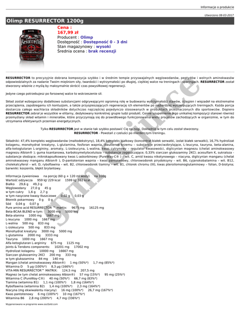 Informacje o produkcie Utworzono 08-03-2017 Olimp RESURRECTOR 1200g Cena : 167,99 zł Producent : Olimp Dostępność : Dostępność 0 - 3 dni Stan magazynowy : wysoki Średnia ocena : brak recenzji Jedyne czego potrzebujesz po forsownej walce to wskrzeszenie sił. ju ic e RESURRECTOR to precyzyjnie dobrana kompozycja szybko i w średnim tempie przyswajalnych węglowodanów, peptydów i wolnych aminokwasów odpowiedzialnych za nadanie Twoim mięśniom siły, twardości i wytrzymałości po długiej, ciężkiej walce na treningach i sparingach. RESURRECTOR został stworzony właśnie z myślą by maksymalnie skrócić czas powysiłkowej regeneracji. Skład został wzbogacony dodatkowo substancjami odgrywającymi ogromną rolę w budowaniu wytrzymałości stawów, ścięgien i więzadeł na ekstremalne przeciążenia, zapobieganiu ich kontuzjom, a także przyspieszających regenerację ich elementów po najbardziej wyczerpujących treningach. Każda porcja dostarcza całego wachlarza składników dotychczas najczęściej pojedynczo stosowanych w produktach przeznaczonych dla sportowców. Dopiero RESURRECTOR zebrał je wszystkie w elitarny, dedykowany konkretnej grupie ludzi produkt. Cenne uzupełnienie jego unikalnej kompozycji stanowi również przemyślany skład witamin i minerałów, które przyczyniają się do prawidłowego funkcjonowania wielu procesów zachodzących w organizmie, w tym do utrzymania efektywnych przemian energetycznych. Tylko RESURRECTOR jest w stanie tak szybko postawić Cię na nogi. Dokładnie w tym celu został stworzony. RESURRECTOR - Powstań z czeluści po morderczym treningu. & Składniki: 47,4% kompleks węglowodanów (maltodekstryny), 18,4% kompleks białkowy (koncentrat białek serwatki, izolat białek serwatki), 16,7% hydrolizat kolagenu, monohydrat kreatyny, L-glutamina, fosforan wapnia, dwutlenek krzemu – substancje przeciwzbrylające, L-leucyna, tauryna, beta-alanina, alfa-ketoglutaran L-argininy, aromaty, L-izoleucyna, L-walina, kwas cytrynowy – regulator kwasowości, diglicynian magnezu (chelat aminokwasowy magnezu Albion® ); guma ksantanowa, karboksymetyloceluloza – substancje zagęszczające; 0,33% siarczan glukozaminy 2KCl; acesulfam K, sukraloza substancje słodzące; mikrokapsułkowany kwas L-askorbinowy (PureWay-C® ) – wit. C, amid kwasu nikotynowego – niacyna, diglicynian manganu (chelat aminokwasowy manganu Albion® ), D-pantotenian wapnia – kwas pantotenowy, chlorowodorek pirydoksyny – wit. B6, cyjanokobalamina – wit. B12, cholekalcyferol – wit. D, ryboflawina – wit. B2, chlorowodorek tiaminy – wit. B1, chlorek chromu (III), kwas pteroilomonoglutaminowy – folian, D-biotyna; barwniki: koszenila, błękit brylantowy. gy m Informacja żywieniowa na porcję (60 g + 120 ml wody) na 100g Wartość odżywcza 959 kJ/ 229 kcal 1599 kJ/ 382 kcal Białko 29,6 g 49,3 g Węglowodany 27,0 g 45 g w tym cukry 1,6 g 2,7 g w tym nasycone kwasy tłuszczowe 0,02 g 0,03 g Błonnik pokarmowy 0 g 0 g Sód 0,04 g 0,07 g Pure amino acid RESURRECTOR ™ martix: 9675 mg 16125 mg Beta-BCAA BLEND w tym: 3000 mg 5000 mg Beta-alanina 1000 mg 1667 mg L-leucyna 1000 mg 1667 mg L-walina 500 mg 833 mg L-izoleucyna 500 mg 833 mg Monohydrat kreatyny 3000 mg 5000 mg L-glutamina 2000 mg 3333 mg Tauryna 1000 mg 1667 mg Alfa-ketoglutaran L-argininy 675 mg 1125 mg Joints & Tendons components: 10201 mg 17002 mg Hydrolizat kolagenu 10000 mg 16667 mg Siarczan glukozaminy 2KCl 200 mg 333 mg w tym glukozamina 84 mg 140 mg Mangan (chelat aminokwasowy Albion®) 1 mg (50%*) 1,7 mg (85%*) Witamina D 5 µg (100%*) 8,3 µg (166%*) VITA-MIN RESURRECTOR™ MATRIX: 124,5 mg 207,5 mg Magnez (w tym chelat aminokwasowy Albion®) 57 mg (15%*) 95 mg (25%*) Witamina C (PureWay-C®) 40 mg (50%*) 66,7 mg (83%*) Tiamina (witamina B1) 1,1 mg (100%*) 1,8 mg (164%*) Ryboflawina (witamina B2) 1,4 mg (100%*) 2,3 mg (164%*) Niacyna (mg ekwiwalentu niacyny) 16 mg (100%*) 26,7 mg (167%*) Kwas pantotenowy 6 mg (100%*) 10 mg (167%*) Witamina B6 2,8 mg (200%*) 4,7 mg (336%*) Wygenerowano w programie www.oscGold.com Witamina B12 2,5 µg (100%*) 4,2 µg (168%*) Biotyna 50 µg (100%*) 83,3 µg (167%*) Kwas foliowy 100 µg (50%*) 167 µg (83%*) Chrom 40 µg (100%*) 66,7 µg(167%*) %ZDS - procent realizacji zalecanego dziennego spożycia Sposób użycia: 1 porcja (60 g proszku – 155 jednostek = 4,5 miarki lub 8 płaskich łyżek stołowych rozpuścić w 120 ml wody) 1 raz dziennie bezpośrednio po treningu. Spożyć zaraz po przygotowaniu. gy m » smak: dowolny, tiramisu, forest punch. & Dostępne opcje Olimp RESURRECTOR 1200g ju ic e Nie należy przekraczać zalecanej dziennej porcji do spożycia w ciągu dnia. Suplement diety nie może być stosowany jako substytut zróżnicowanej diety. Zalecany jest zrównoważony sposób żywienia i zdrowy tryb życia.