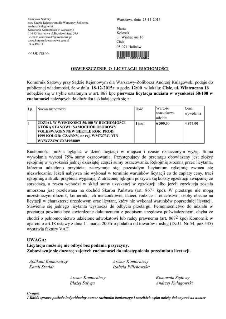 Komornik Sądowy przy Sądzie Rejonowym dla Warszawy-Żoliborza Andrzej Kulągowski Kancelaria Komornicza w Warszawie 01-865 Warszawa ul.Broniewskiego 59A e-mail: [email protected] www.komornik-warszawa.com.pl Km 499/14 Warszawa, dnia 23-11-2015 << ODPIS >> *0020002232658* Maria Kolosek ul. Wiatraczna 16 Cisie 05-074 Halinów OBWIESZCZENIE O LICYTACJI RUCHOMOŚCI Komornik Sądowy przy Sądzie Rejonowym dla Warszawy-Żoliborza Andrzej Kulągowski podaje do publicznej wiadomości, że w dniu 18-12-2015r. o godz. 12:00 w lokalu: Cisie, ul. Wiatraczna 16 odbędzie się w trybie ustalonym w art. 867 kpc pierwsza licytacja udziału w wysokości 50/100 w ruchomości należących do dłużnika i składających się z: Lp. Nazwa ruchomości Ilość 1 UDZIAŁ W WYSOKOŚCI 50/100 W RUCHOMOŚCI KTÓRĄ STANOWI: SAMOCHÓD OSOBOWY VOLKSWAGEN NEW BEETLE ROK PROD. 1999 KOLOR: CZARNY, nr rej. WM7273C, VIN WVWZZZ9CZXM954809 1 [szt.] Wartość szacunkowa udziału 6 500,00 Cena wywołania 4 875,00 Ruchomości można oglądać w dzień licytacji w miejscu i czasie oznaczonym wyżej. Suma wywołania wynosi 75% sumy oszacowania. Przystępujący do przetargu obowiązany jest złożyć rękojmię w wysokości jednej dziesiątej części sumy oszacowania. Rękojmię złożoną przez licytanta, któremu udzielono przybicia, zatrzymuje się; pozostałym licytantom rękojmię zwraca się niezwłocznie. Jeżeli nabywca nie wykonał w terminie warunków licytacji co do zapłaty ceny, traci rękojmię, a skutki przybicia wygasają. Z utraconej rękojmi pokrywa się koszty egzekucji związanej ze sprzedażą, a reszta wchodzi w skład sumy uzyskanej w egzekucji albo jeżeli egzekucja została umorzona jest przelewana na dochód Skarbu Państwa (art. 8671 kpc). W przetargu nie mogą uczestniczyć: dłużnik, komornik, ich małżonkowie, dzieci, rodzice i rodzeństwo, osoby obecne na licytacji w charakterze urzędowym oraz licytant, który nie wykonał warunków poprzedniej licytacji. Stawienie się jednego licytanta wystarcza do odbycia przetargu. Pełnomocnictwo do udziału w przetargu powinno być stwierdzone dokumentem z podpisem urzędowo poświadczonym, chyba że chodzi o pełnomocnictwo udzielone adwokatowi lub radcy prawnemu (art. 8672 kpc) Komornik w oparciu o art.18 ustawy z dnia 11 marca 2004r o podatku od towarów i usług (Dz.U. Nr 54, poz.535) wystawia faktury VAT. UWAGA: Licytacja może się nie odbyć bez podania przyczyny. Zobowiązuje się dozorcę zajętych ruchomości do udostępnienia przedmiotu licytacji. Aplikant Komorniczy Kamil Szmidt Asesor Komorniczy Izabela Pilichowska Asesor Komorniczy Błażej Sałyga Komornik Sądowy Andrzej Kulągowski Uwaga! 1.Każda sprawa posiada indywidualny numer rachunku bankowego i wszelkich wplat należy dokonywać na numer konta przypisany do konkretnej sprawy . 2. Jeżeli dłużnik posiada kilka spraw wpłat można dokonywać na dowolne ze wskazanych w pismach kont. 3.Punkt 2 nie dotyczy wpłat zaliczek od wierzycieli . Przyjęcia interesantów poniedziałek 15:00-18:00 czwartek 9:00-12:00 Telefony: 1. sekretariat: 22 498-9696, 22 8397125, 2. Kmp: 22 4231142, 3. Kms: 22 4231350, 4. Km: 22 4231143, 22 4231349, 5. nieruchomości: 22 3945149 Fax 22 8694792 w/w telefony czynne są codziennie w godz. 12:00 - 14:00. 5. Kontakt drogą elektroniczną dla spraw alimentacyjnych : [email protected], dla spraw KMS : [email protected] Adresat oryginału: Sąd Rejonowy w Mińsku Mazowieckim Oddział Administracyjny Do wiadomości: 1. Maria Kolosek, Cisie, 05-074 Halinów 2. Jacek Kolosek prow. dział. gosp. KOLOSEK JACEK "HYDBUD", Cisie, 05-074 Halinów 3. Adwokat Paweł Stefaniuk Stefaniuk i Partnerzy Spółka Partnerska Adwokatów, 20-022 Lublin 4. Katarzyna Kolosek, Cisie, 05-074 Halinów 5. a/a
