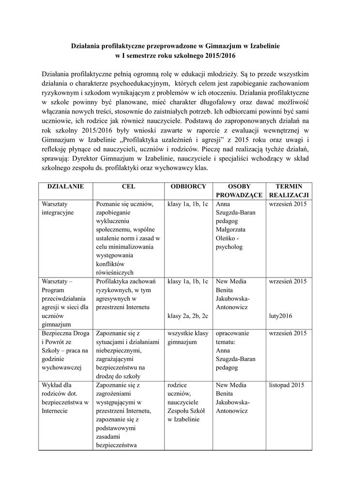 Działania profilaktyczne przeprowadzone w Gimnazjum w Izabelinie w I semestrze roku szkolnego 2015/2016 Działania profilaktyczne pełnią ogromną rolę w edukacji młodzieży. Są to przede wszystkim działania o charakterze psychoedukacyjnym, których celem jest zapobieganie zachowaniom ryzykownym i szkodom wynikającym z problemów w ich otoczeniu. Działania profilaktyczne w szkole powinny być planowane, mieć charakter długofalowy oraz dawać możliwość włączania nowych treści, stosownie do zaistniałych potrzeb. Ich odbiorcami powinni być sami uczniowie, ich rodzice jak również nauczyciele. Podstawą do zaproponowanych działań na rok szkolny 2015/2016 były wnioski zawarte w raporcie z ewaluacji wewnętrznej w Gimnazjum w Izabelinie „Profilaktyka uzależnień i agresji” z 2015 roku oraz uwagi i refleksję płynące od nauczycieli, uczniów i rodziców. Pieczę nad realizacją tychże działań, sprawują: Dyrektor Gimnazjum w Izabelinie, nauczyciele i specjaliści wchodzący w skład szkolnego zespołu ds. profilaktyki oraz wychowawcy klas. DZIAŁANIE Warsztaty integracyjne Warsztaty – Program przeciwdziałania agresji w sieci dla uczniów gimnazjum Bezpieczna Droga i Powrót ze Szkoły – praca na godzinie wychowawczej Wykład dla rodziców dot. bezpieczeństwa w Internecie CEL ODBIORCY Poznanie się uczniów, zapobieganie wykluczeniu społecznemu, wspólne ustalenie norm i zasad w celu minimalizowania występowania konfliktów rówieśniczych Profilaktyka zachowań ryzykownych, w tym agresywnych w przestrzeni Internetu klasy 1a, 1b, 1c klasy 1a, 1b, 1c OSOBY TERMIN PROWADZĄCE REALIZACJI Anna wrzesień 2015 Szugzda-Baran pedagog Małgorzata Oleńko psycholog New Media Benita JakubowskaAntonowicz klasy 2a, 2b, 2c Zapoznanie się z sytuacjami i działaniami niebezpiecznymi, zagrażającymi bezpieczeństwu na drodzę do szkoły Zapoznanie się z zagrożeniami występującymi w przestrzeni Internetu, zapoznanie się z podstawowymi zasadami bezpieczeństwa wrzesień 2015 luty2016 wszystkie klasy gimnazjum opracowanie tematu: Anna Szugzda-Baran pedagog wrzesień 2015 rodzice uczniów, nauczyciele Zespołu Szkół w Izabelinie New Media Benita JakubowskaAntonowicz listopad 2015 Warsztaty dot. profilaktyki uzależnień Diagnoza klas 1Inteligencje Wielorakie Warsztat dla nauczycieli w ramach projektu „Szkoła bez przemocy” Konkurs dla uczniów gimnazjum dot. działań profilaktycznych Program „Trzymaj formę” korzystania z aplikacji internetowych Poznanie mechanizmów stojących za uzależnieniem od nikotyny i dopalaczy oraz prezentacja zachowań chroniących przed uzależnieniem Poznanie umiejętności, typów inteligencji dominujących u uczniów, zapobieganie problemom edukacyjnym i społecznym uczniów Rozpoznawanie agresji i przemocy w relacjach rówieśniczych uczniów, zapobieganie powstawania procesu przemocy, trening umiejętności rozwiązywania konfliktów, mediacji oraz interwencji w przypadku przemocy Poznanie mechanizmów stojących za problemami: uzależnieniem od nikotyny, dopalaczy, uzależnieniem od alkoholu, zagrażającymi działaniami w Internecie. Przygotowanie prezentacji o zagrożeniach dla uczniów klas 5 i 6 szkoły podstawowej Profilaktyka zdrowego trybu życia: zbilansowanego odżywania i aktywności fizycznej klasy 1a, 1b, 1c 3b, 3c, 3d WPE Witold Pawliczuk październiklistopad 2015 klasy 1a, 1b, 1c Anna Szugzda-Baran pedagog październik 2015 styczeń 2016 (prezentacja wyników w klasach) Listopad 2015 nauczyciele Zespołu Szkół w Izabelinie Pracownia Edukacji PsychologicznejEwa CzemierowskaKoruba uczniowie gimnazjum zespół ds. profilaktyki listopad – grudzień 2015 Uczennice klas 1a,1b,1c Olga Shpomer Anna Ordon rozpoczęcie projektupaździernik 2015