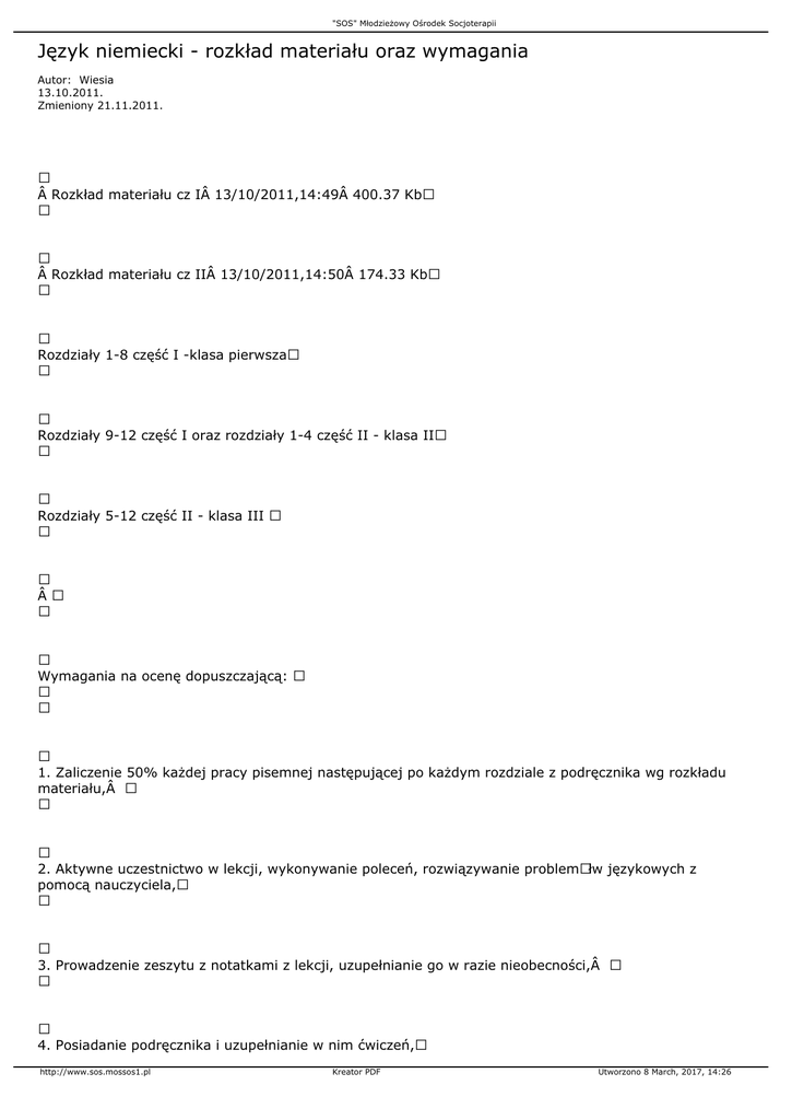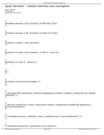 "SOS" Młodzieżowy Ośrodek Socjoterapii Język niemiecki - rozkład materiału oraz wymagania Autor: Wiesia 13.10.2011. Zmieniony 21.11.2011.  Rozkład materiału cz I 13/10/2011,14:49 400.37 Kb  Rozkład materiału cz II 13/10/2011,14:50 174.33 Kb Rozdziały 1-8 część I -klasa pierwsza Rozdziały 9-12 część I oraz rozdziały 1-4 część II - klasa II Rozdziały 5-12 część II - klasa III  Wymagania na ocenę dopuszczającą: 1. Zaliczenie 50% każdej pracy pisemnej następującej po każdym rozdziale z podręcznika wg rozkładu materiału, 2. Aktywne uczestnictwo w lekcji, wykonywanie poleceń, rozwiązywanie problemÃłw językowych z pomocą nauczyciela, 3. Prowadzenie zeszytu z notatkami z lekcji, uzupełnianie go w razie nieobecności, 4. Posiadanie podręcznika i uzupełnianie w nim ćwiczeń, http://www.sos.mossos1.pl Kreator PDF Utworzono 8 March, 2017, 14:26 "SOS" Młodzieżowy Ośrodek Socjoterapii 5. W przypadku dłuższej nieobecności na lekcji oraz kłopotÃłw w nauce uczestnictwo w zajęciach rewalidacyjnych, 6. Odrabianie pracy domowej (min. 50%), 7. Zaliczenie w min. 50% niezapowiedzianych kartkÃłwek.    http://www.sos.mossos1.pl Kreator PDF Utworzono 8 March, 2017, 14:26